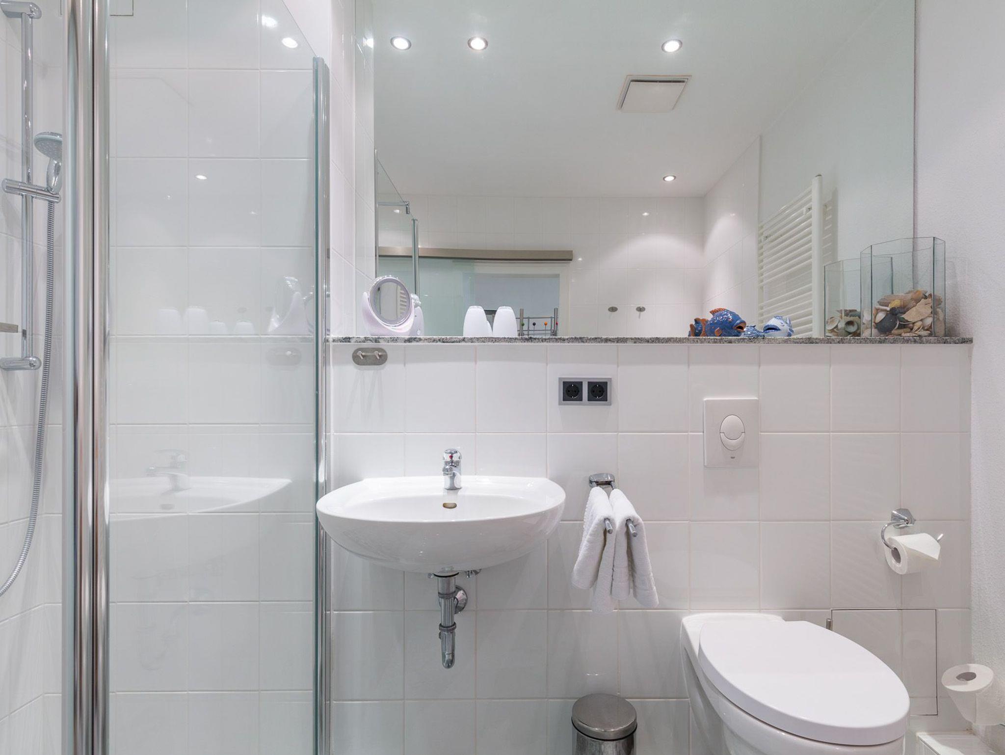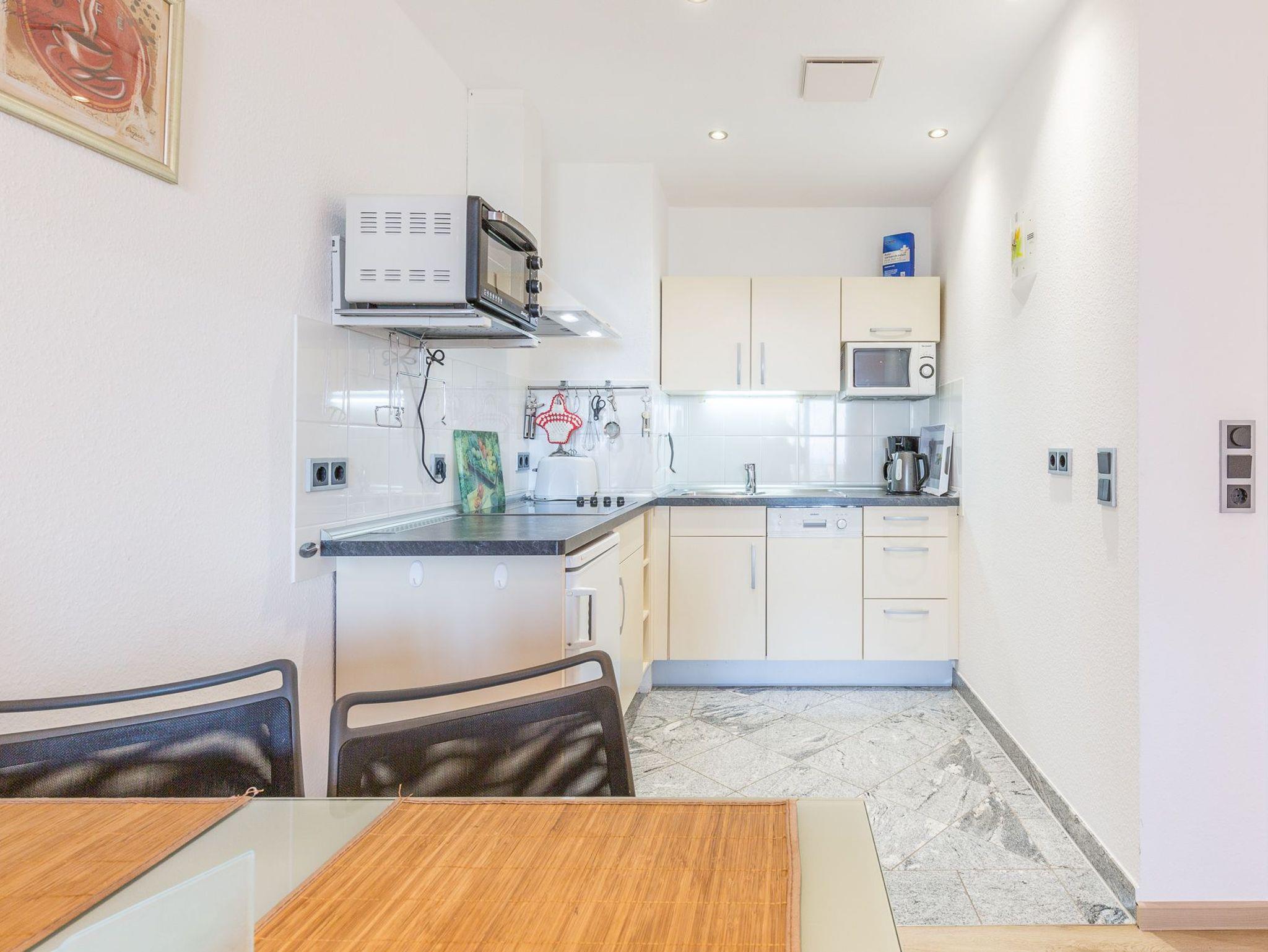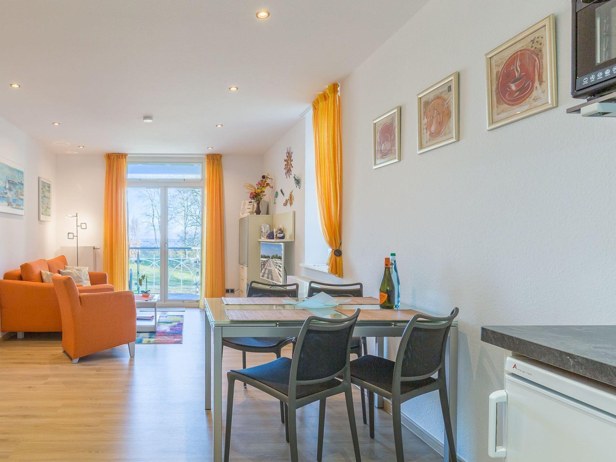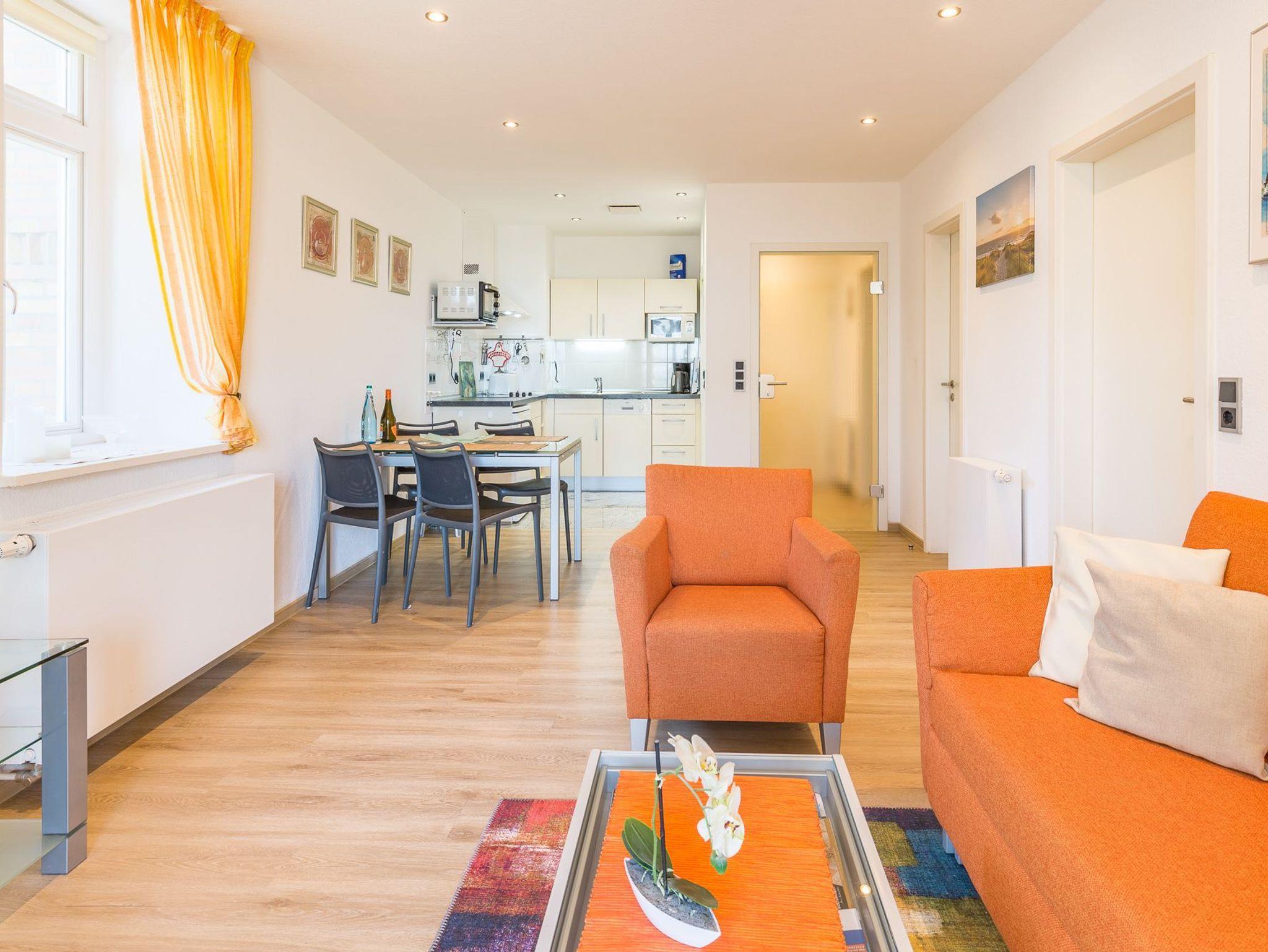 Die Ferienwohnung 7 liegt im 1. Obergeschoss zur Seeseite mit wunderschönem freien Meeresblick und ist 45 qm groß. Sie ist modern und mit hochwertigen Möbeln ausgestattet und verfügt über eine komfortable Küchenzeile mit Herd, Geschirrspülmaschine und Mikrowelle sowie ein Bad mit Waschbecken, ebenerdiger Dusche und WC.
