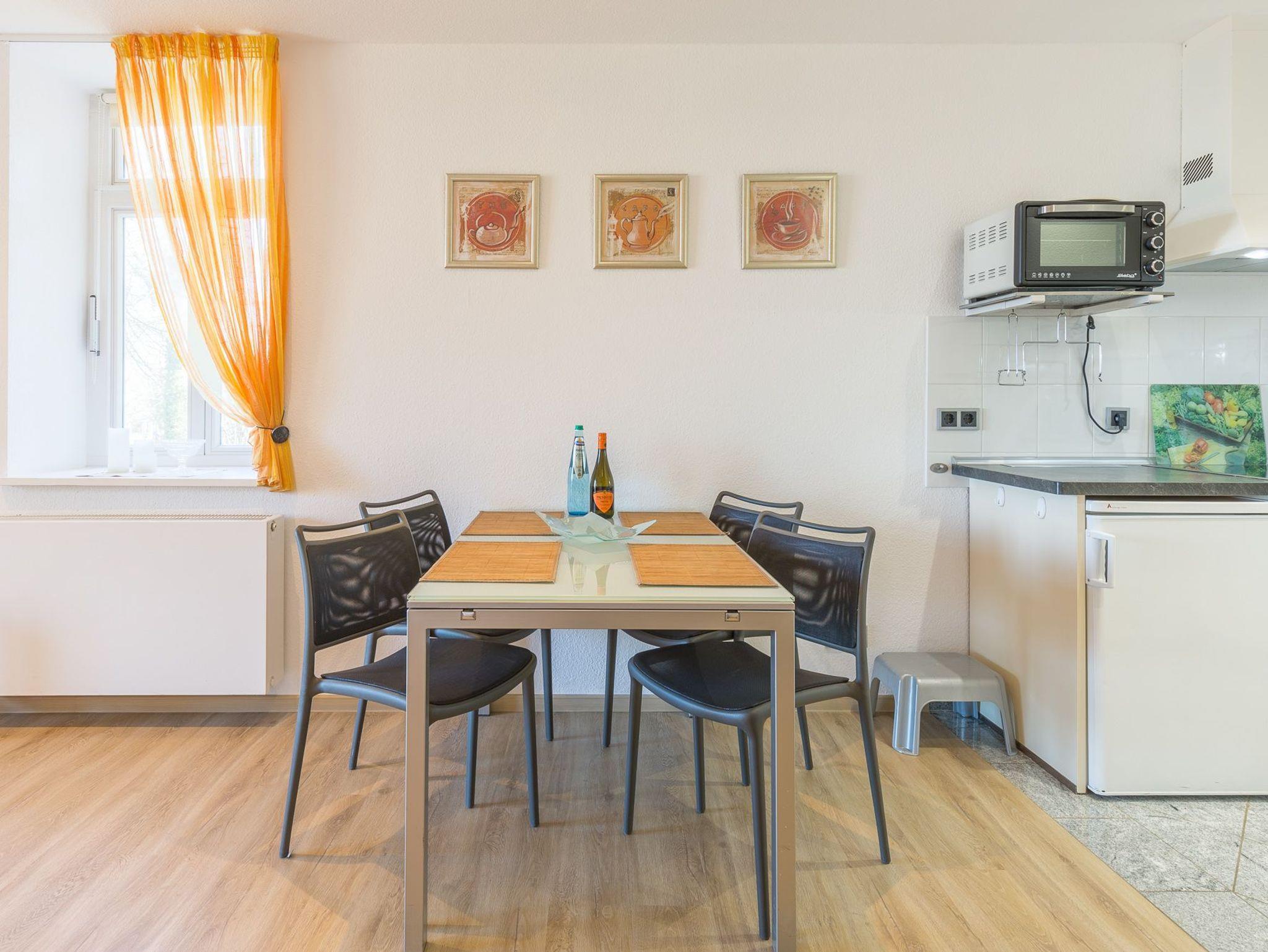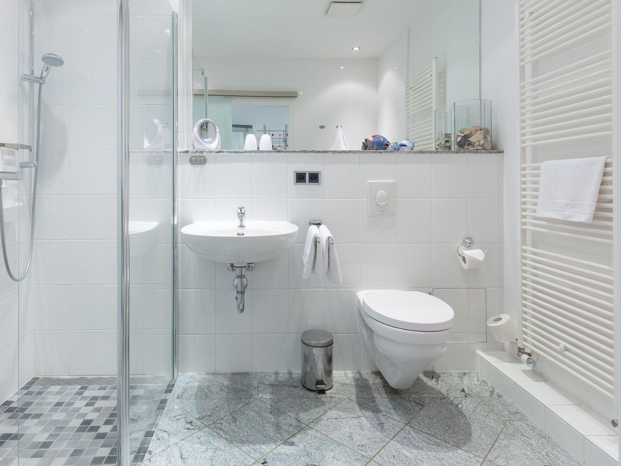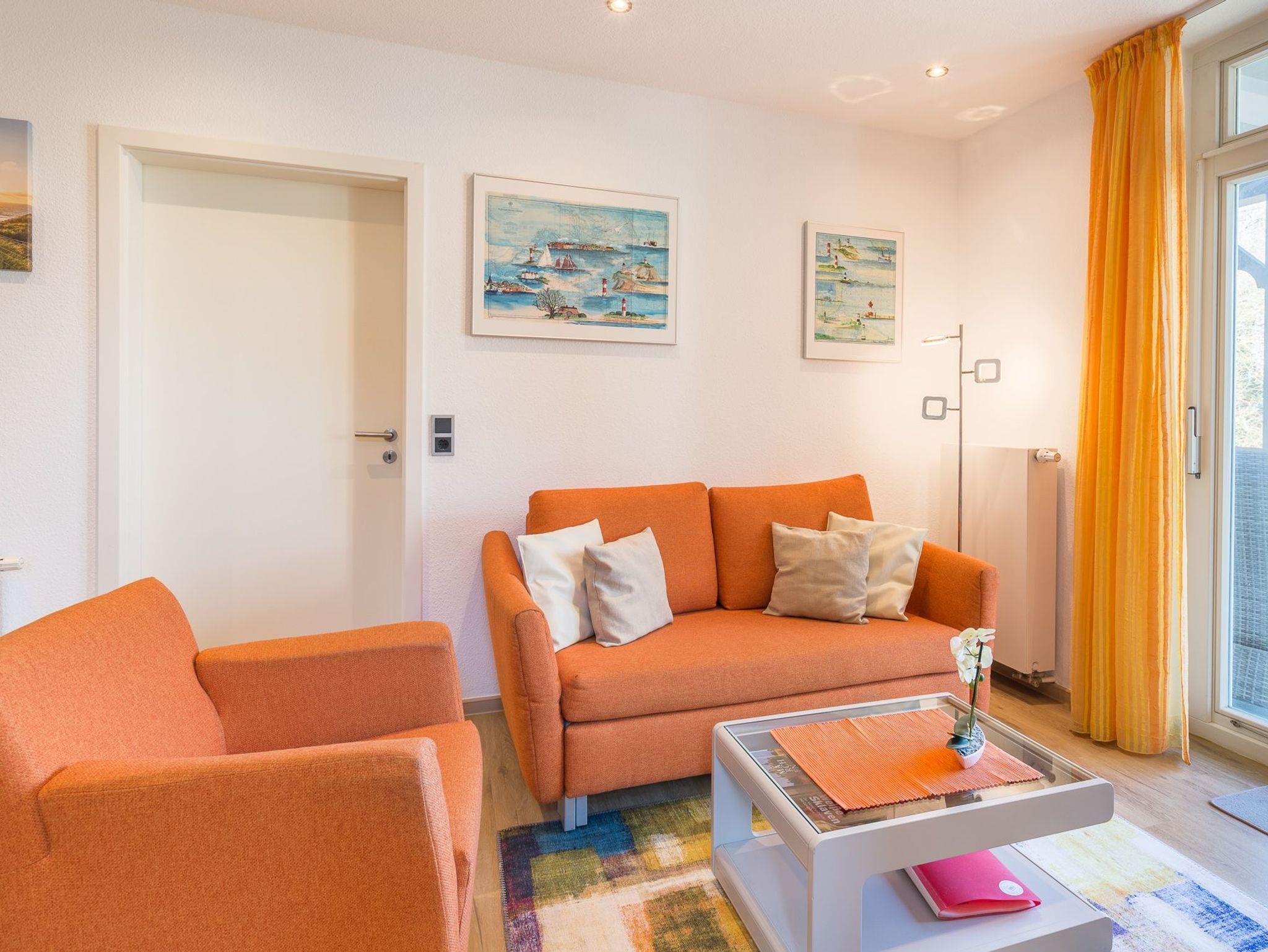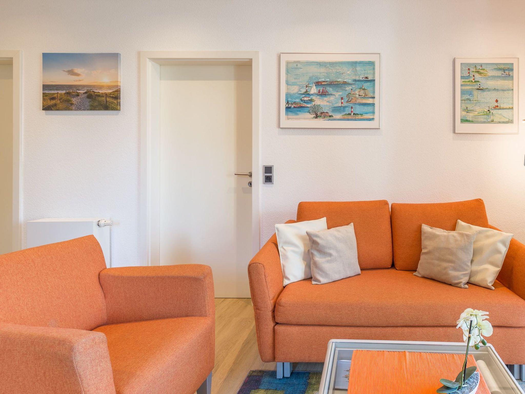 Die Ferienwohnung 7 liegt im 1. Obergeschoss zur Seeseite mit wunderschönem freien Meeresblick und ist 45 qm groß. Sie ist modern und mit hochwertigen Möbeln ausgestattet und verfügt über eine komfortable Küchenzeile mit Herd, Geschirrspülmaschine und Mikrowelle sowie ein Bad mit Waschbecken, ebenerdiger Dusche und WC.
