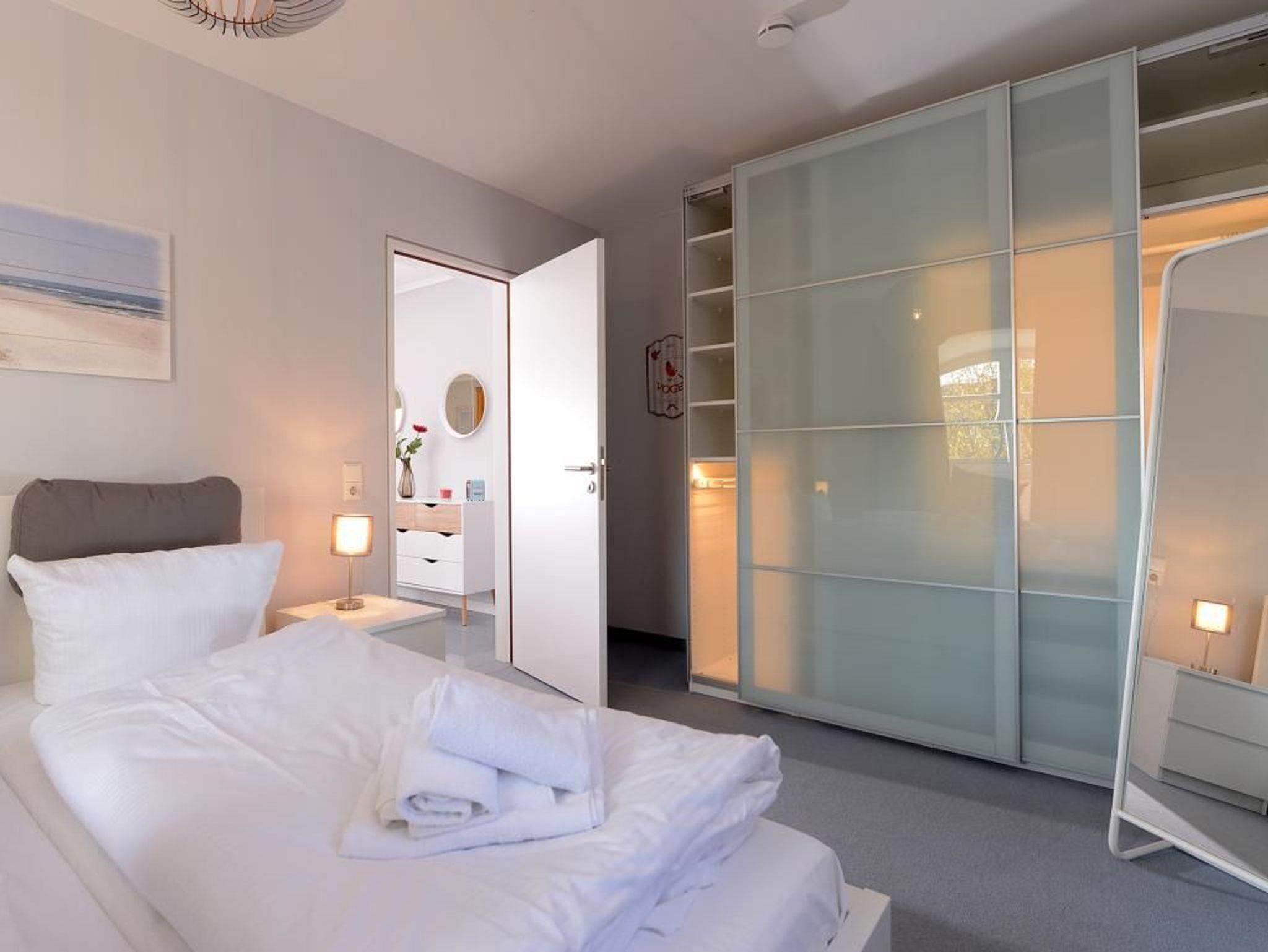 Das 2-Zimmer-Appartement befindet sich in der 1.Etage. Bis zu 4 Personen können hier auf 60 m² Wohnfläche einen unbeschwerten Urlaub verbringen. Die Villa Sonnengarten befindet sich zentrumsnah nur 50 m vom Sandstrand entfernt. Das Appartement verfügt über einen hellen Wohn-/ Essbereich mit Eck-Couch, Fernseher und eine Musikanlage. Von hier aus haben Sie direkten Zugang zum Ost-Balkon. Die integrierte Küche ist modern und unter anderem mit Geschirrspüler, Mikrowelle, Kaffeemaschine, Toaster und diversen Kleingeräten komplett ausgestattet. Das Schlafzimmer ist mit einem Doppelbett und einem großen Kleiderschrank eingerichtet. Des Weiteren steht für Sie ein Duschbad mit Waschmaschine bereit. Insgesamt besticht das Appartement durch liebevoll gewählte Details und der durchdachten stilvollen Einrichtung. Eine Kaution in Höhe von 500 Euro ist am Anreisetag in bar zu hinterlegen.