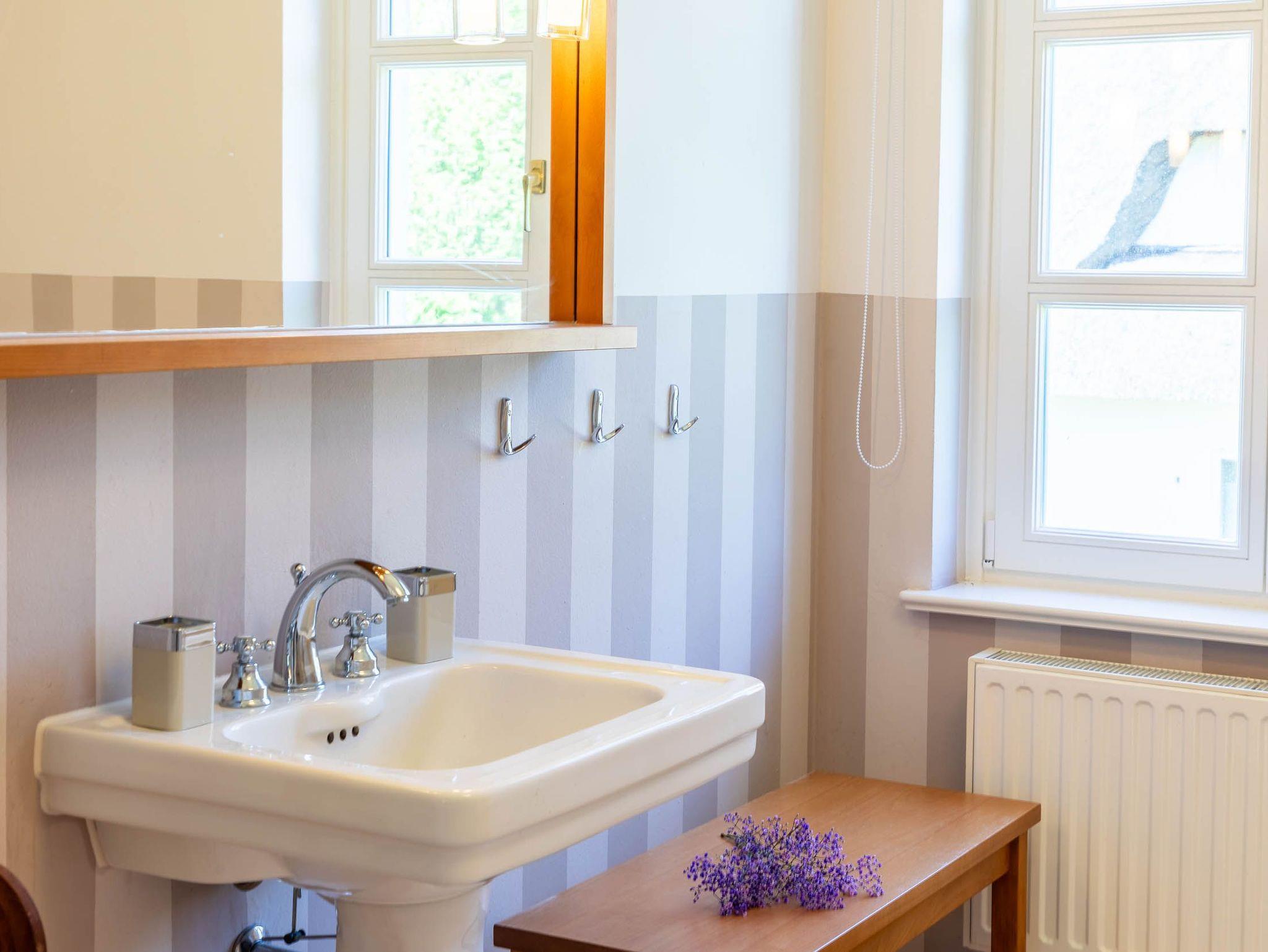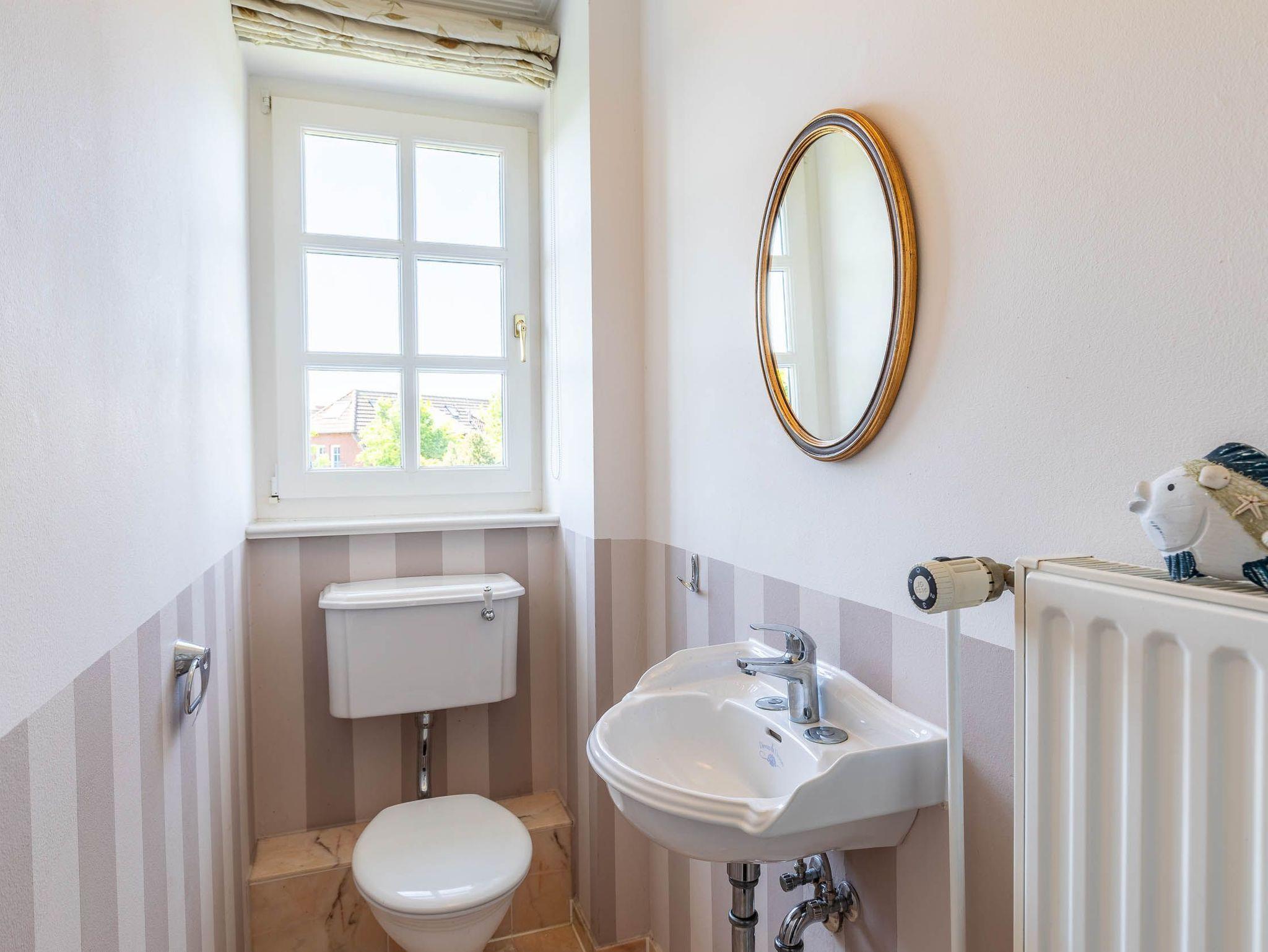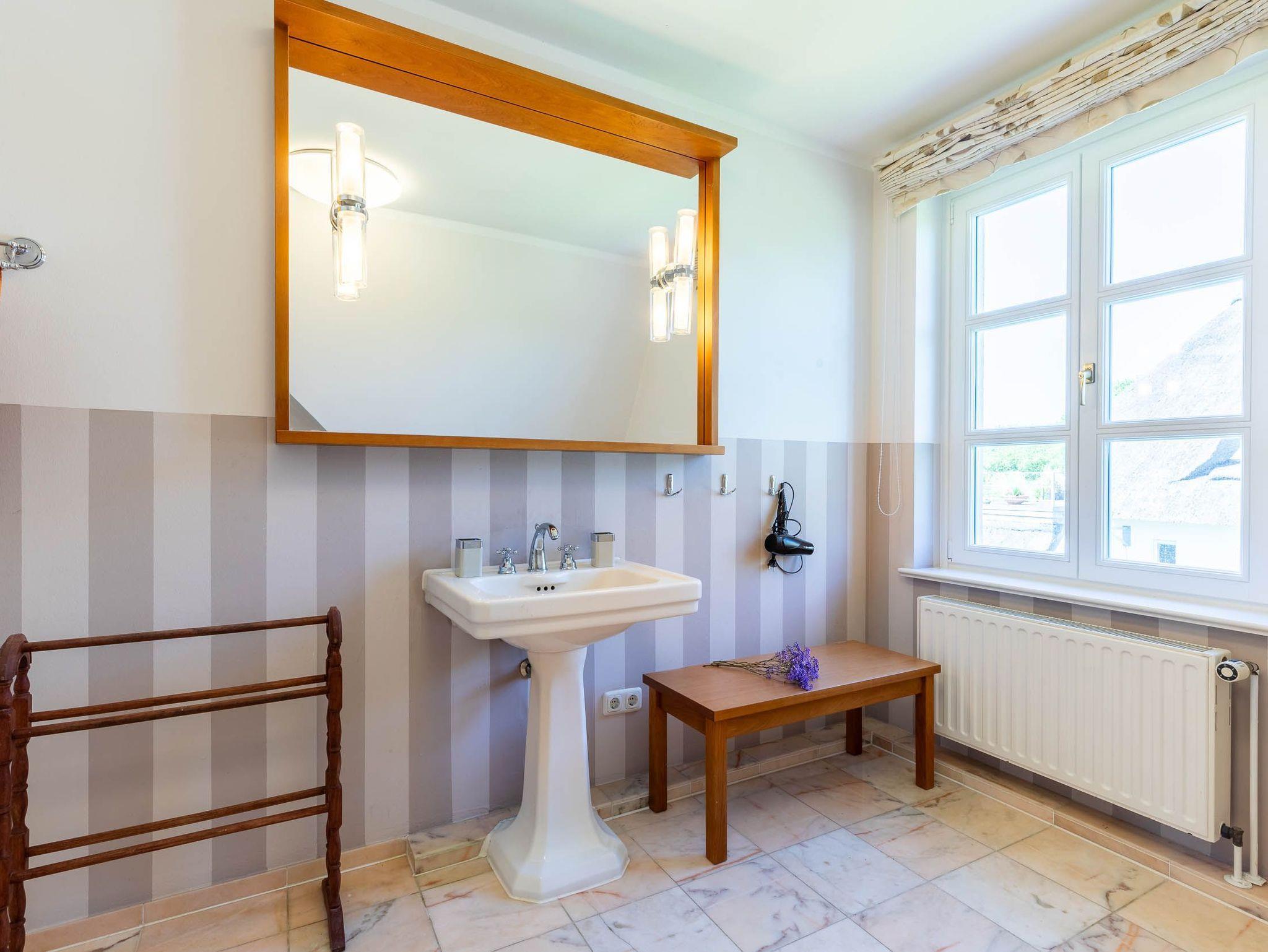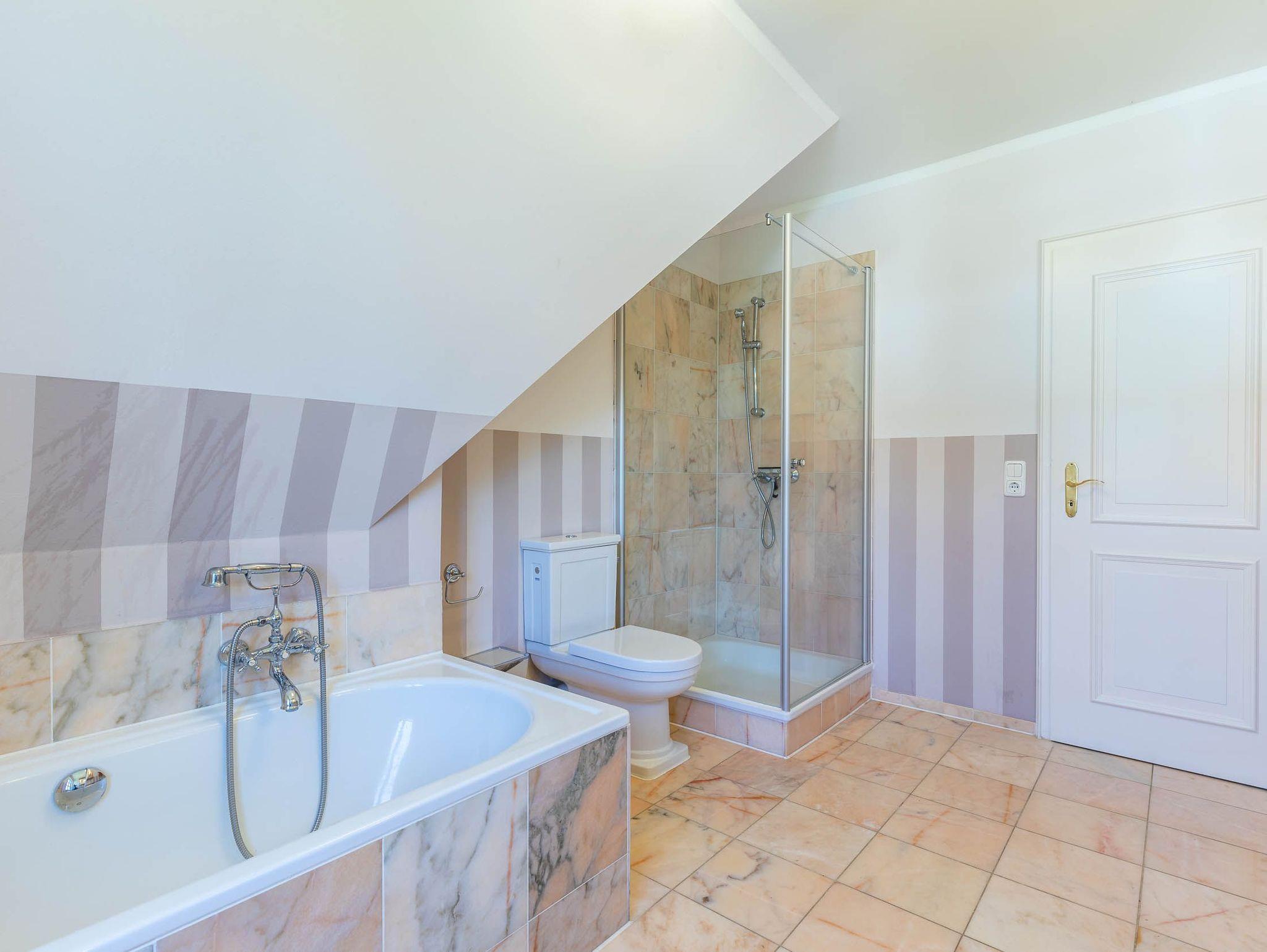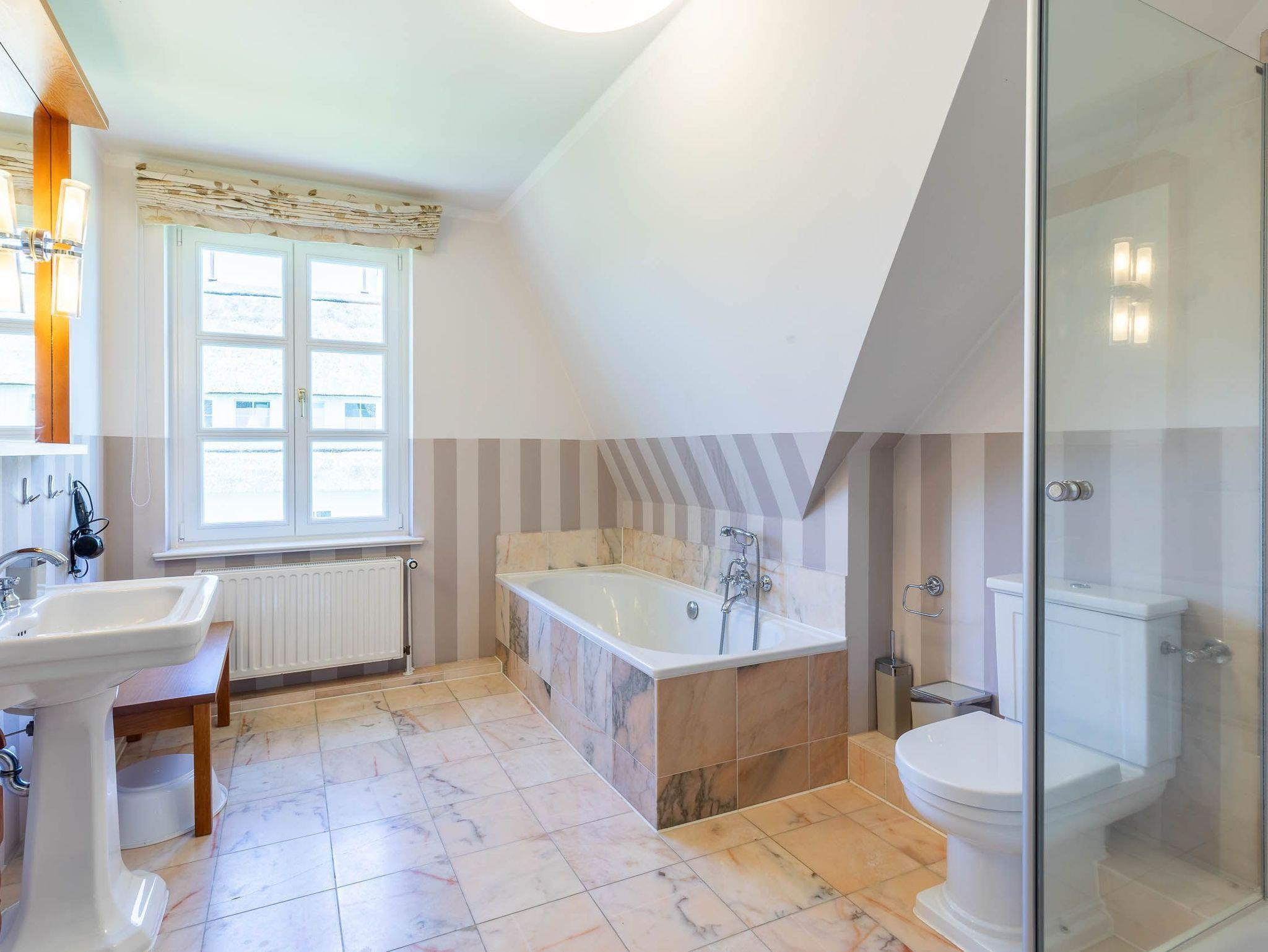 Ein weiteres Highlight ist das große Badezimmer mit Badewanne, Waschtisch und einer Dusche. Ein zusätzliches Gäste-WC erleichtert den Familienurlaub.