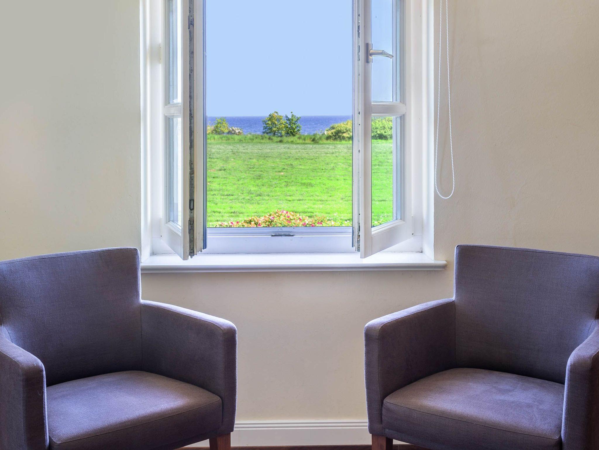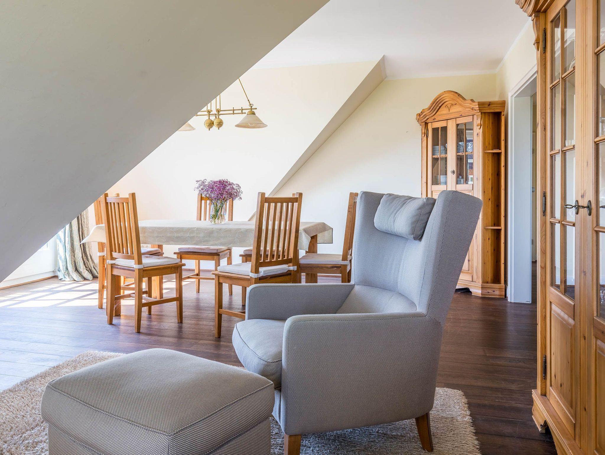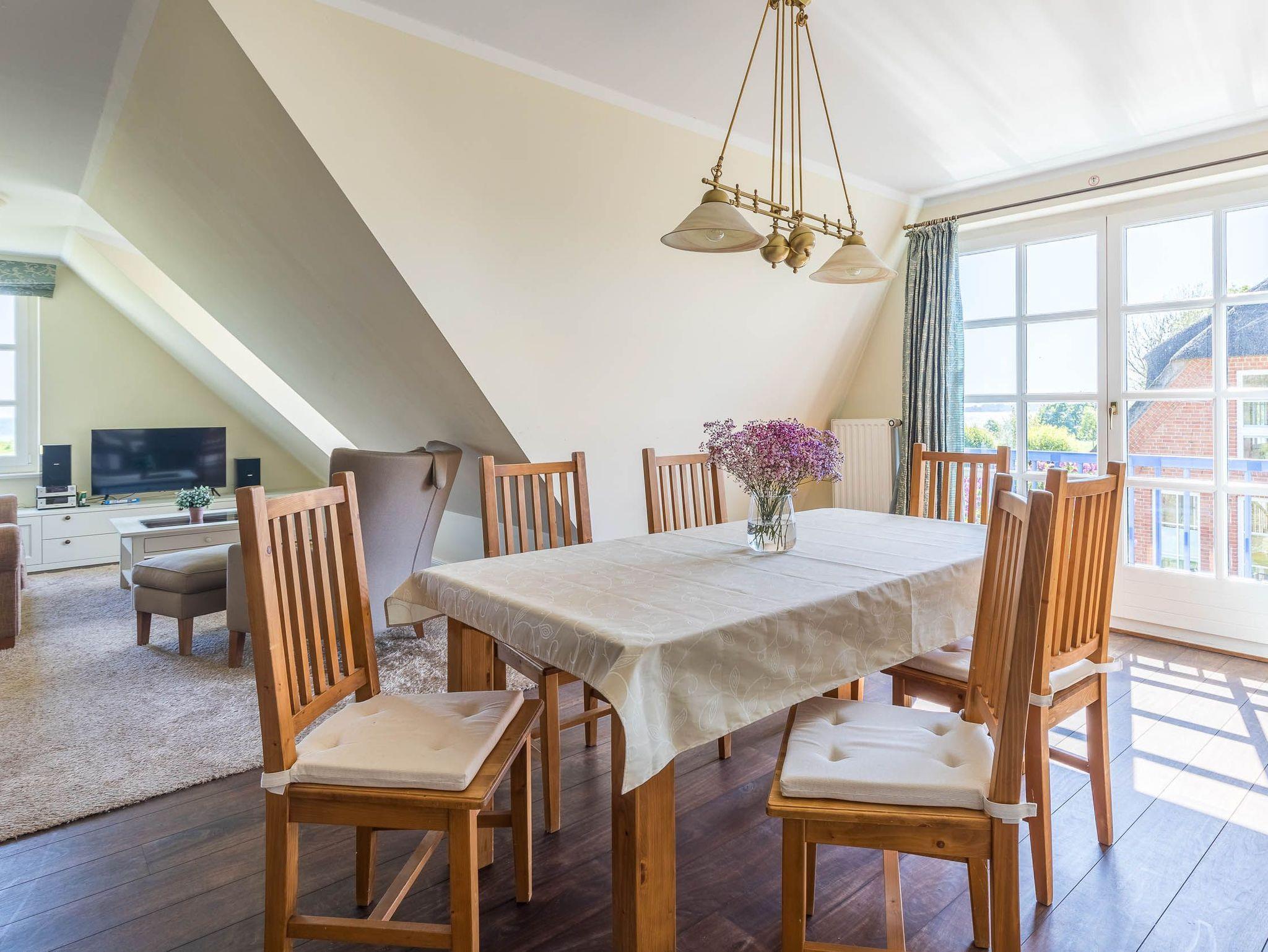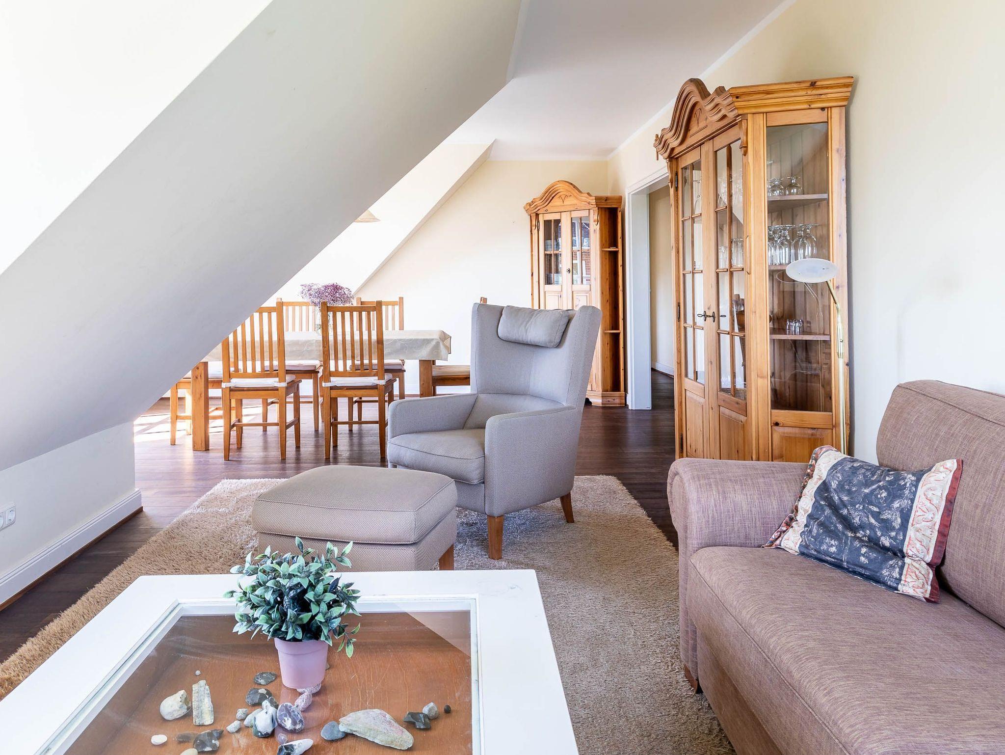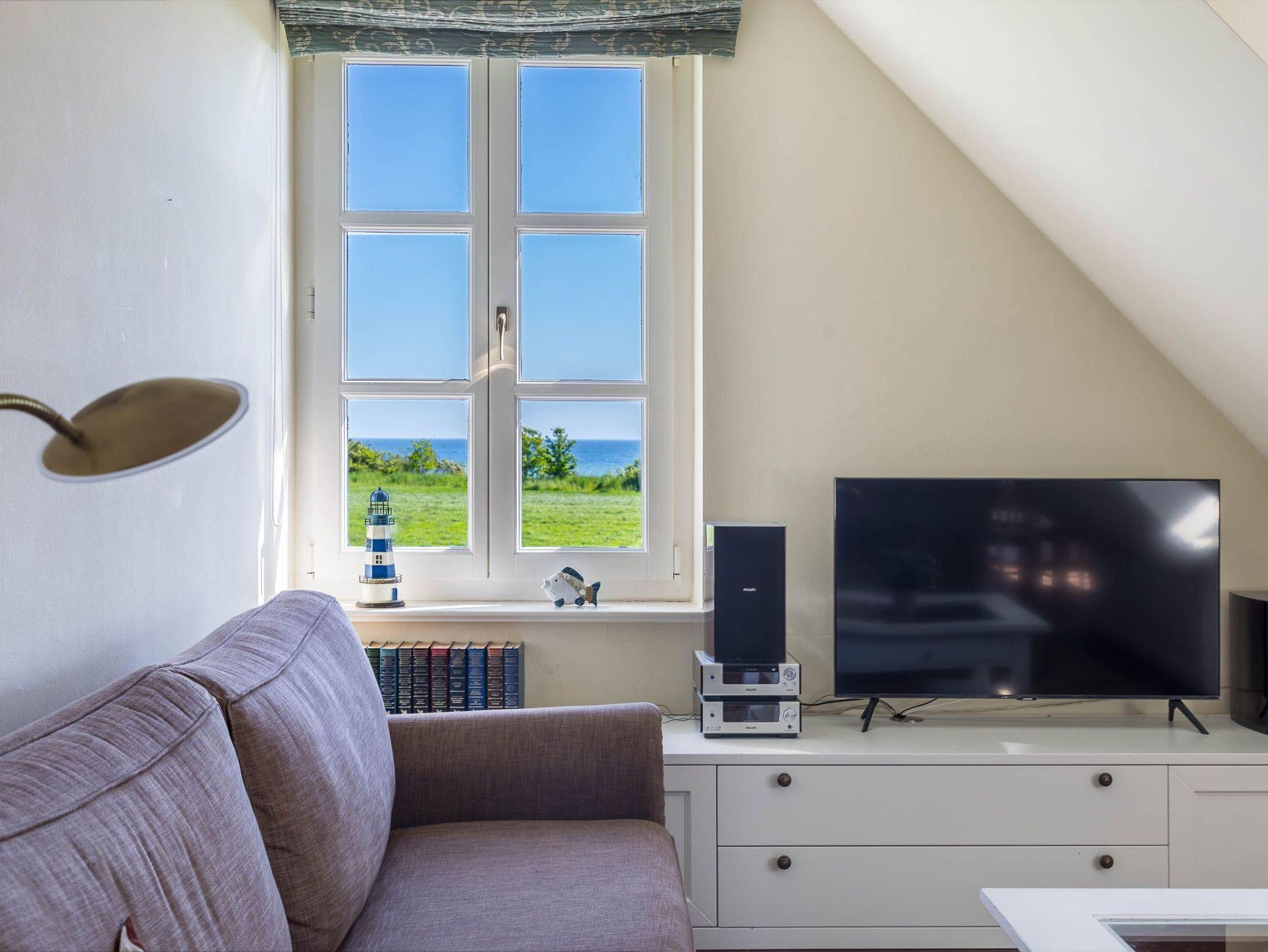 Der Wohnbereich mit angrenzendem Essbereich bietet Ihnen neben SAT-TV, Stereoanlage auch einen großen Esstisch für gemeinsame Essen. Vom Wohnbereich können Sie den Blick auf die Ostsee genießen.