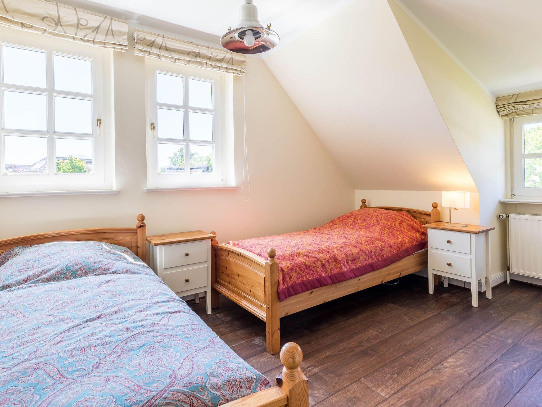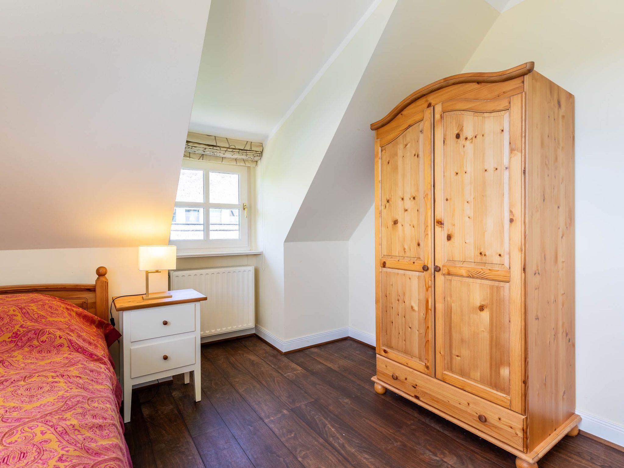 Die Wohnung verfügt über zwei separate Schlafzimmer. Das größte Schlafzimmer ist mit einem Doppelbett, einem festen Holzgitterbett mit Matratze und einem großen Kleiderschrank eingerichtet. Das Gäste-/ Kinderzimmer verfügt über zwei Einzelbetten sowie einem Kleiderschrank.