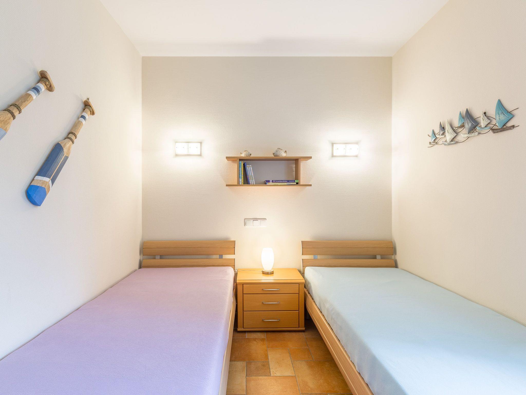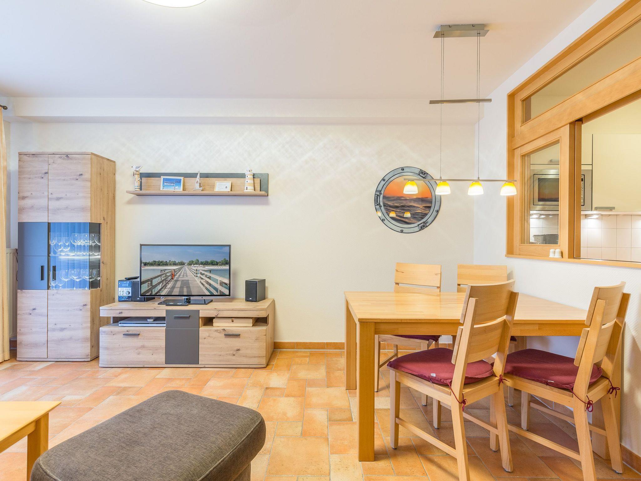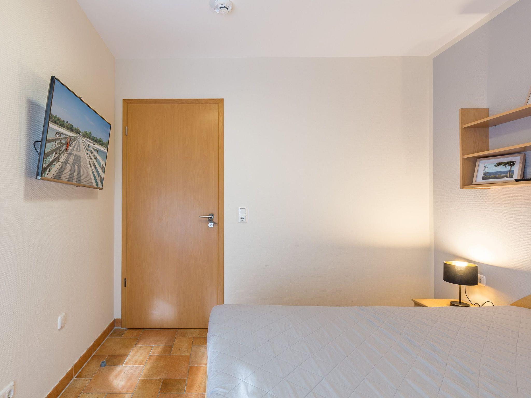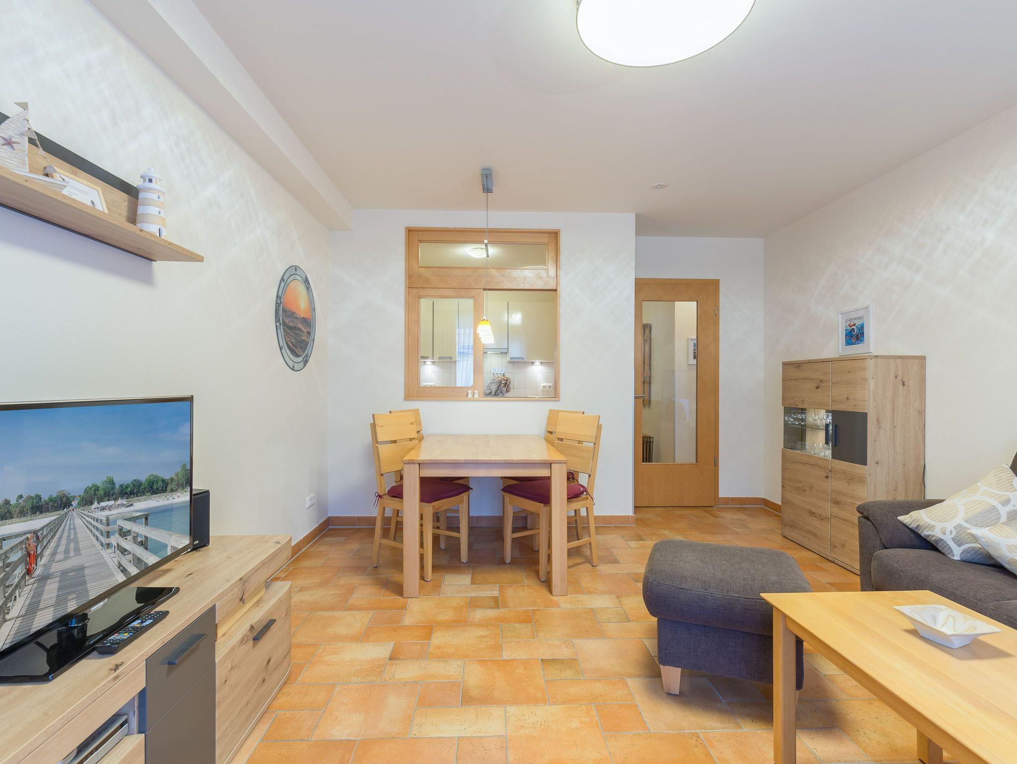 Das Wohnzimmer mit direktem Balkonzugang verfügt über einen Wohnbereich und einen Essbereich neben der Durchreiche zur komplett ausgestatteten separaten Küche mit Geschirrspüler. Der Balkon des Wohnzimmers liegt nach Nordwesten. Das Elternschlafzimmer hat ein Doppelbett und einen eigenen Balkon. Das zweite Schlafzimmer verfügt über 2 vollwertige getrennt stehende Einzelbetten.