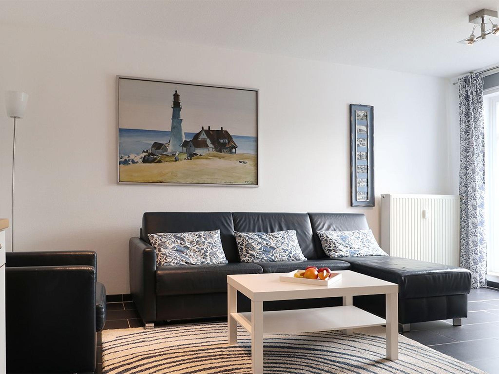 Nur wenige Schritte zum Ostseestrand liegt das 2-Zimmer-Appartement Haffblick 12. Das komfortable Ferienappartement befindet sich im 2. Obergeschoss des Hauses und bietet einen Südbalkon mit Blick über die Wiesenlandschaft. Es empfängt Sie eine sehr geschmackvoll möblierte Ferienwohnung mit einer Wohnfläche von 43qm. Eine Belegung ist mit 2 Personen möglich. Der Wohnbereich ist modern gestaltet und verfügt über eine integrierte Küchenzeile, die mit Ceranfeldherd, Backofen, Mikrowelle, Kühlschrank, Spülmaschine sowie Kaffeemaschine, Toaster und Wasserkocher voll ausgestattet ist. Ihre gemeinsamen Mahlzeiten nehmen Sie an einem Esstisch ein. Die gemütliche Sofagarnitur lässt Sie wunderbar entspannen. Für technische Unterhaltung sorgen ein Flachbildschirm Fernseher sowie eine Musikanlage. WLAN nutzen Sie ebenso wie die Sky Programme kostenfrei. Angenehme Nächte verbringen Sie in dem separaten Schlafzimmer mit Doppelbett. Zugehörig ist ein hell gefliestes Duschbad. Ihren PKW parken Sie kostenlos auf einem reservierten Außenstellplatz direkt am Haus. Bitte beachten Sie, dass es sich um eine Nichtraucherwohnung handelt, in der Haustieren nicht gestattet sind. Allen Gästen der Residenz Haffblick stehen Waschmaschine und Wäschetrockner gegen Gebühr zur Verfügung. Den Wellnessbereich mit Infrarotkabine und Sauna können Sie ebenfalls gegen Gebühr nutzen. Zudem steht allen Hausgästen ein Fitnessbereich zur Verfügung. In nur 200 Meter erreichen Sie den feinsandigen Strand an der Seebrücke.