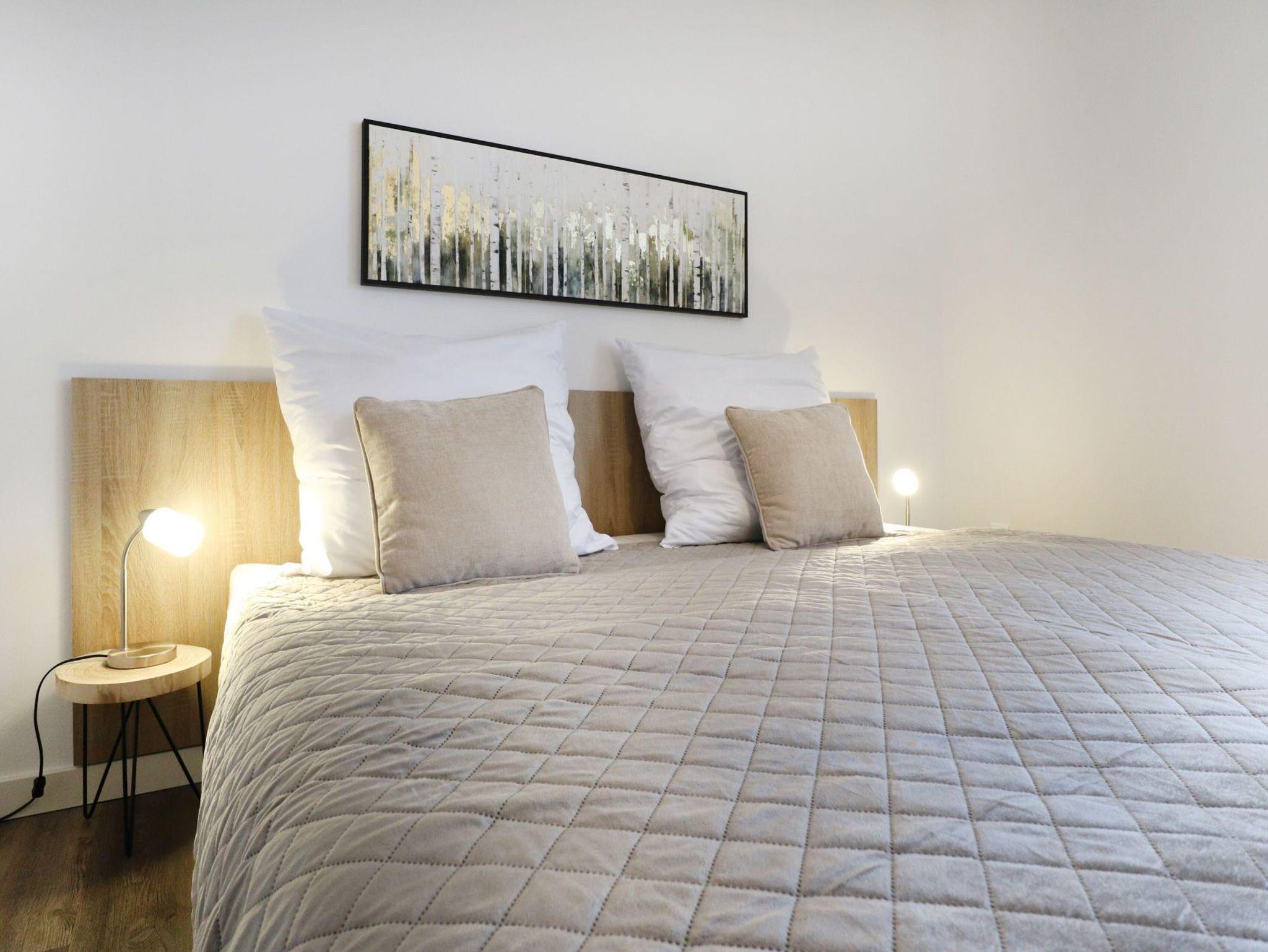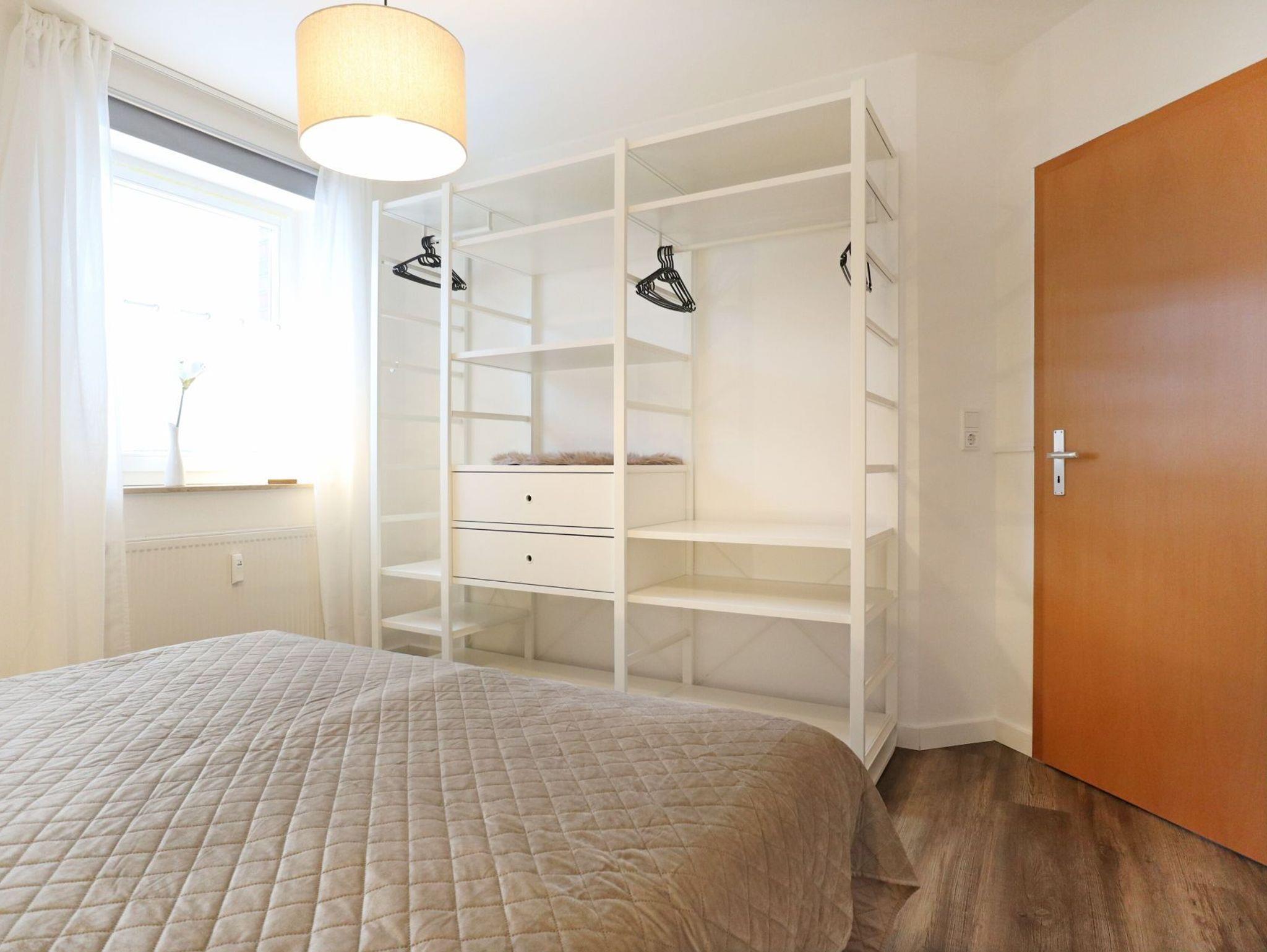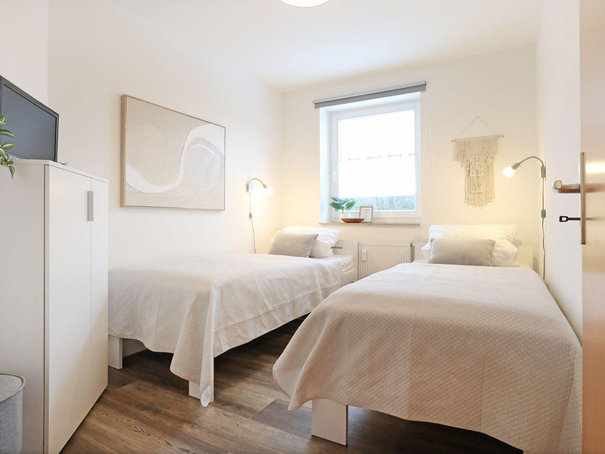 Sehr vorteilhaft bietet das Appartement zwei separate Schlafzimmer. Eines der Schlafzimmer verfügt über ein Doppelbett und eine offene Kleiderablage. Das zweite Schlafzimmer ist mit zwei Einzelbetten, einer Kommode sowie Fernseher mit DVD-Player ausgestattet.