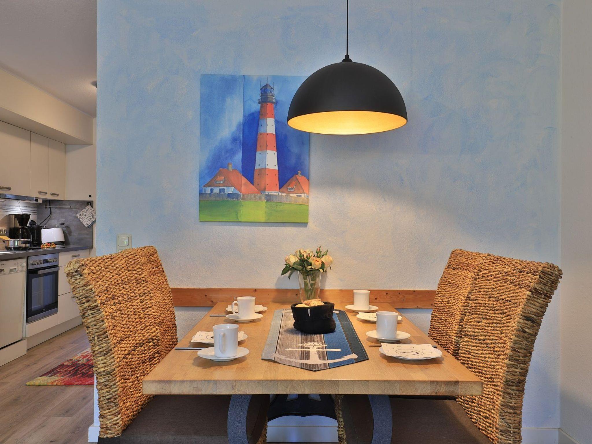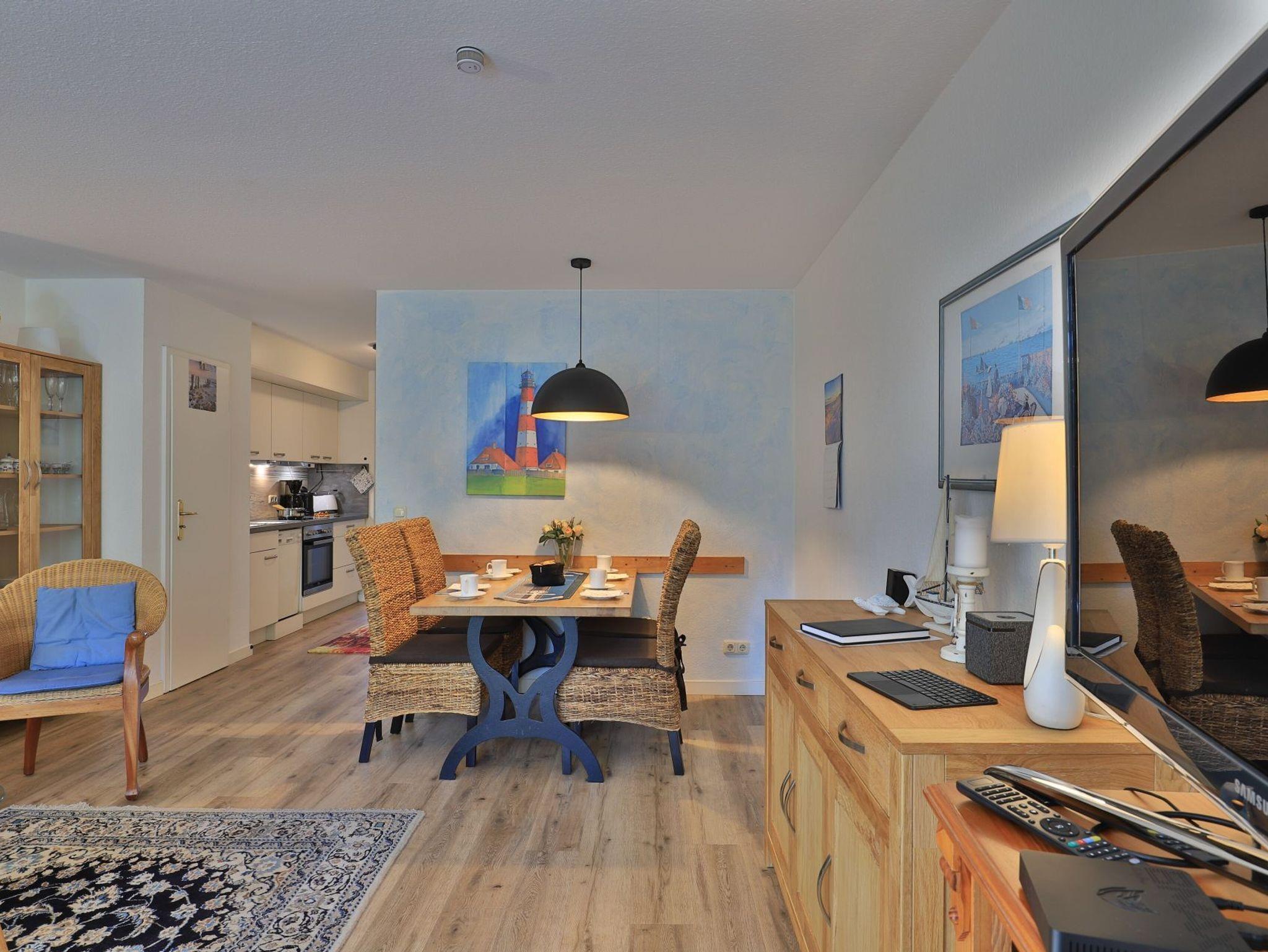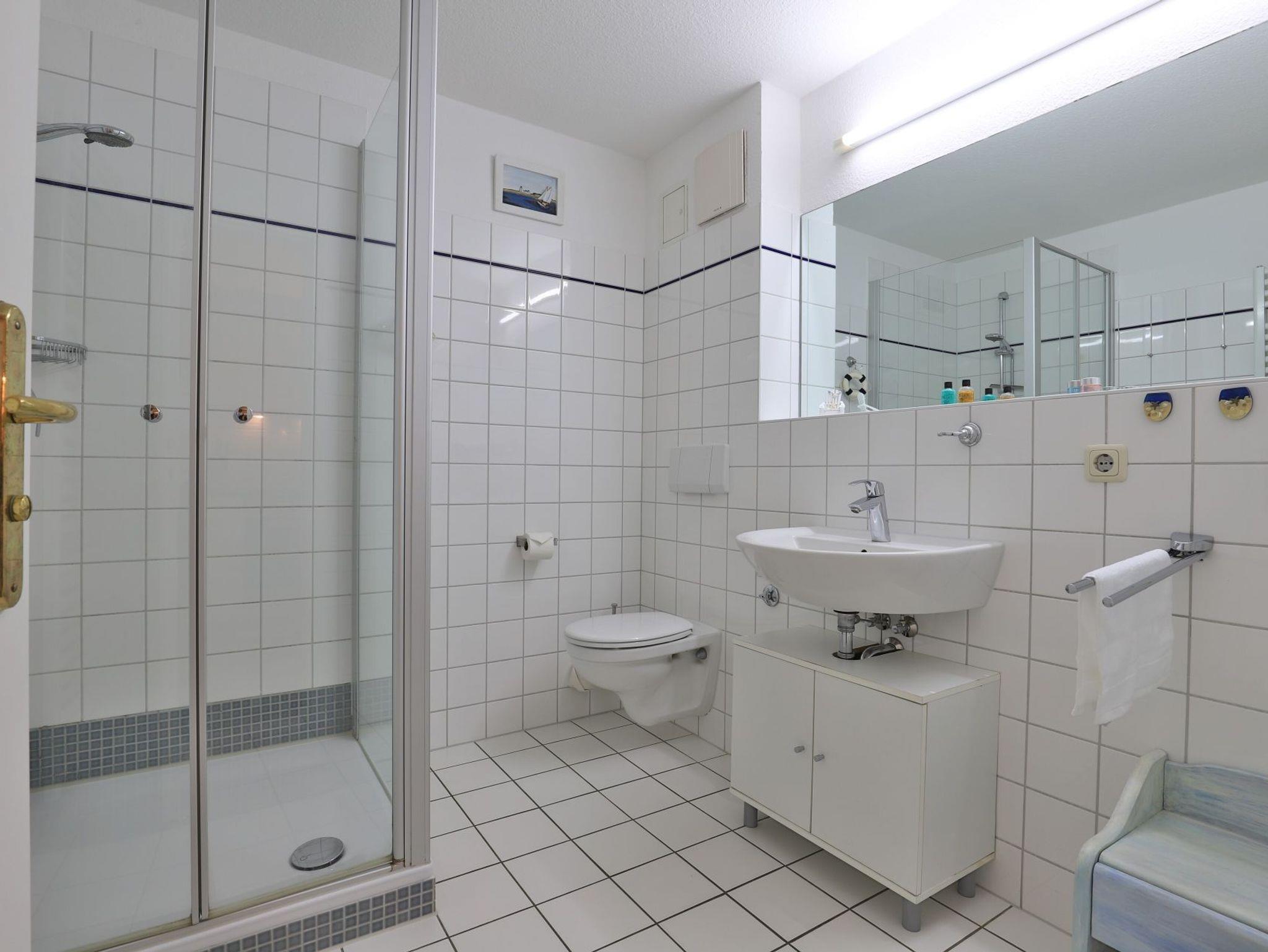 Das innenliegende Duschbad ist geräumig und mit einer niedrigen Duschtasse modernisiert. Für mitgebrachte Fahrräder befindet sich im Kellerbereich ein Abstellraum. Ebenso können dort Waschmaschine und Wäschetrockner gegen Gebühr benutzt werden. Ihr Fahrzeug parken Sie kostenfrei nah des Hauses. In der Nichtraucher Wohnung sind Haustiere herzlich willkommen.