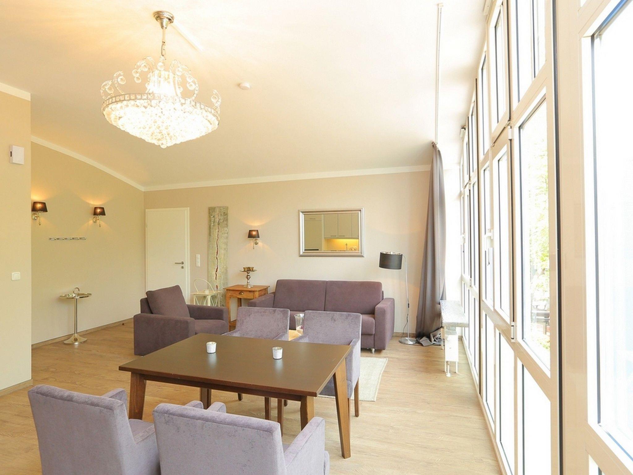 In den lichtdurchfluteten Wohn- und Essbereich ist eine technisch hochwertig bestückte Küchenzeile integriert. Der Raum ist einheitlich und ebenso elegant wie zweckmäßig möbliert. Neben einer gemütlichen Polstergarnitur mit ausziehbarer Couch gibt es einen großzügigen Essplatz. Es stehen Flatscreen-TV und DVD-Player zur Verfügung.