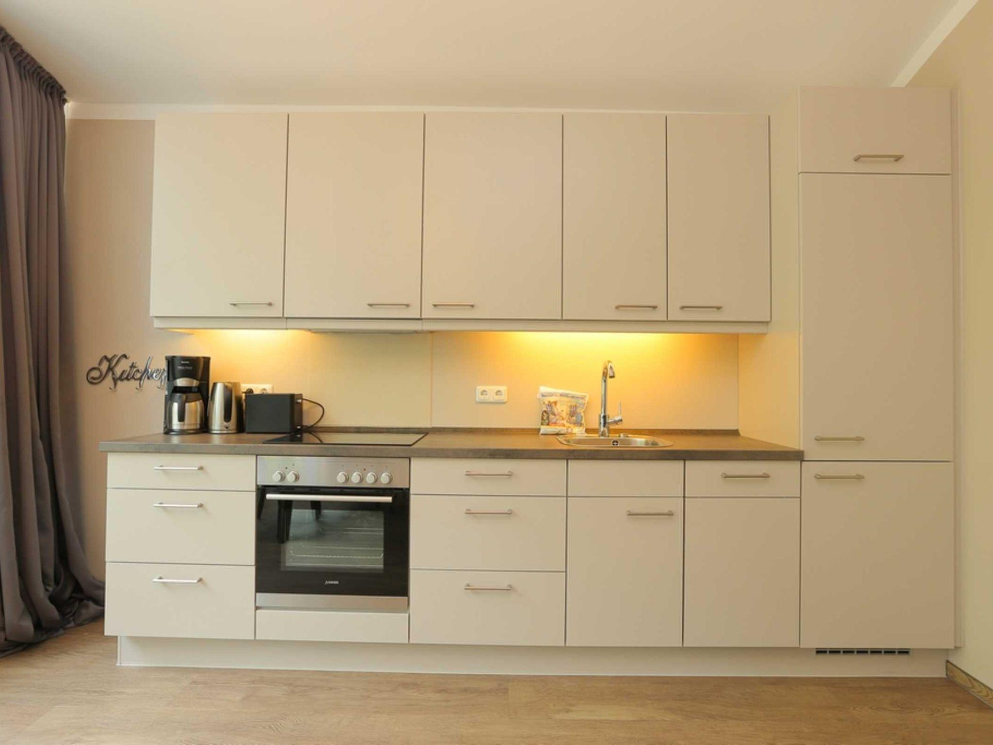 Zur modernen offenen Küchenzeile gehören neben Backofen und Herd mit Cerankochfeld natürlich u.a. auch ein Kühlschrank mit Gefrierfach, Geschirrspüler, Wasserkocher, Toaster, Kaffeemaschine, ausreichend Geschirr, Besteck uvm.
