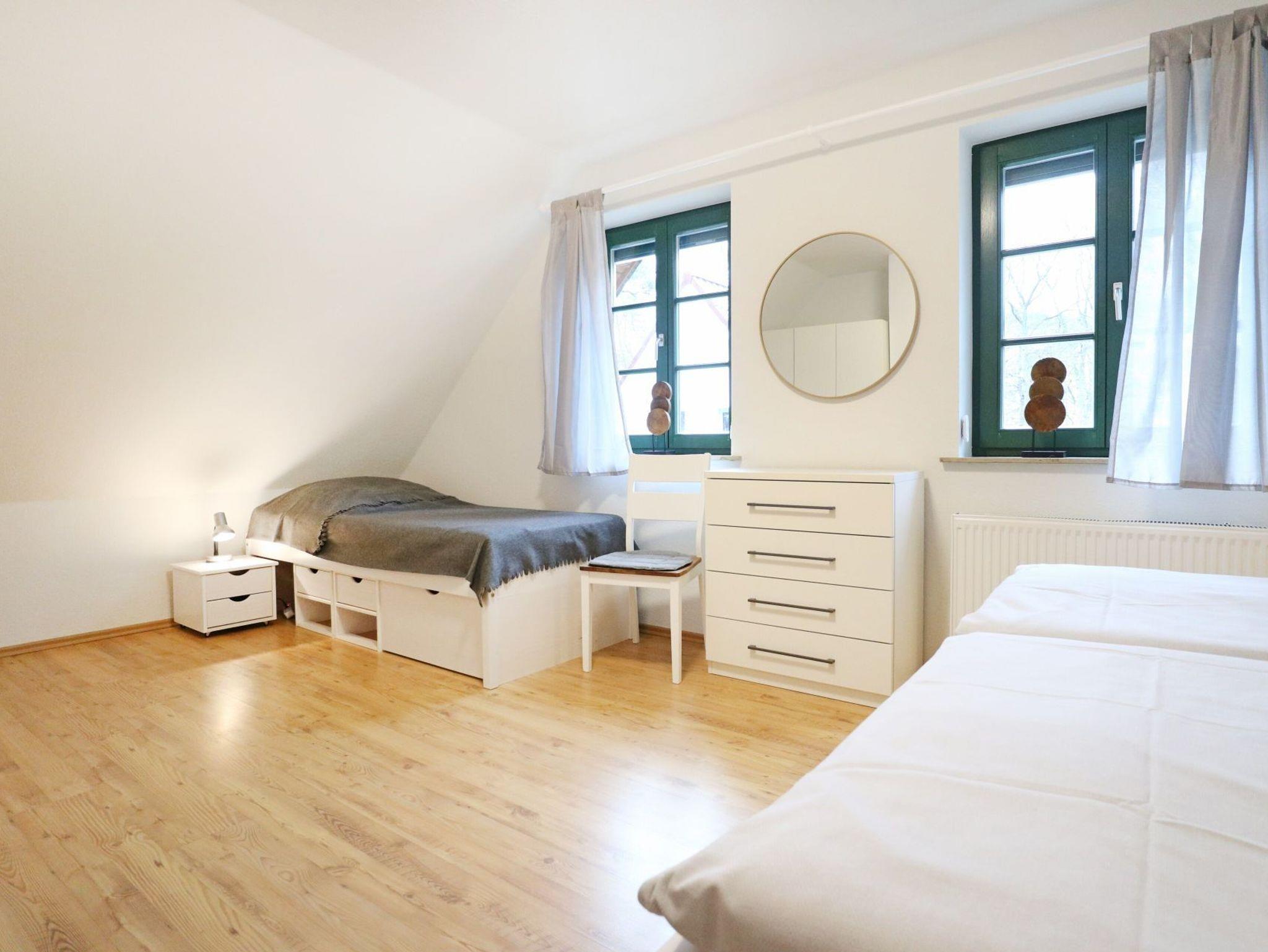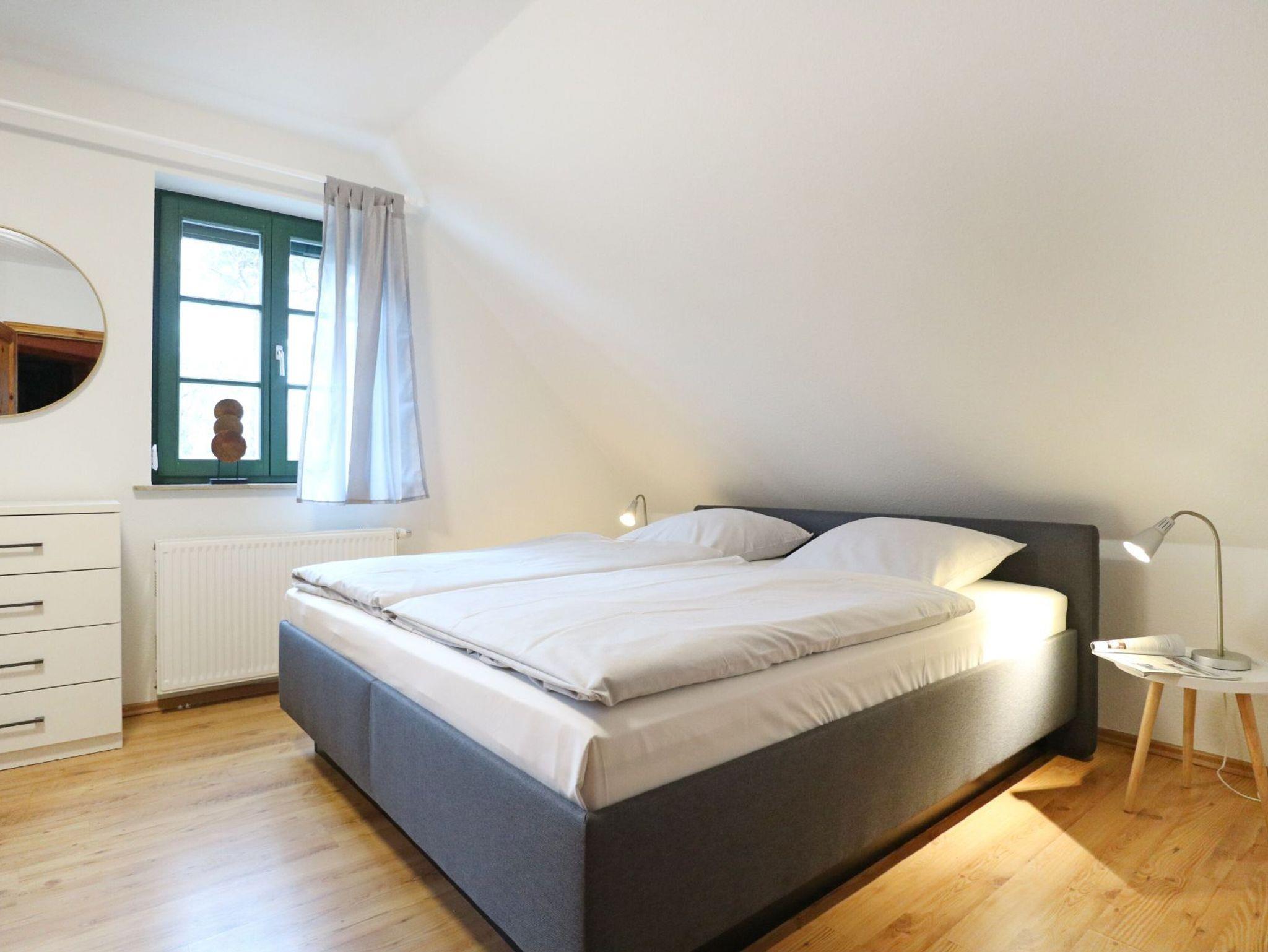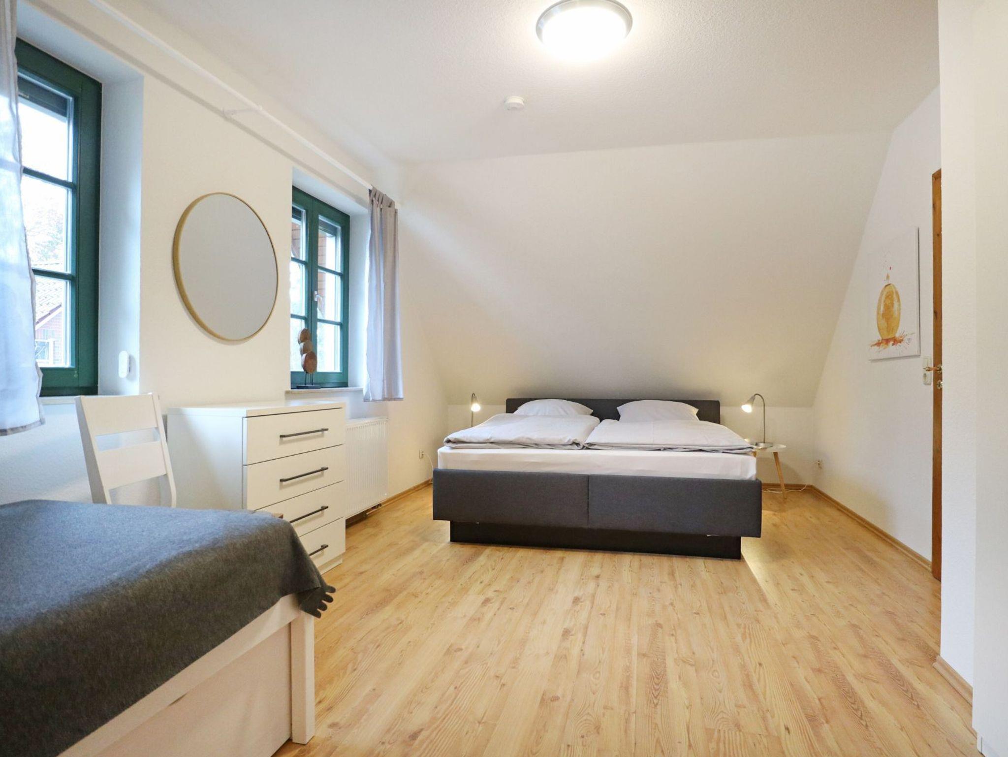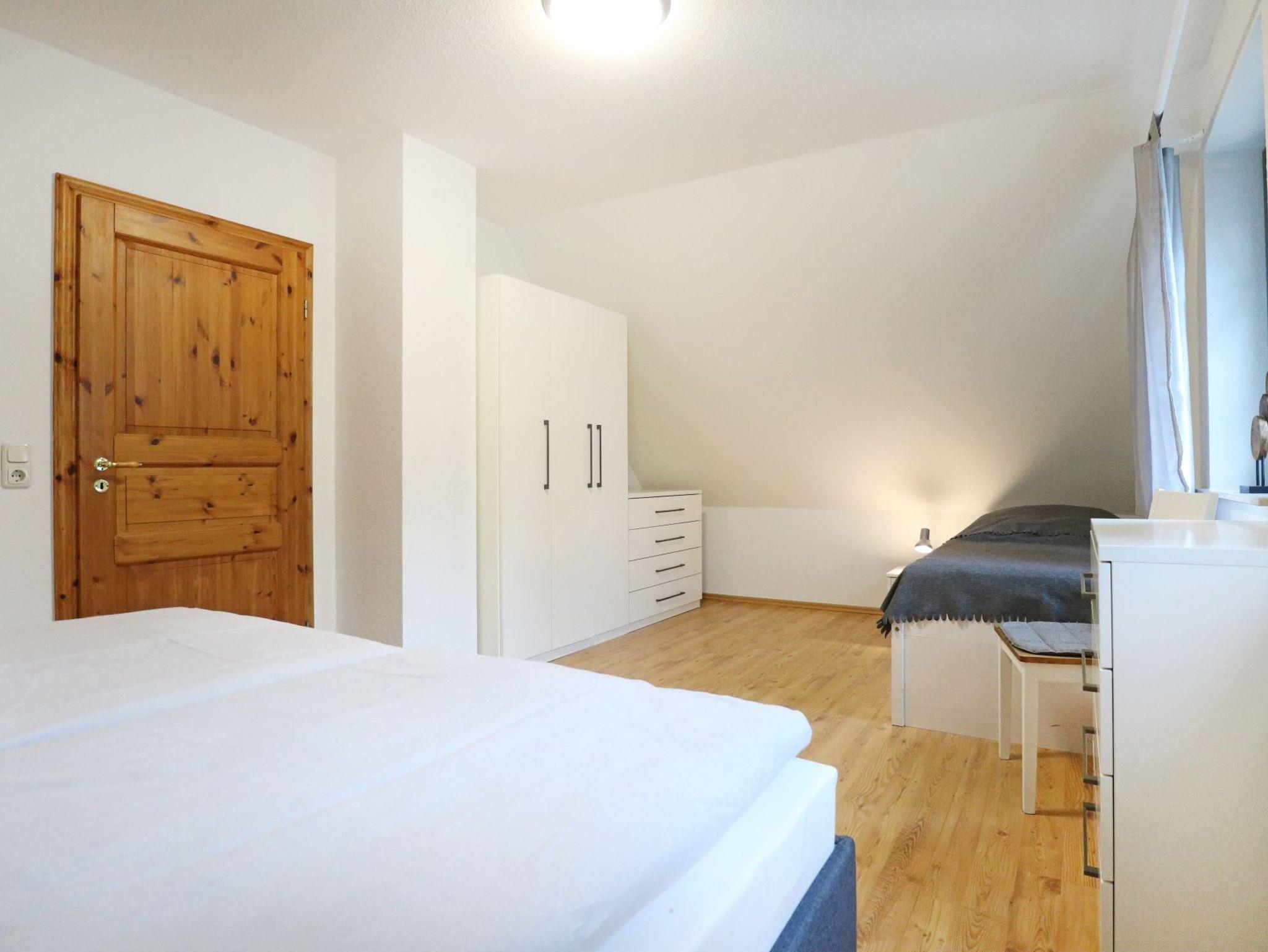Die moderne Küche ist komplett ausgestattet (Mikrowelle, Kühlschrank, Gefrierfach, Herd, Backofen, Cerankochfeld, Geschirrspüler u.v.m.). Ein Gäste WC befindet sich ebenfalls auf dieser Wohnebene. Im Obergeschoss befinden sich die 2 Schlafzimmer (1x Doppelbett + Kleiderschrank, 1x Doppelbett + Einzelbett) und das großzügige Dusch- und Wannenbad. Eine Waschmaschine gegen Gebühr sowie ein Bollerwagen sind auch vorhanden. Das Grundstück ist komplett eingezäunt. Für Ihre Autos stehen Ihnen zwei Außenstellplätze in der Nähe des Grundstückes zur Verfügung! Sie müssen ca. 3 min laufen.