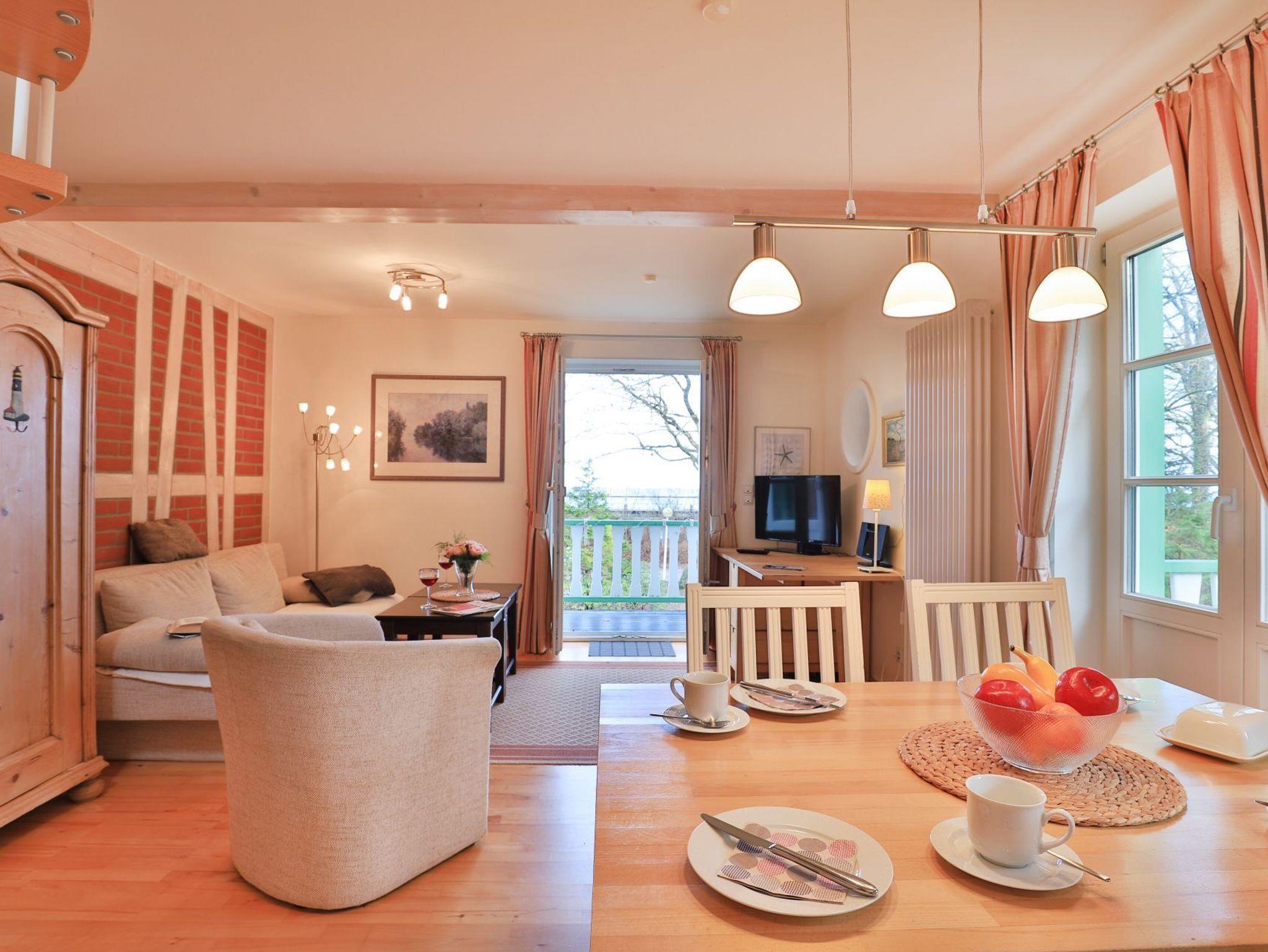 Die 2- Zimmer Meerblick Suite Seestern, mit zwei Balkonen, bietet eine großzügige Wohnfläche von 50qm und ist ideal für eine Belegung mit bis zu 4 Personen. Es handelt sich um eine Wohneinheit, die auch für Allergiker geeignet ist. Der Wohn-Essbereich ist sehr hochwertig mit einem Sofa als zusätzliche Schlafgelegenheit, zwei Sesseln sowie einem Esstisch möbliert. Musikanlage, Fernseher zudem gebührenfreies WLAN sind ebenfalls vorhanden. Die offene Einbauküche ermöglicht die Eigenversorgung mit: Ceranfeldherd, Backofen, Mikrowelle, Dunstabzug, Kaffeemaschine, Wasserkocher, Toaster u.v.m. Ihre Urlaubsmahlzeiten nehmen Sie am Esstisch zu sich, oder Sie finden Ihren Lieblingsplatz mit Ostseeblick auf den beiden, saisonal möblierten Balkonen. Über eine Wendeltreppe erreichen Sie die offene Schlafgalerie mit Doppelbett, kleinem Schrank und Kommode. Des Weiteren bietet hier eine Récamiere eine weitere Schlafmöglichkeit. Bei Anreise sind Ihre Betten bereits für Sie bezogen und Handtücher liegen bereit.