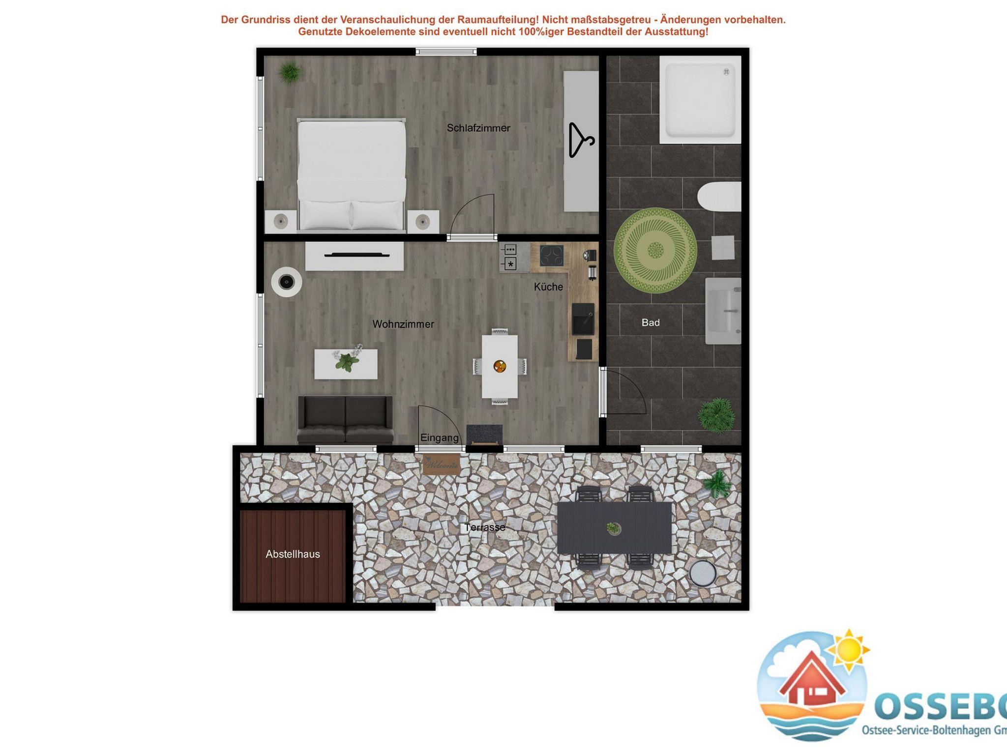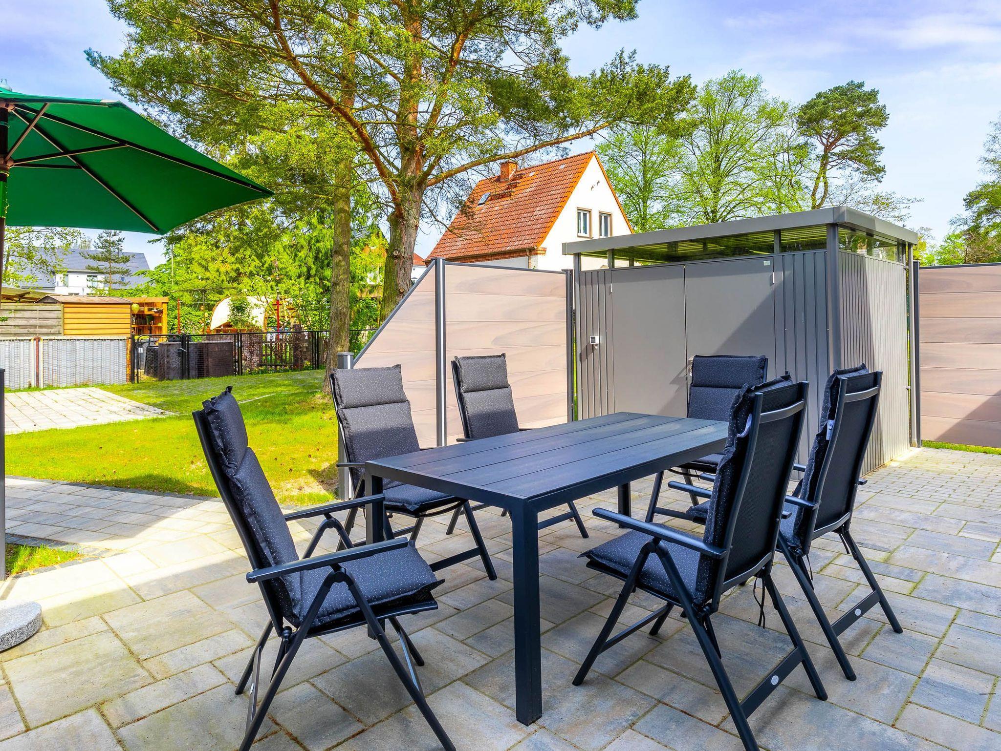 Auf der möblierten Terrasse können Sie die frische Ostseeluft genießen. Das große Rasengrundstück grenzt direkt an das Grundstück. Der Bungalow ist auch für Senioren geeignet, da er sich im Erdgeschoss befindet und einen komfortablen Zugang bietet. Der Strand ist nur 250 Meter entfernt und leicht zu Fuß erreichbar. Rauchen ist nur auf der Terrasse gestattet.