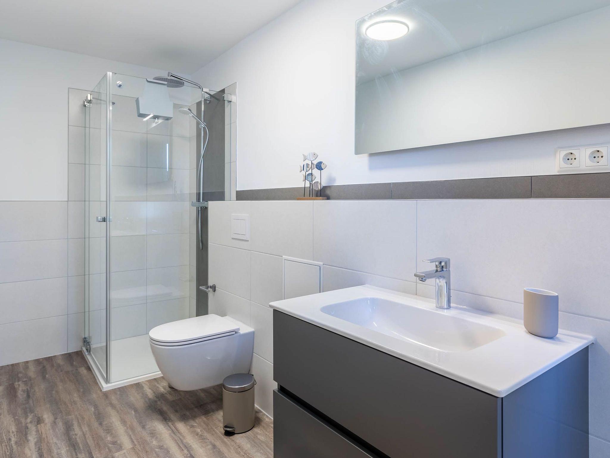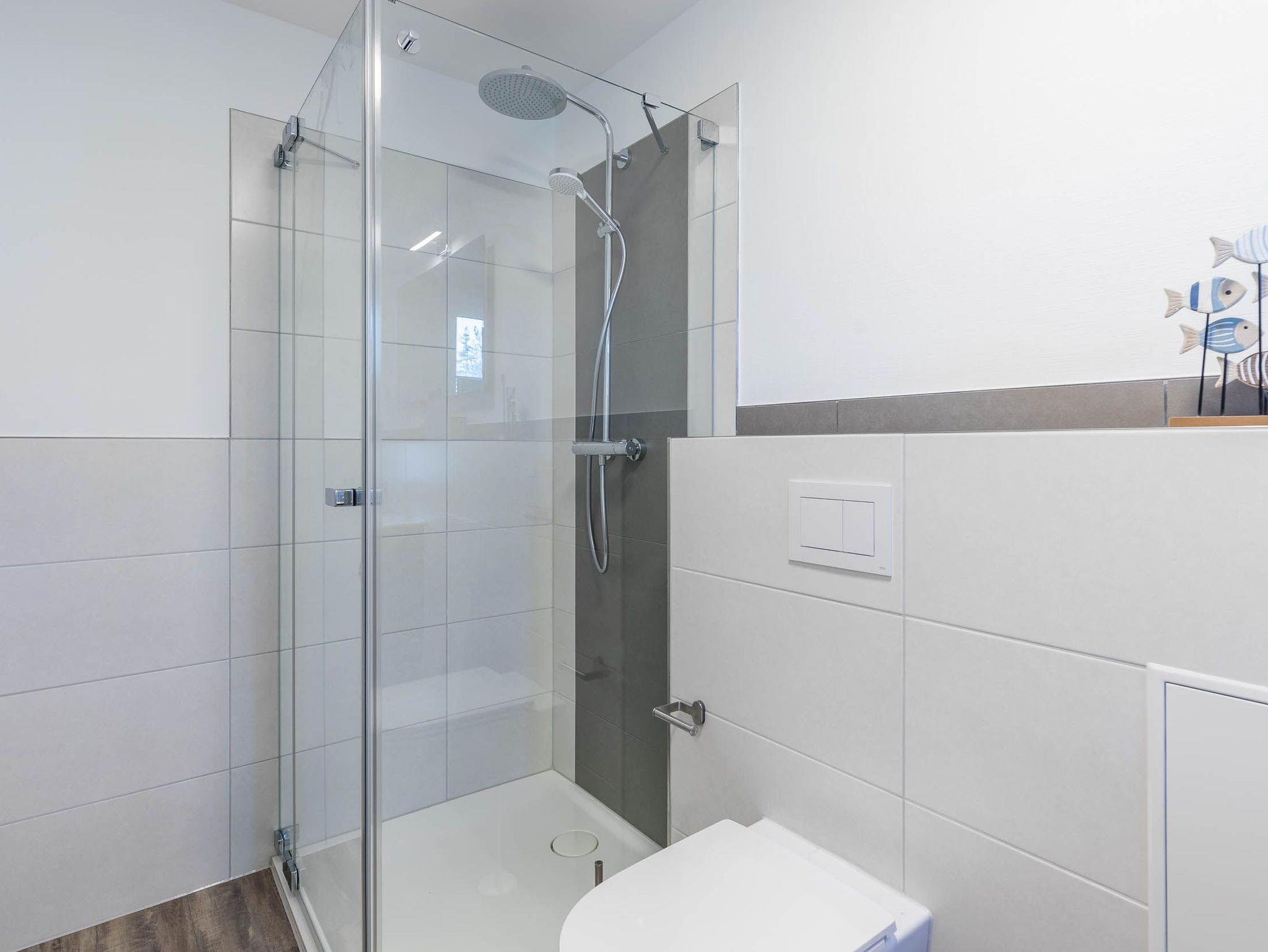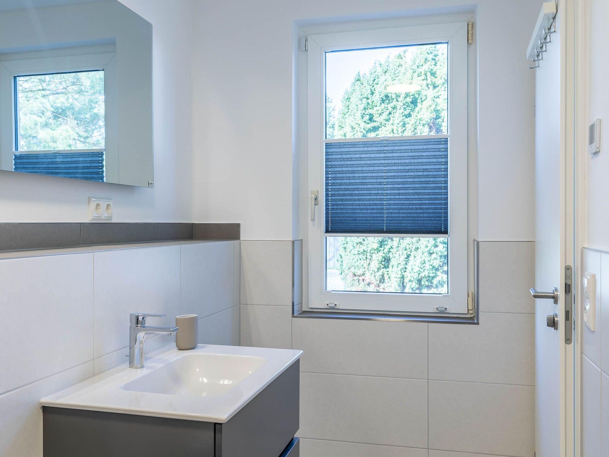 Das geflieste Badezimmer verfügt über eine bodentiefe Dusche, die nicht nur für Senioren geeignet ist. Ein kleines Fenster sorgt für Tageslicht und erleichtert das Lüften nach dem Duschen.