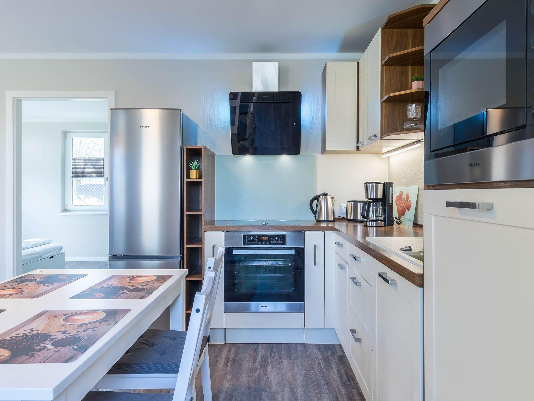 Für ein gutes Frühstück ist in der voll ausgestatteten Küchenzeile alles vorhanden. An dem Esstisch können Sie Ihre Mahlzeiten einnehmen.