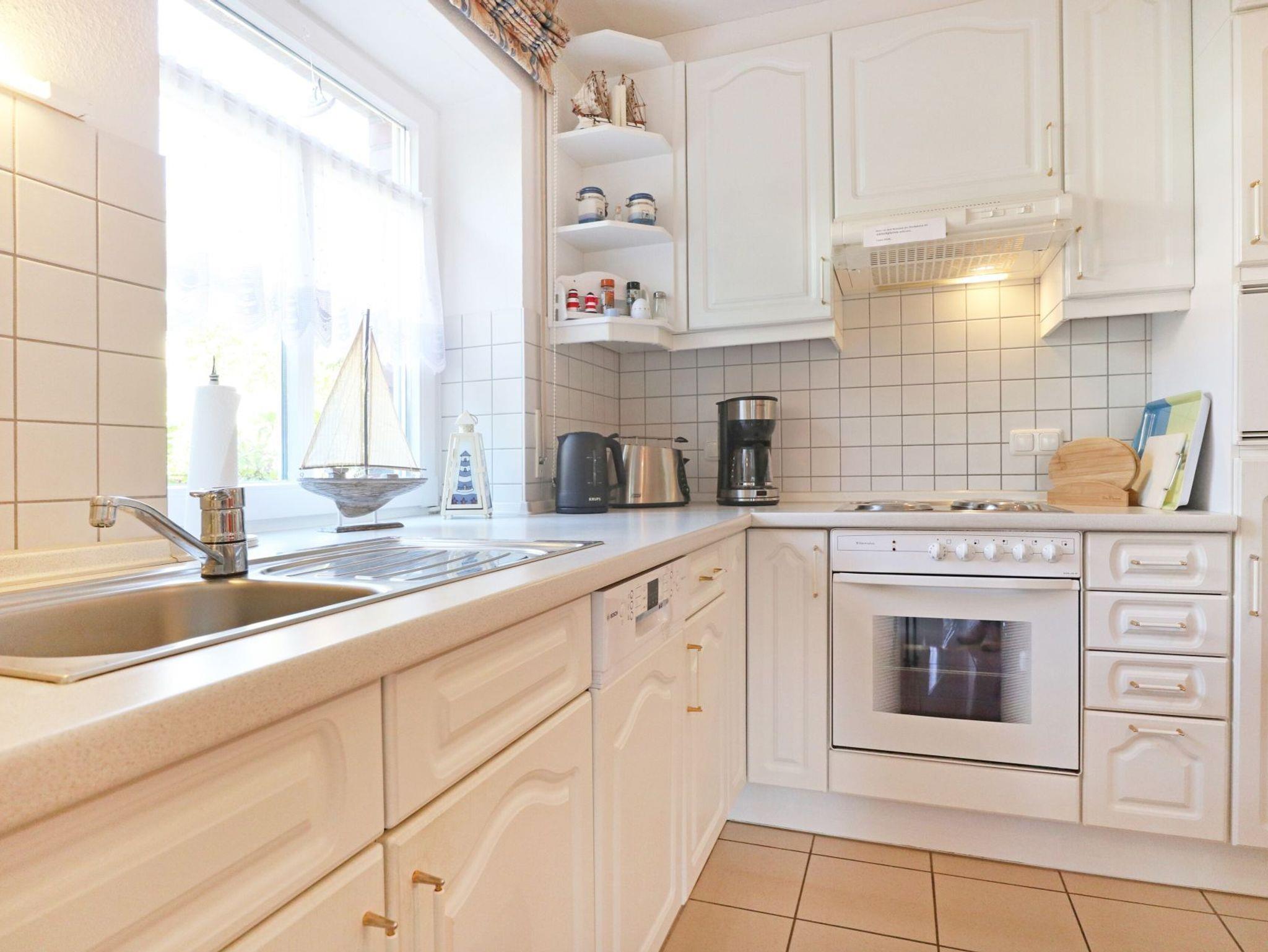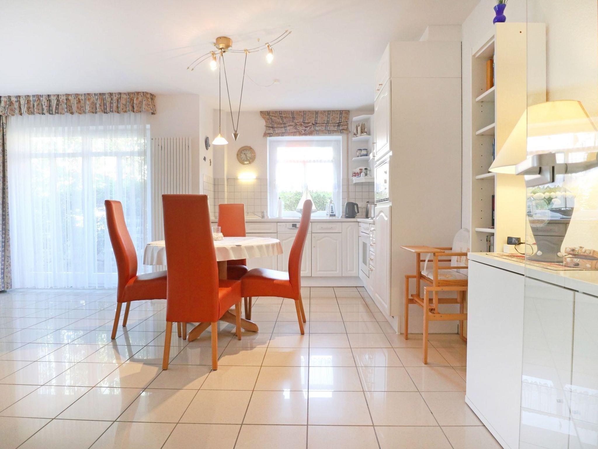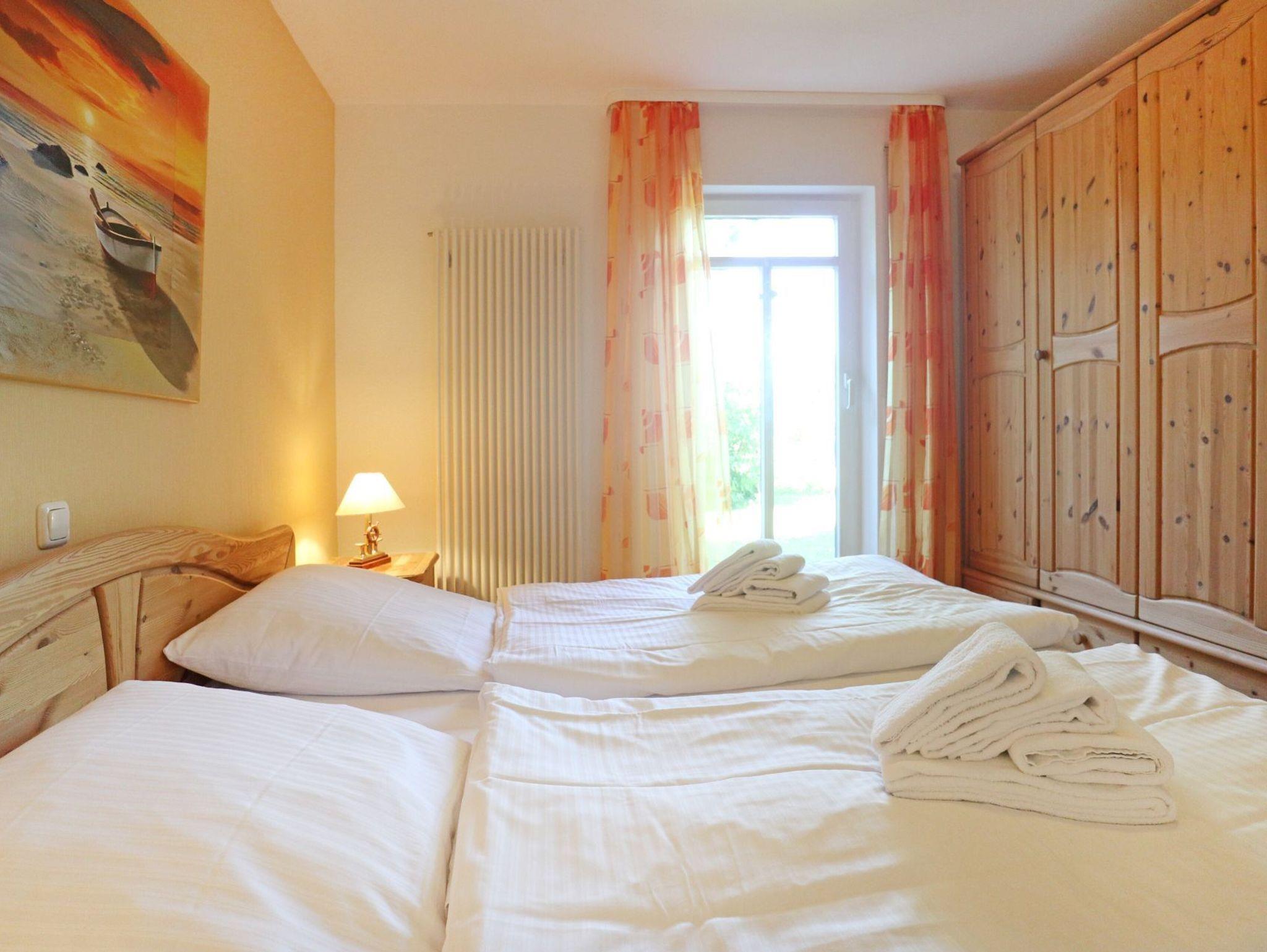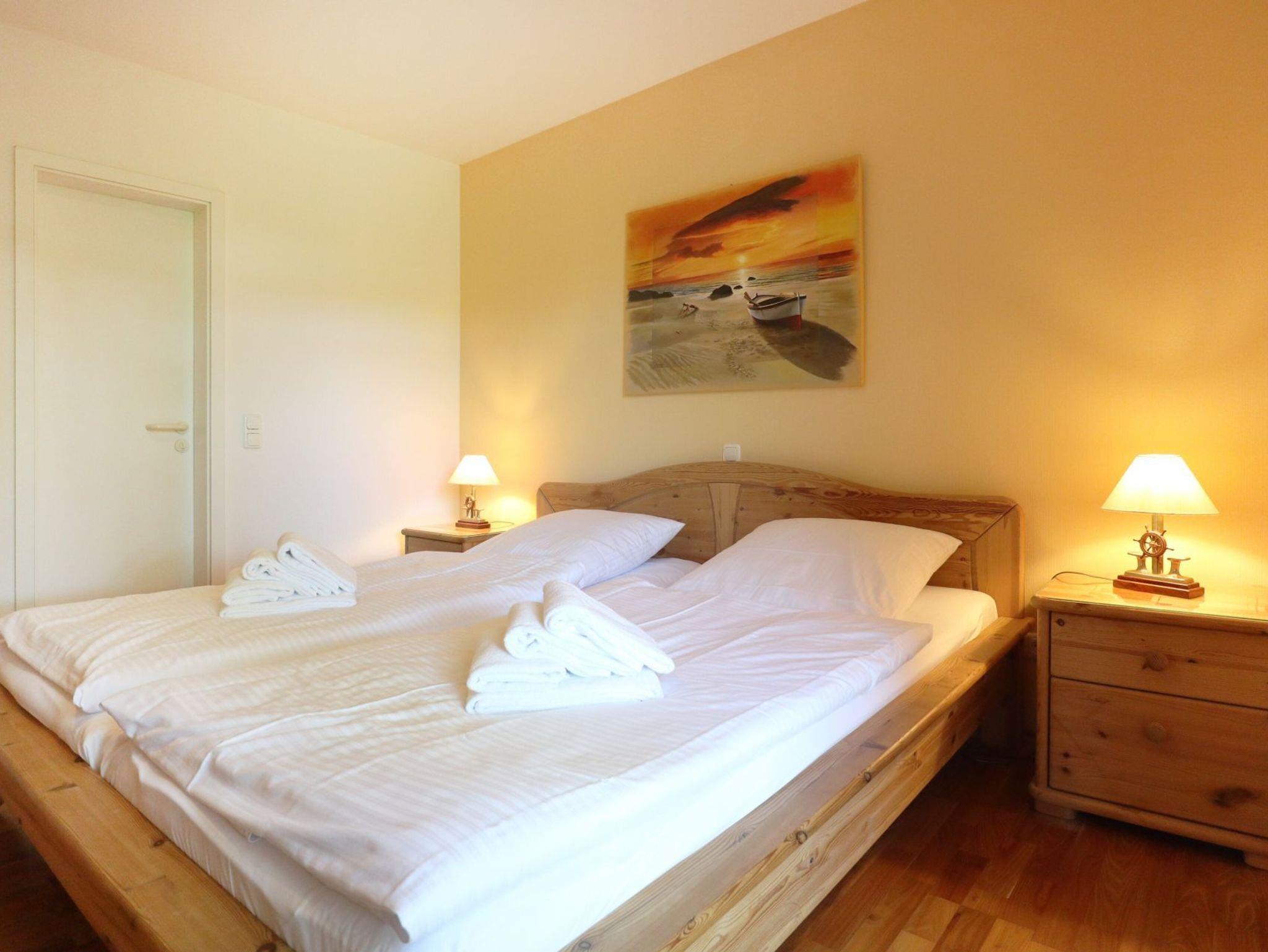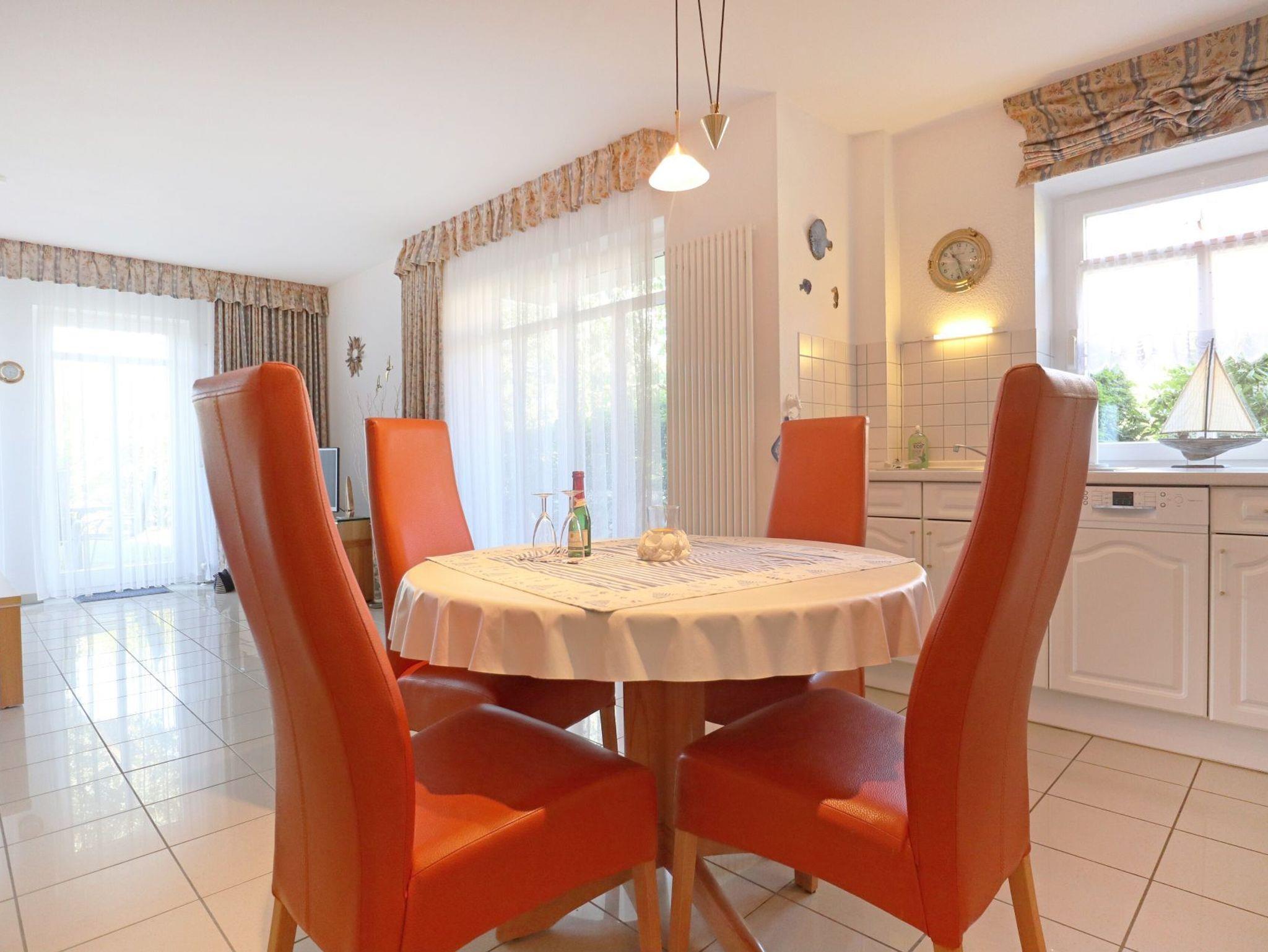 Komfortabel eingerichtete 2-Zimmer Erdgeschosswohnung Haus am Teich 14, mit Terrasse. Mit einer Wohnfläche von 58qm ist das Ferienappartement ideal für eine Belegung mit 2 Gästen. Der geräumige Wohn-/Essbereich lädt mit einer Sofalandschaft, Beistelltisch, Esstisch, Fernseher, Musikanlage zum Entspannen ein. WLAN-Nutzung gebührenfrei. Eine offene Wohnküche bietet die Möglichkeit der Selbstversorgung: Herd, Backofen, Mikrowelle, Dunstabzug, Kühlschrank mit integr. Frostfach, Toaster, Kaffeemaschine, Wasserkocher, Geschirrspüler usw. sind vorhanden. Gemeinsame Mahlzeiten können Sie bequem am Esstisch zu sich nehmen, oder an wärmeren Tagen auf der saisonal möblierten Außenterrasse mit angrenzendem Rasen. Ebenso ist ein separates Wohlfühlschlafzimmer mit Doppelbett und Kleiderschrank vorhanden. Zur familienfreundlichen Ausstattung gehört in Kinderhochstuhl. Zugehörig ist ein hell gefliestes Duschbad mit Waschtisch, Handtuchheizung, Föhn, WC, das auch vom Schlafbereich betreten werden kann. Waschmaschine und Wäschetrockner können im Haus gemeinschaftlich ? Münzbetrieb- genutzt werden.