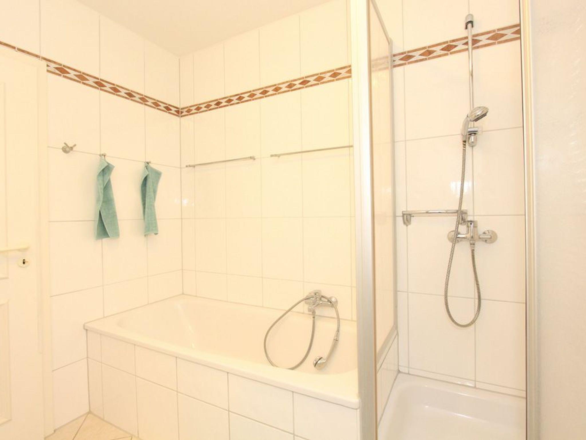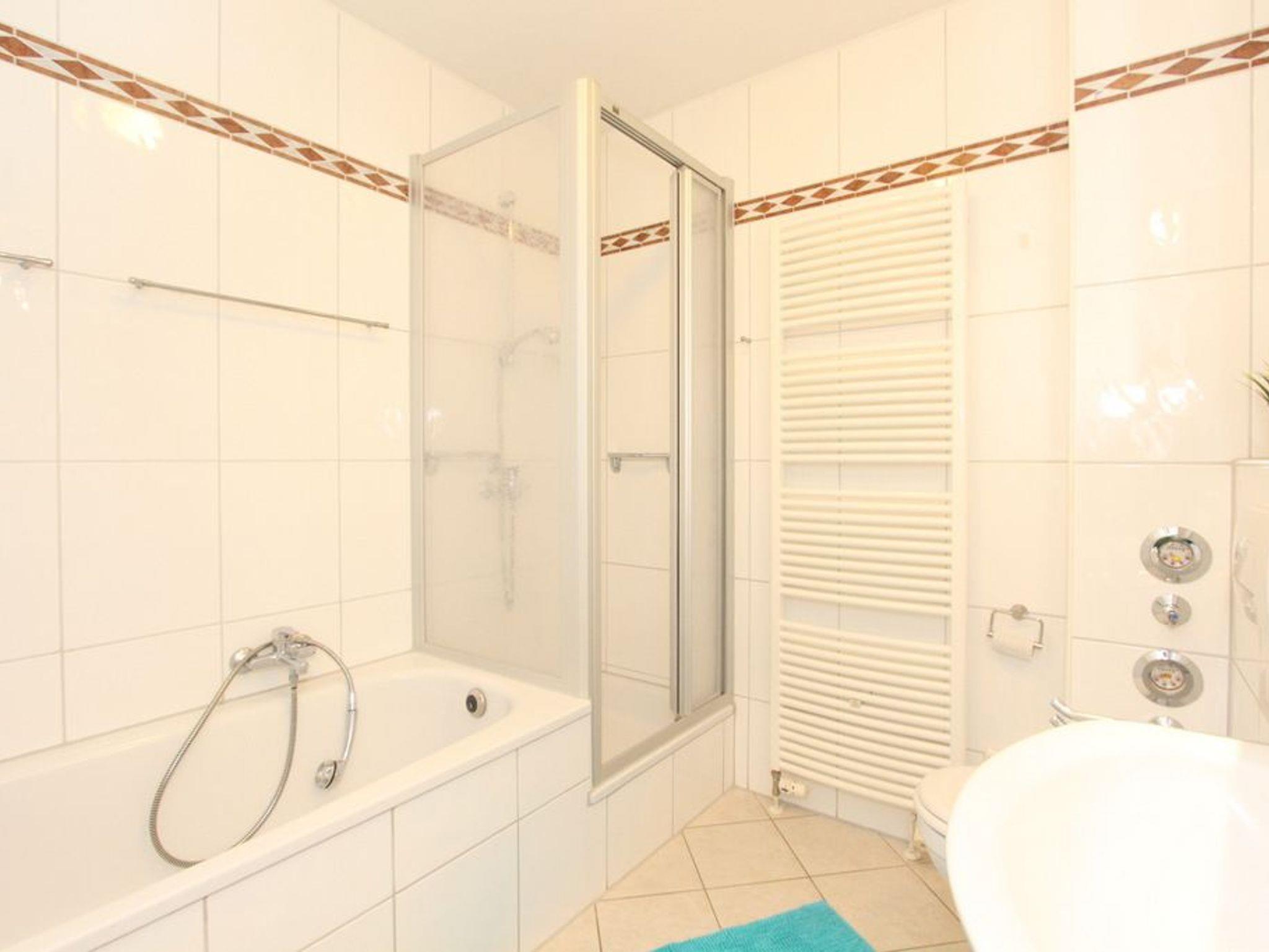 Das hell geflieste Bad besteht aus einer Dusche, Badewanne und einem WC.