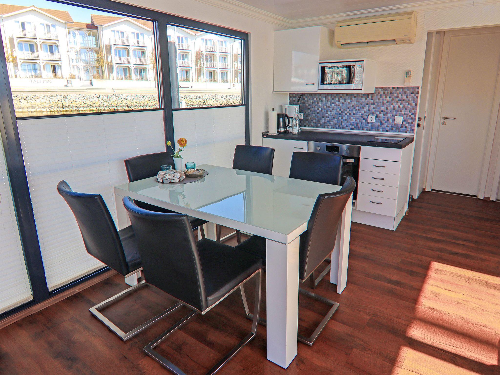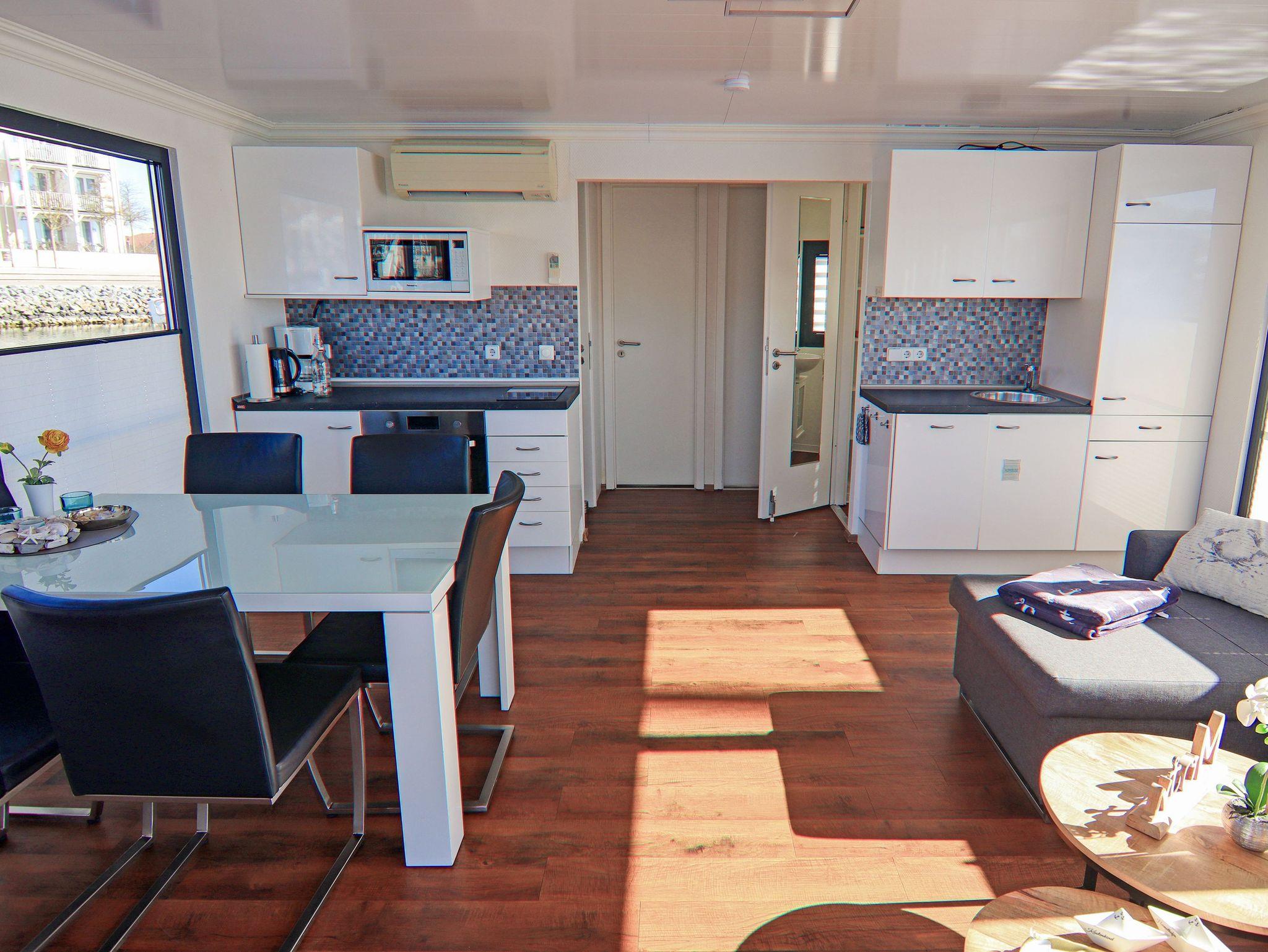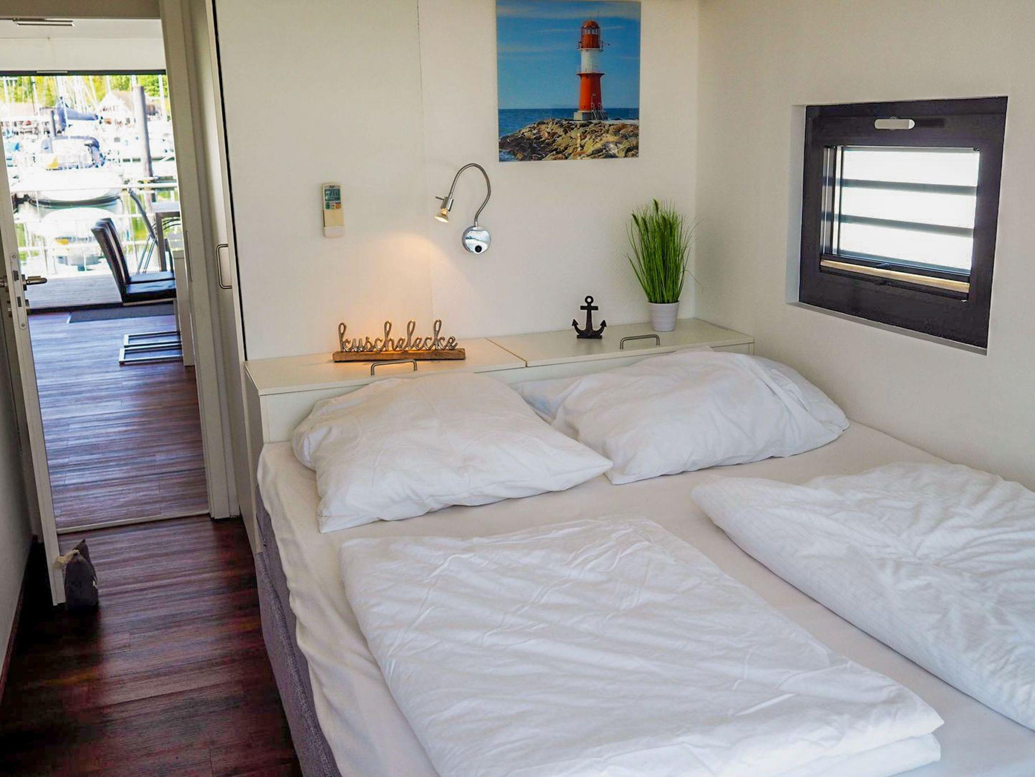 Floating House 1 im Ostseebad Boltenhagen bietet dir einen ganz besonderen Rückzugsort auf dem Wasser. Das moderne Hausboot eignet sich ideal für bis zu 6 Personen und kombiniert klares Design mit maritimem Flair, viel Komfort und einer Extraportion Urlaubsgefühl. Hier bist du mittendrin in der Natur ? und gleichzeitig ganz für dich. Der großzügige Wohnbereich ist das Herzstück des Hausboots: eine gemütliche Eckcouch, die bei Bedarf auch als zusätzliche Schlafmöglichkeit (140x200) genutzt werden kann, ein großer Esstisch für 6 Personen und rundherum Fenster, durch die das Licht und die Aussicht auf den Hafen ins Innere fließen. Die integrierte Küchenzeile ist bestens ausgestattet ? mit Spülmaschine, Mikrowelle, Kühlschrank, Kaffeemaschine, Wasserkocher, Toaster und allem, was du für entspannte Kochmomente brauchst. Zwei separate Schlafzimmer mit komfortablen Doppelbetten (160x200) und Kleiderschränken sorgen für erholsame Nächte und den nötigen Stauram. Ein modernes Duschbad sowie ein separates WC mit Waschtisch bieten zusätzlichen Komfort ? auch bei voller Belegung. Draußen warten gleich zwei absolute Highlights auf dich: Die 15m² große Terrasse am Bug, möbliert und perfekt für dein Frühstück in der Morgensonne und die großzügige 25m² Dachterrasse, auf der du die Sonnenstrahlen genießen oder am Abend den Blick über den ruhigen Hafen schweifen lassen kannst. Für angenehmes Raumklima sorgt eine Klimaanlage mit Warmluftfunktion, außerdem stehen dir Smart-TV, Radio und CD-Player zur Verfügung. Ein kostenfreier Parkplatz in der Nähe des Hafens ist ebenfalls im Preis enthalten. Bitte beachte: Es handelt sich um Einrichtungsbeispiele, Abweichungen in Ausstattung oder Gestaltung sind möglich.