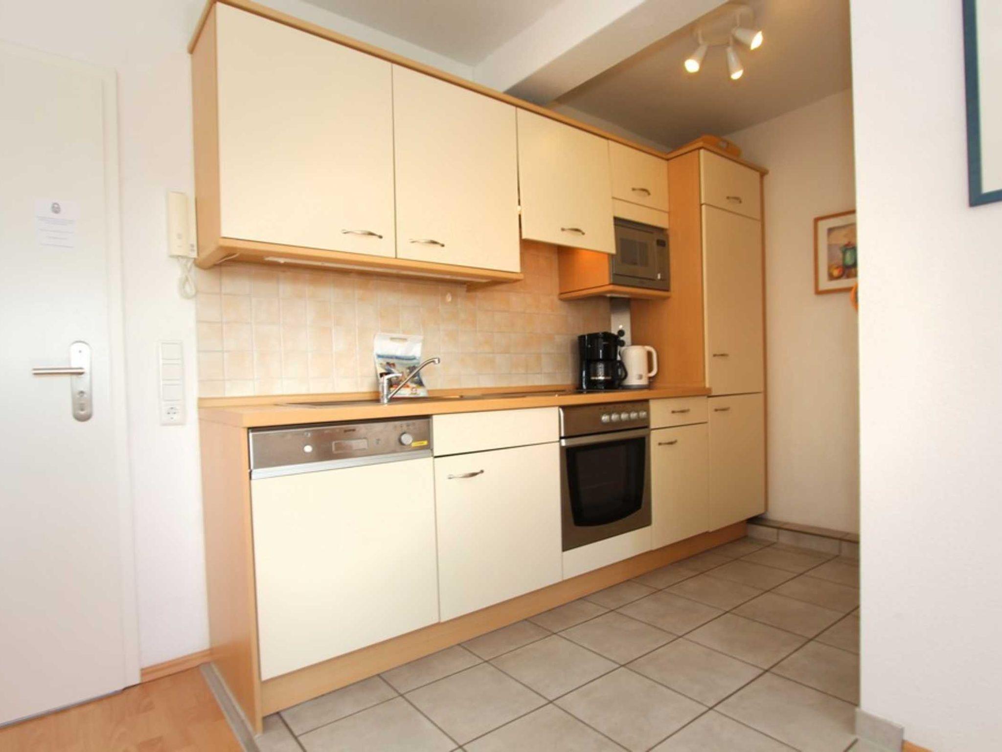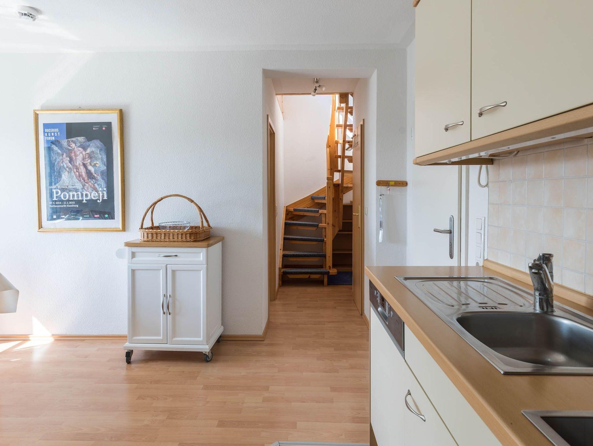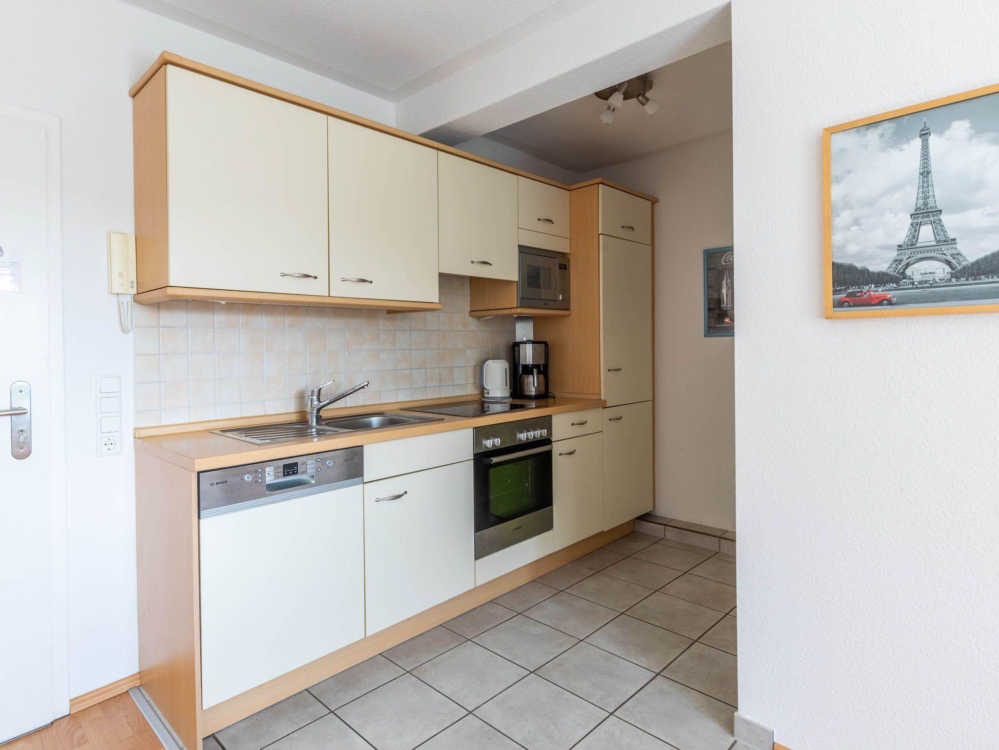 In der ersten Wohnebene steht Ihnen in der offenen Küche neben einem Essbereich jeglicher technischer Komfort zur Verfügung wie ein Kühlschrank mit Gefrierfach, Mikrowelle, Spülmaschine, Herd bzw. Backofen und eine Kaffeemaschine.