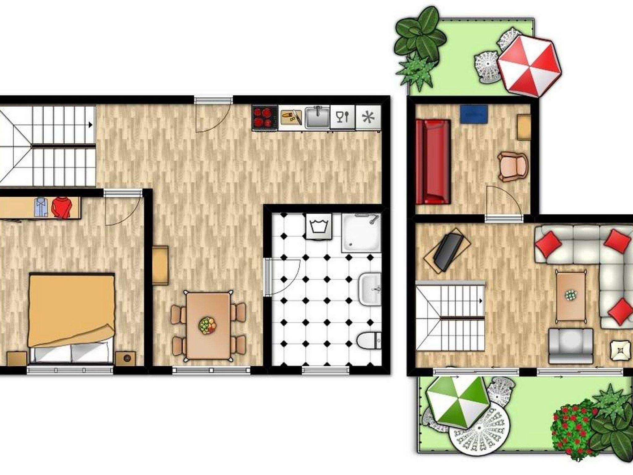 Sie finden dort Sonnenschirme, Gartenstühle, Tisch und zwei Sonnenliegen.
