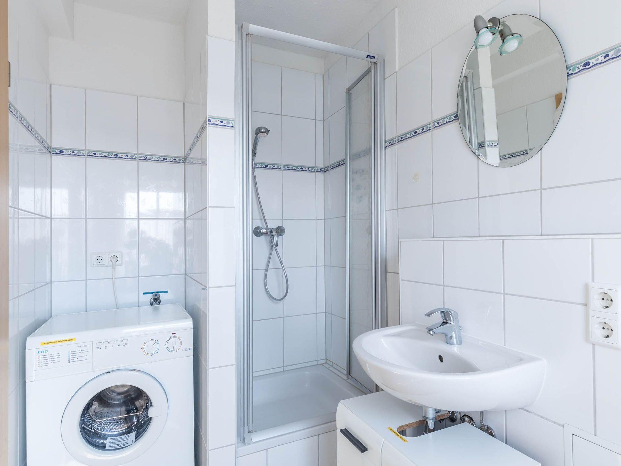Das Badezimmer mit Fenster hält neben Dusche und WC auch eine kostenfrei nutzbare Waschmaschine bereit.