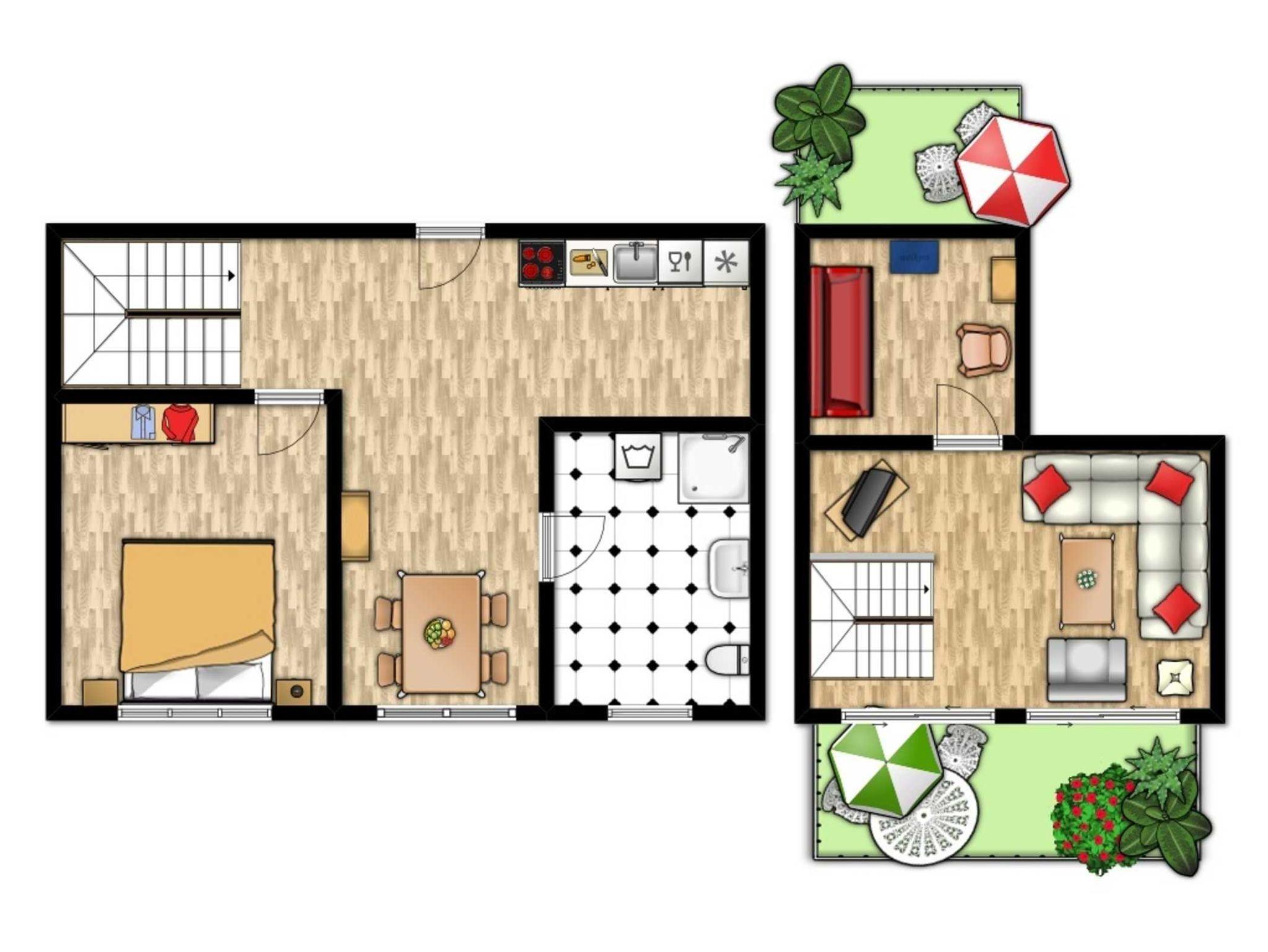 In der ersten Wohnebene steht Ihnen in der offenen Küche neben einem Essbereich jeglicher technischer Komfort zur Verfügung ? wie ein Kühlschrank mit Gefrierfach, Mikrowelle, Spülmaschine, Herd bzw. Backofen und eine Kaffeemaschine.