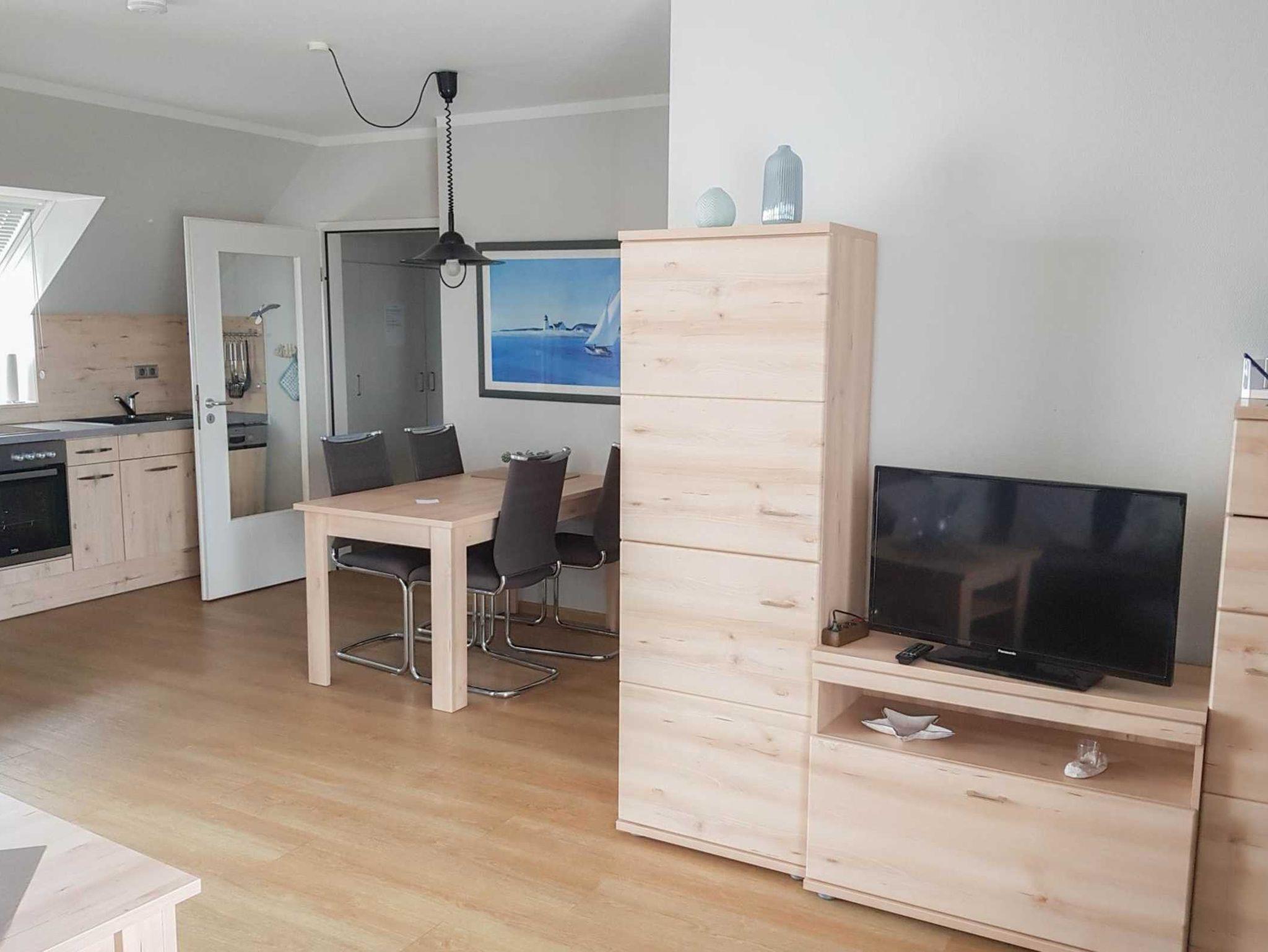 Wohn-Schlafraum mit bequemer Doppelbettcouch, separater Essplatz, voll ausgestatteter Küchenbereich