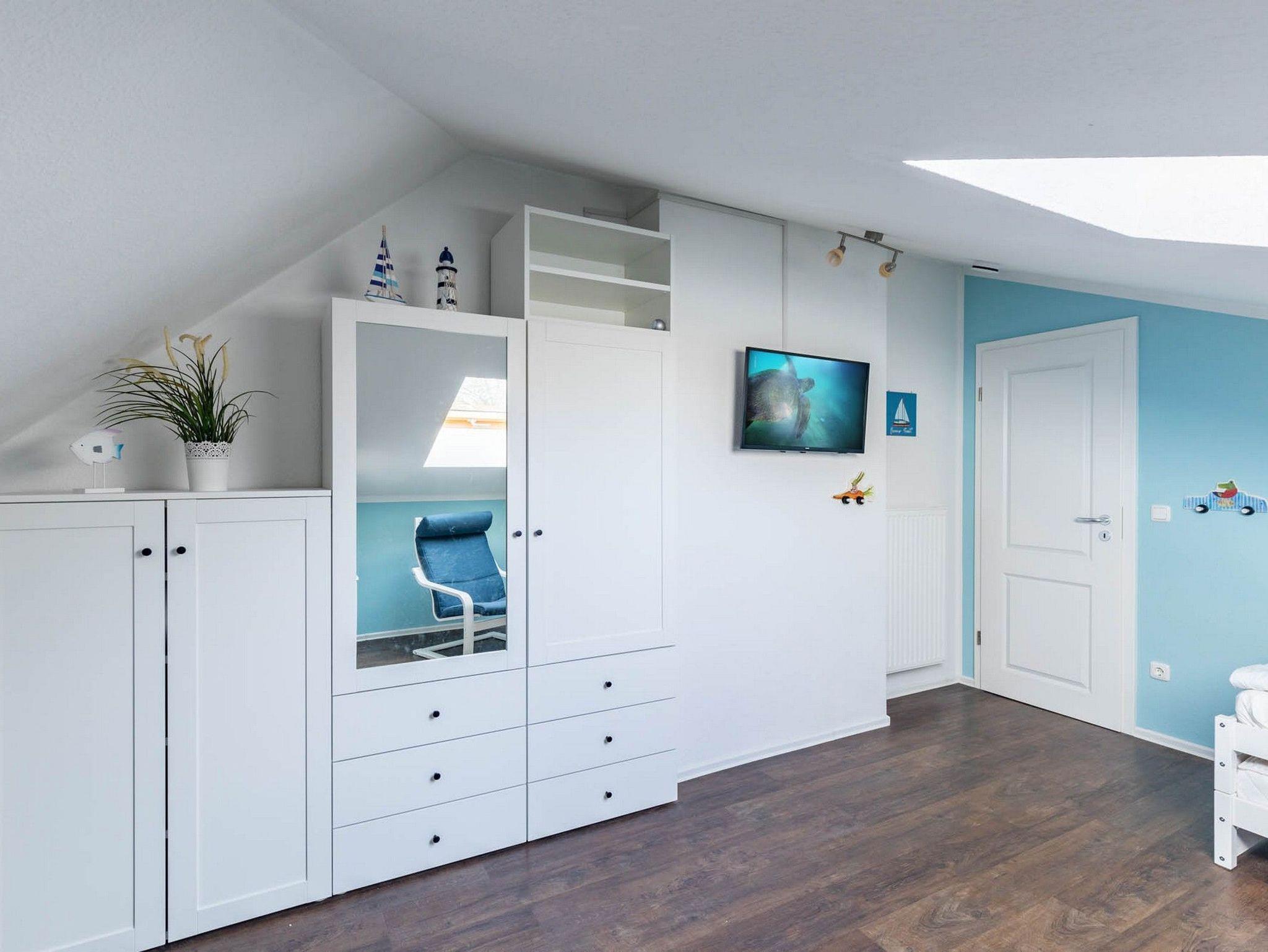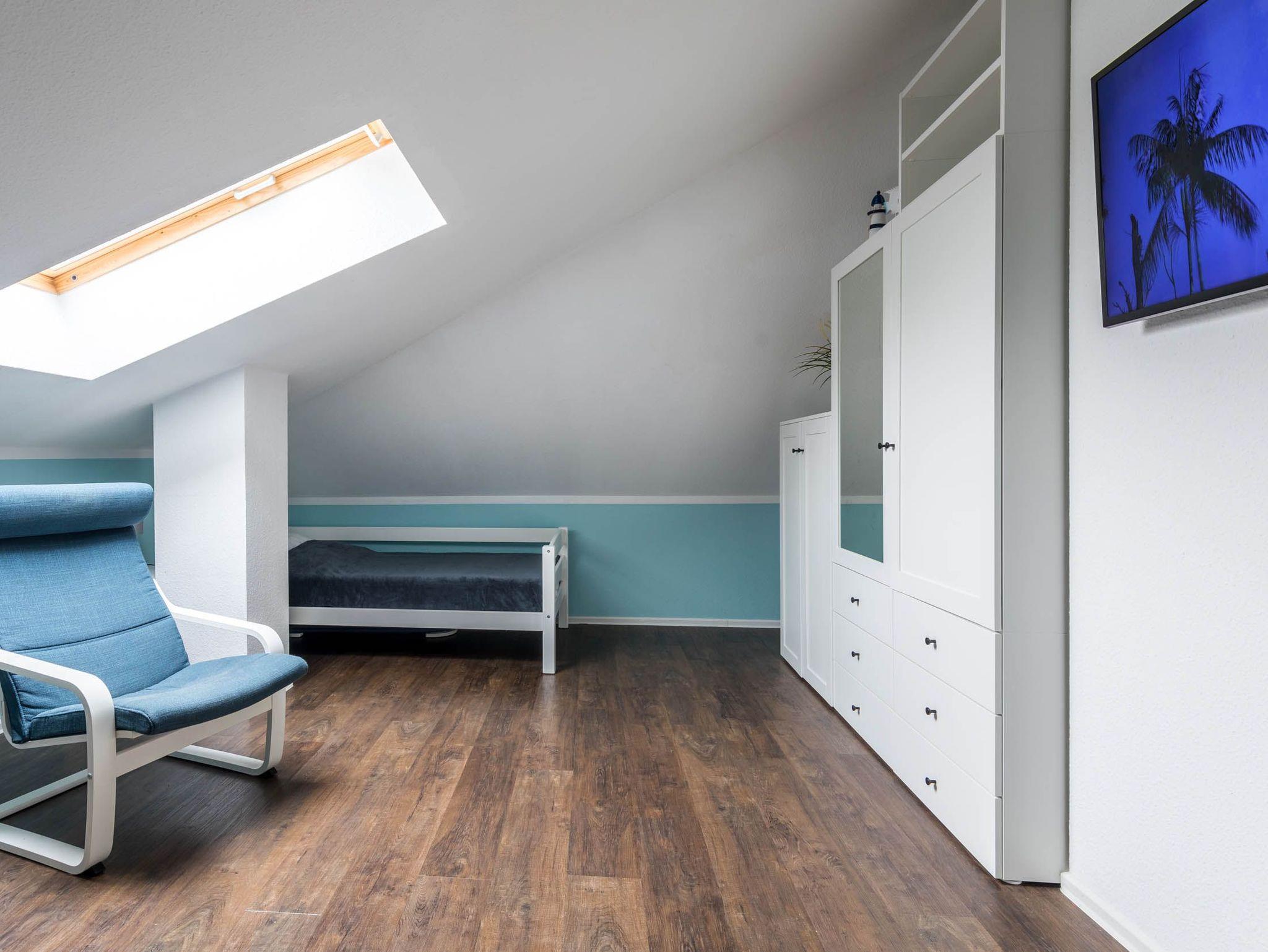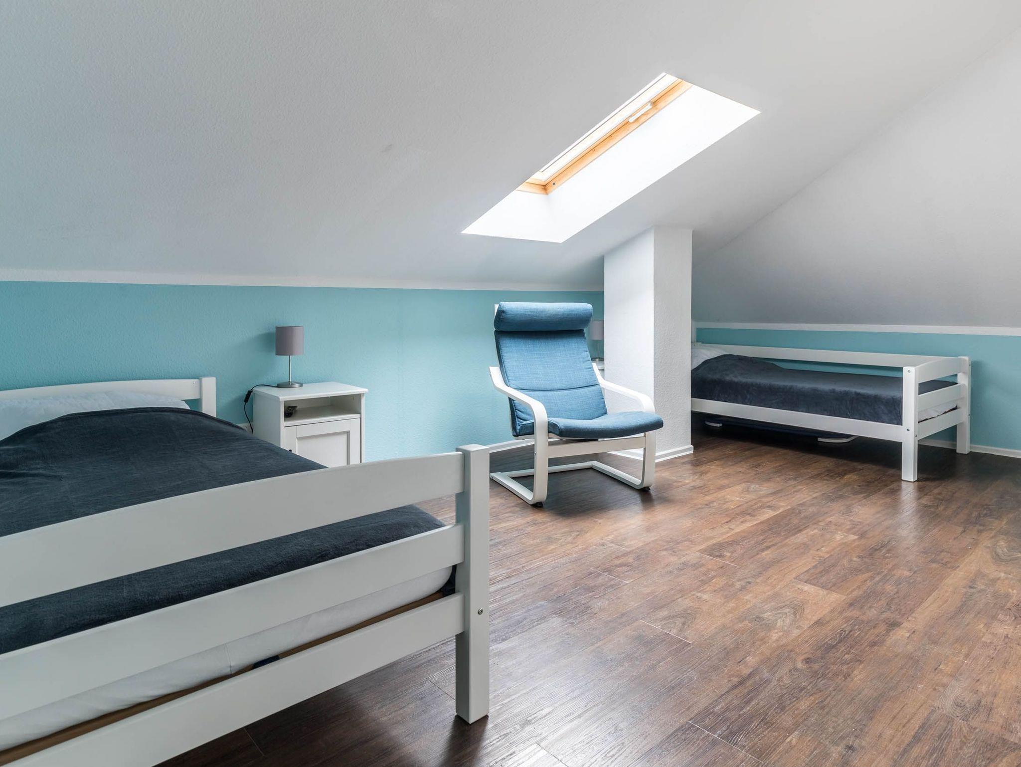 Das geräumige zweite Schlafzimmer mit großem Kleiderschrank und Flatscreen-Fernseher befindet sich auf der 2. Ebene (im DG). Zwei Einzelbetten, welche auch als Doppelbett gestellt werden können, bieten hier bis zu zwei Kindern, oder einem weiteren Pärchen einen erholsamen Schlaf.