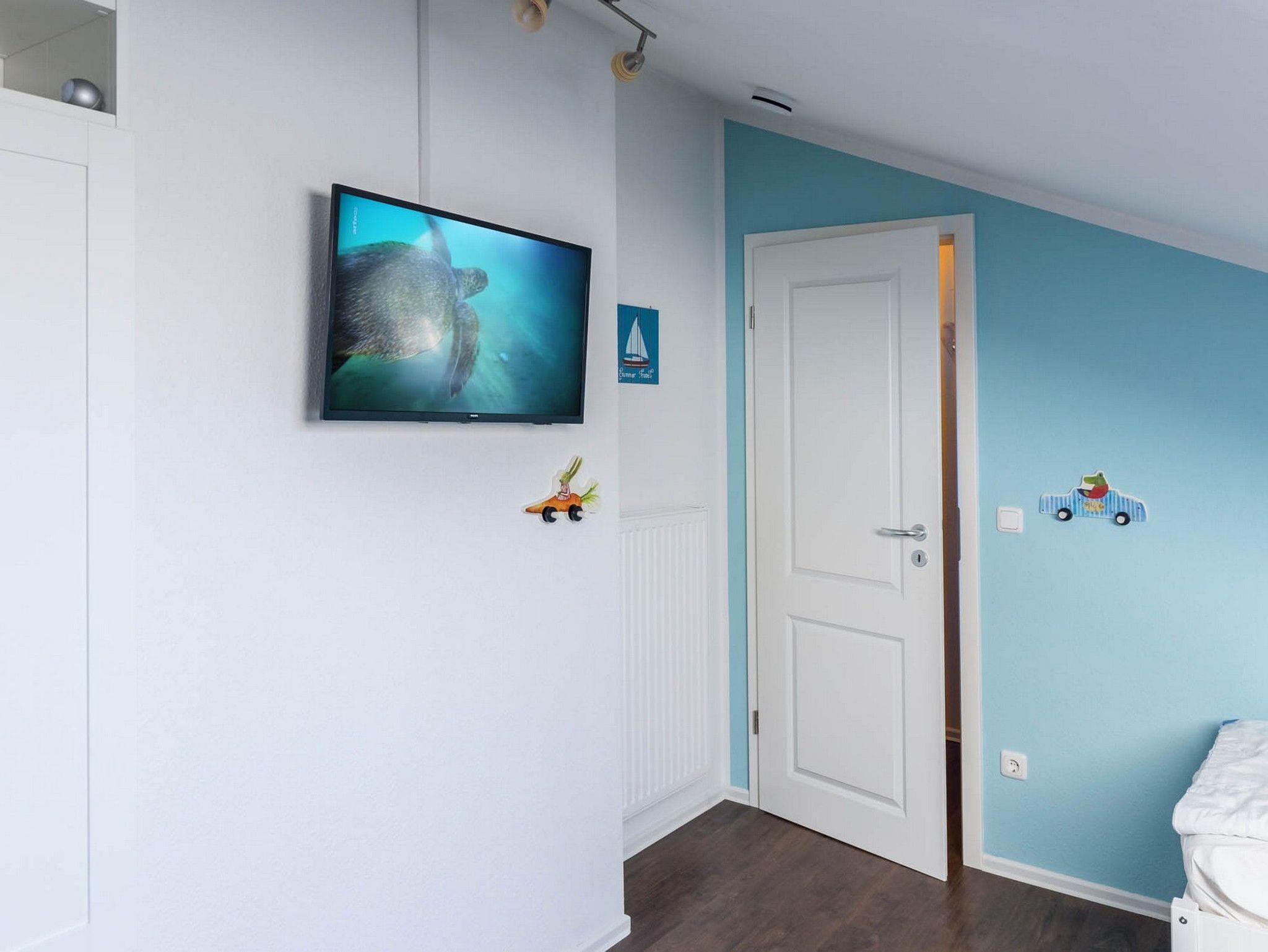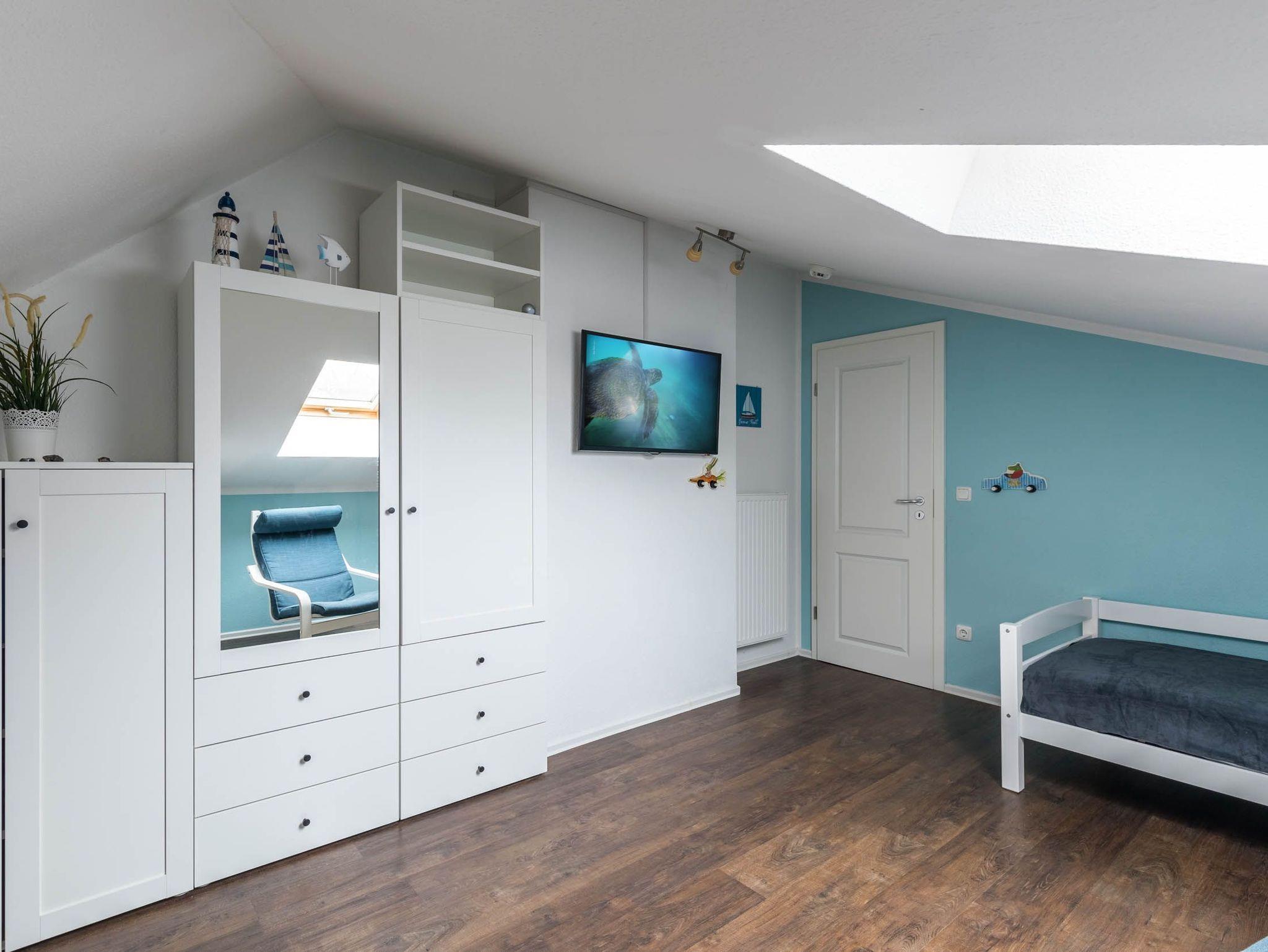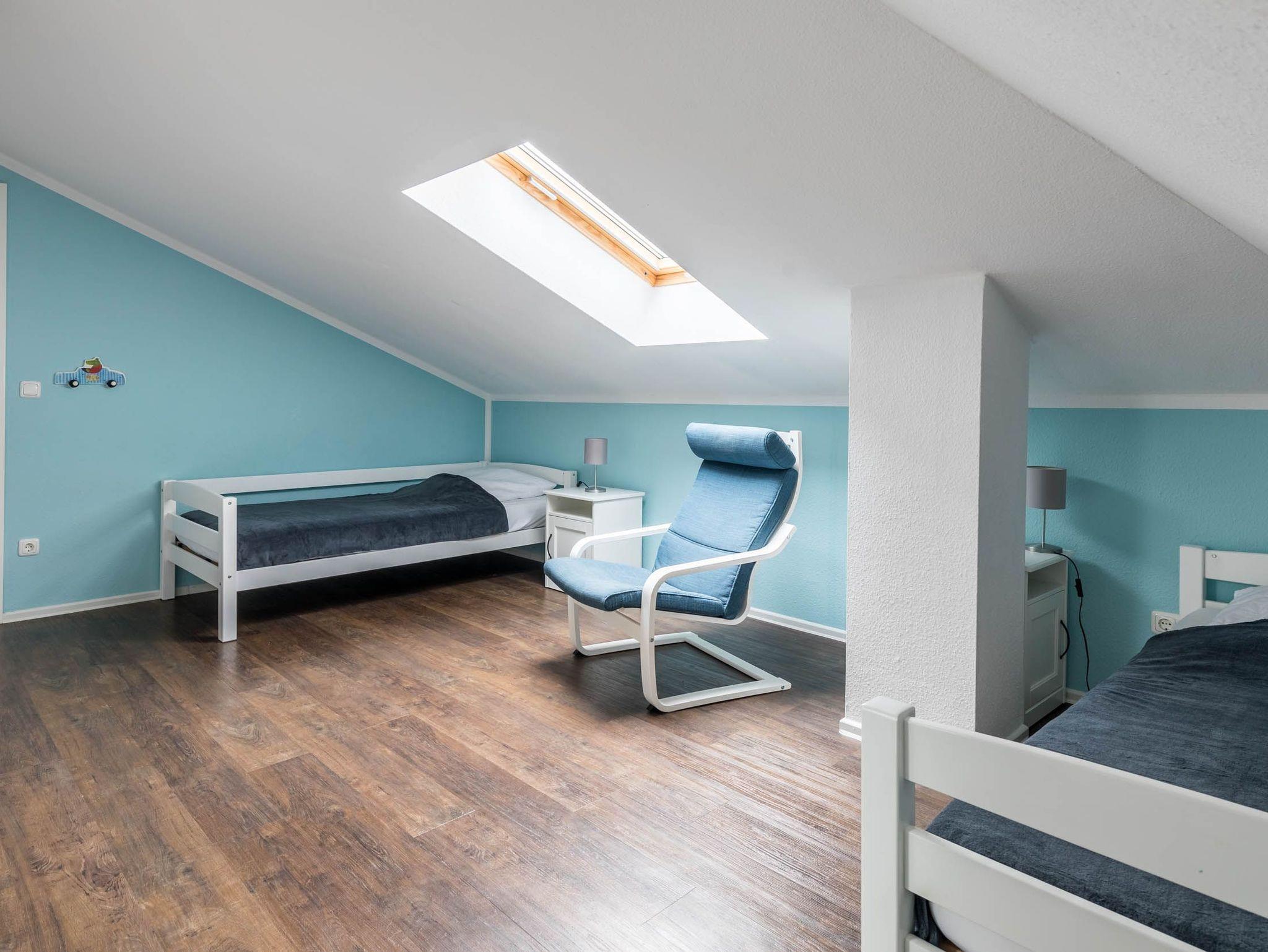Das geräumige zweite Schlafzimmer mit großem Kleiderschrank und Flatscreen-Fernseher befindet sich auf der 2. Ebene (im DG). Zwei Einzelbetten, welche auch als Doppelbett gestellt werden können, bieten hier bis zu zwei Kindern, oder einem weiteren Pärchen einen erholsamen Schlaf.