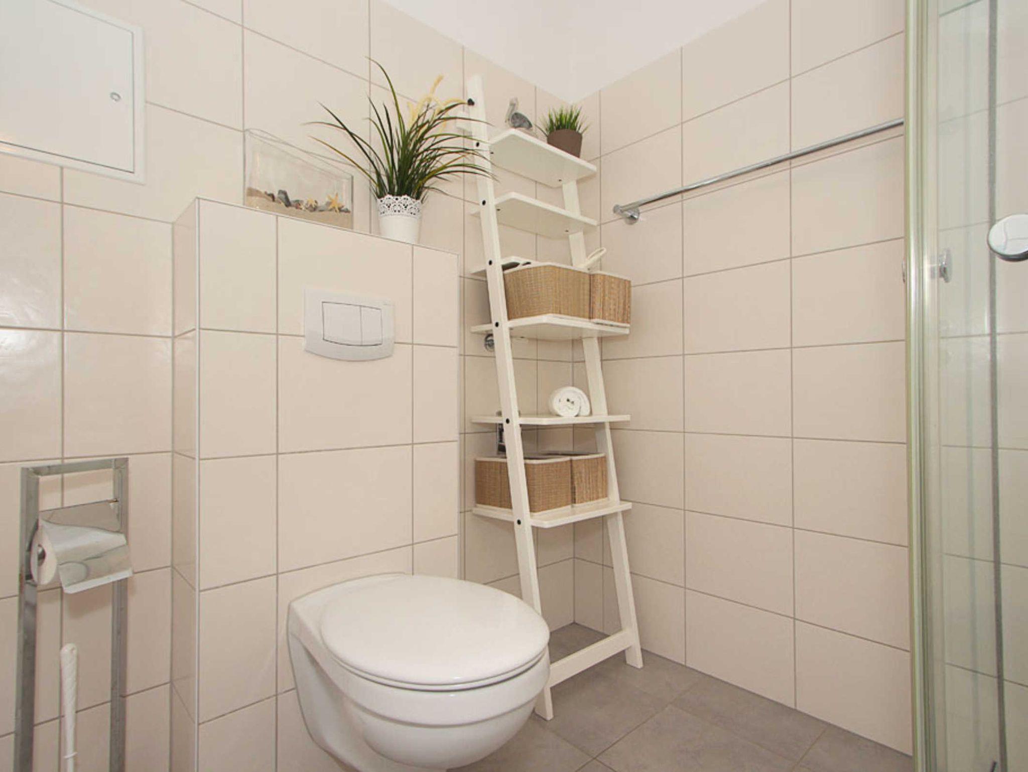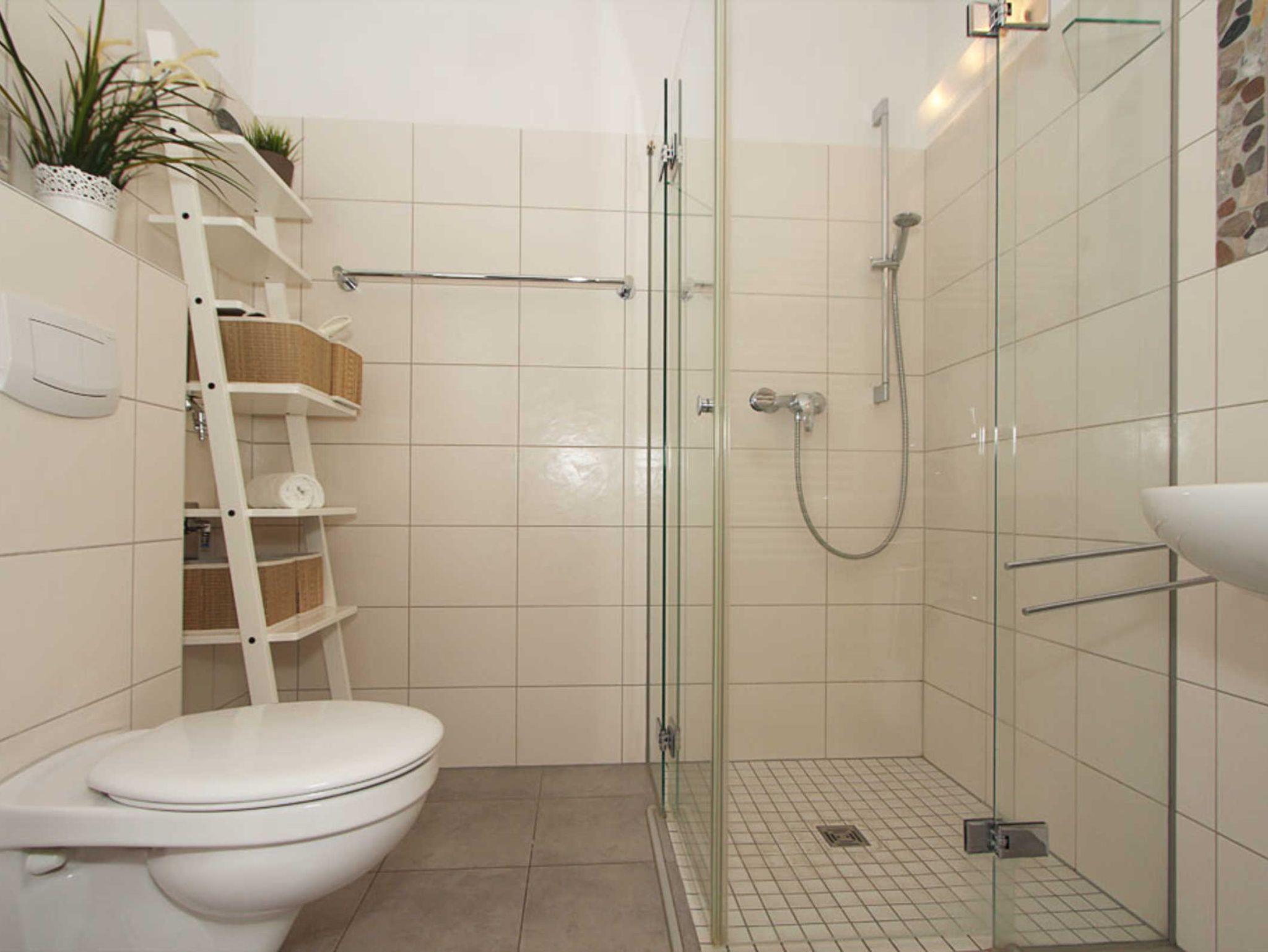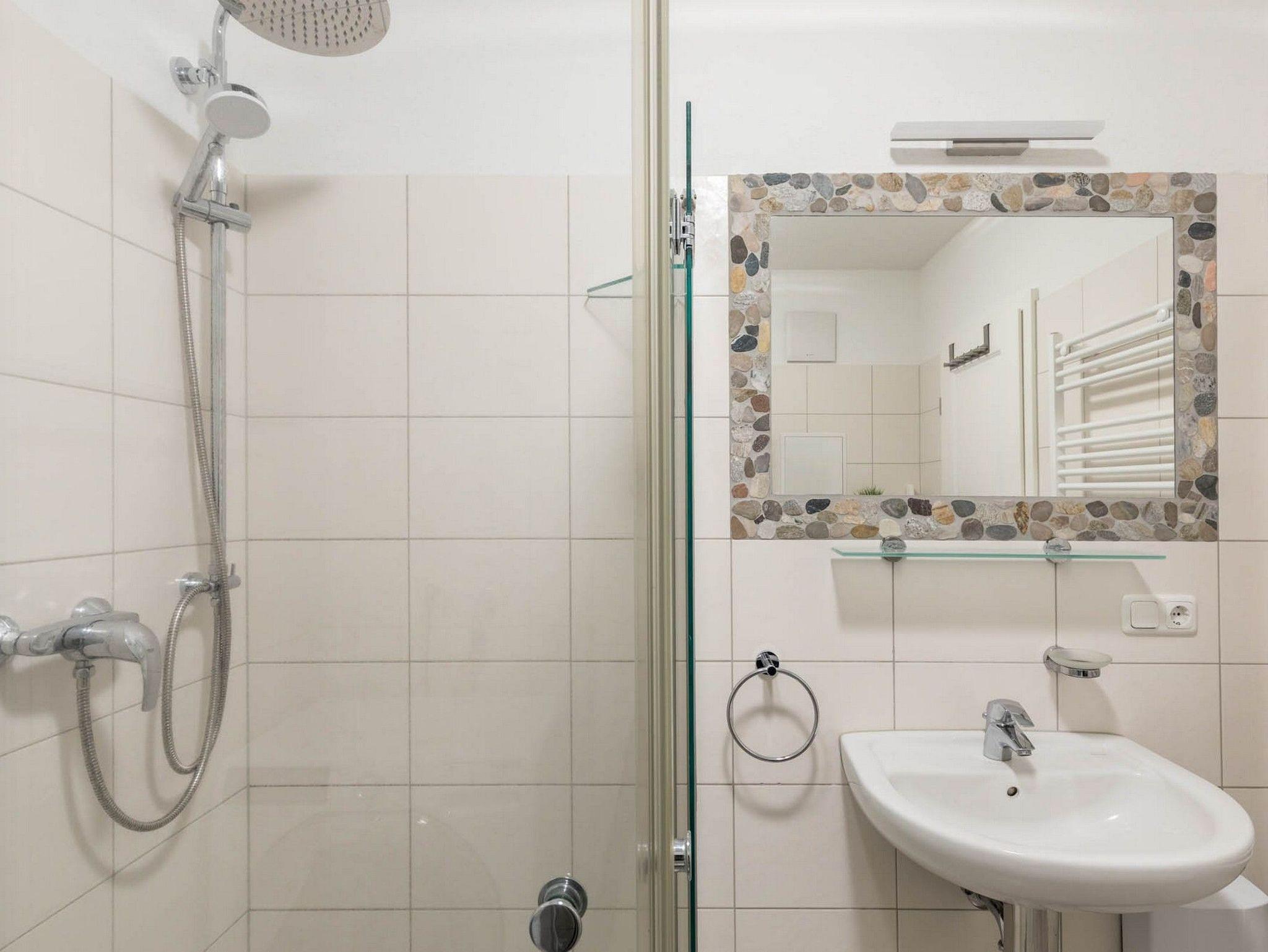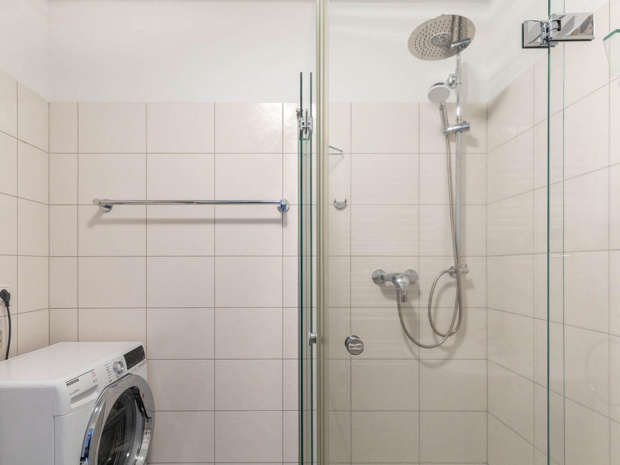 Das modern eingerichtete Badezimmer mit ebenerdiger Dusche und Handtuchwärmer, sowie einer kostenlos nutzbaren Waschmaschine, befindet sich ebenfalls in der unteren Wohnebene.