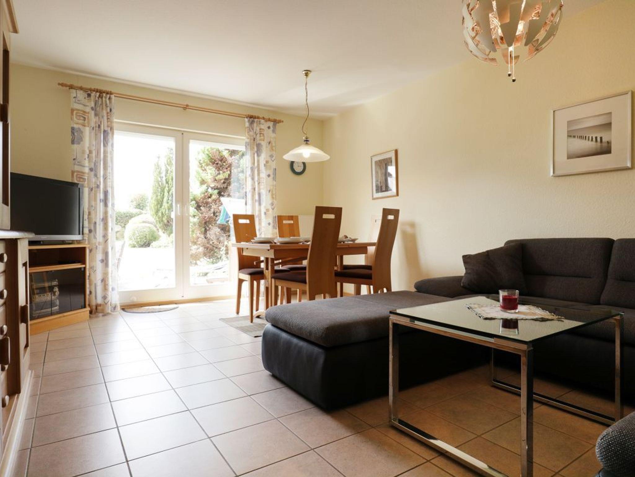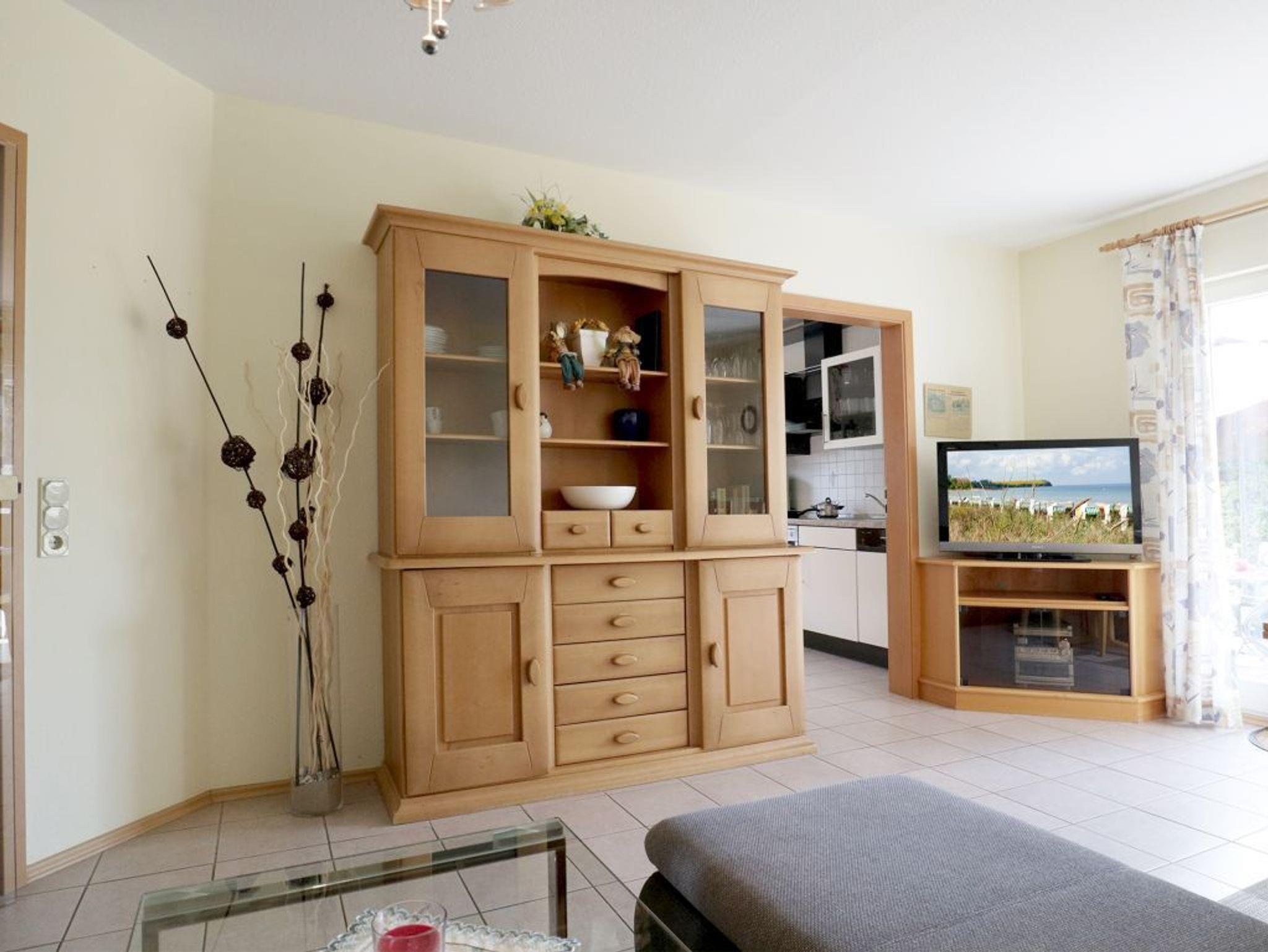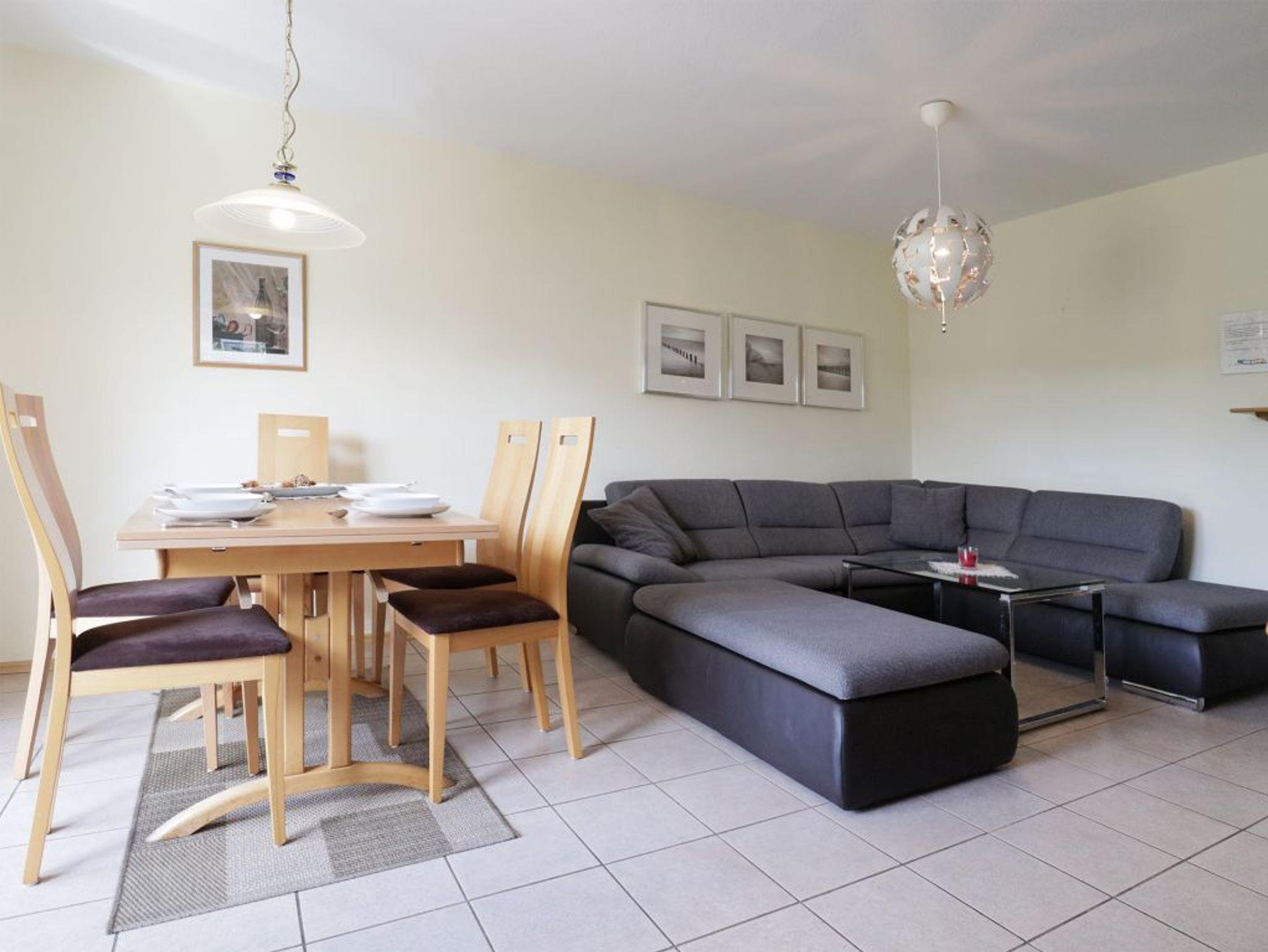 Diese komfortabel eingerichtete 3-Zimmer-Ferienwohnung liegt im Erdgeschoss! Mit einer großzügigen Wohnfläche von 68 qm bietet die Wohnung Platz für bis zu 5 Personen und ist ideal für Familien. Genießen Sie die sonnige Terrasse mit einem gemütlichen Strandkorb, ideal für erholsame Urlaubsmomente an frischer Ostseeluft. Der geräumige Wohnbereich lädt mit einer bequemen Sofagarnitur, Fernseher und Radio zum Entspannen ein. Kostenfreies WLAN steht Ihnen ebenfalls zur Verfügung. Die separate Küche ist vollständig ausgestattet und bietet alles, was Sie für die Zubereitung Ihrer Mahlzeiten benötigen: Ceranherd, Backofen, Mikrowelle, Kühlschrank mit integriertem Gefrierfach sowie Kaffeemaschine, Wasserkocher, Toaster und Geschirrspüler. Genießen Sie Ihre Mahlzeiten am Esstisch im Wohnbereich oder auf der Terrasse mit Blick in den hauseigenen Garten mit Grillmöglichkeit. Die beiden separaten Schlafzimmer sind einmal mit einem Doppelbett, Kleiderschrank sowie das zweite mit zwei Einzelbetten, Kleiderschrank möbliert. Außerdem kann ein Beistellbett als 5. Schlafplatz genutzt werden. Für Kleinkinder stehen ein Kinderhochstuhl, Kinderreisebett und ein Bollerwagen bereit ?alles kostenfrei. Das Tageslicht-Duschbad verfügt über einen Waschtisch, Fön und WC. Zudem ist in der Wohnung ein Gäste-WC vorhanden. Eine Waschmaschine und ein Waschtrockner können gegen Gebühr im Haus genutzt werden. Ihr PKW findet kostenfrei auf dem hauseigenen Außenstellplatz direkt vor der Wohnung Platz. Rauchen ist eingeschränkt gestattet. Haustiere sind nicht erlaubt.