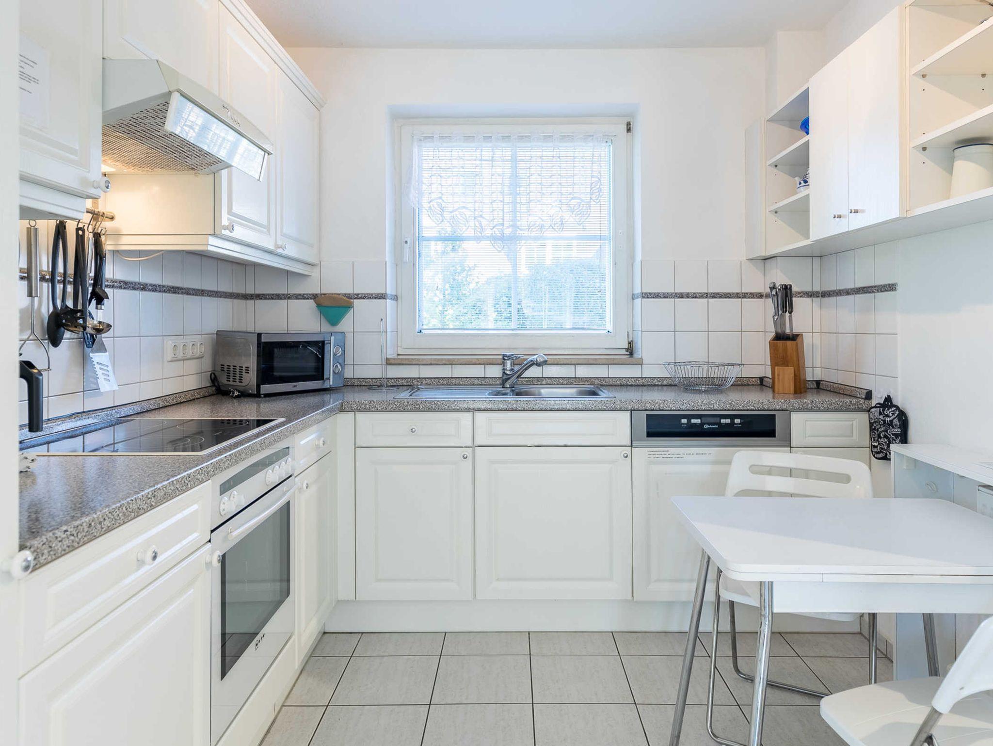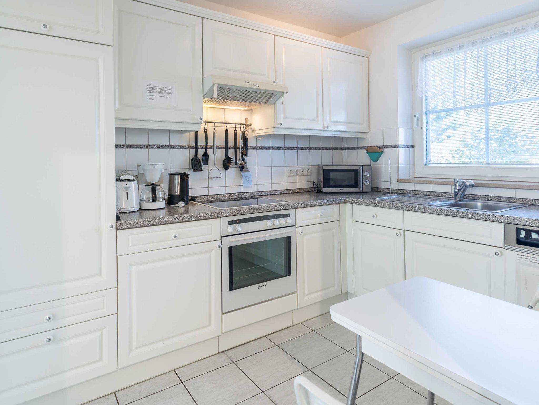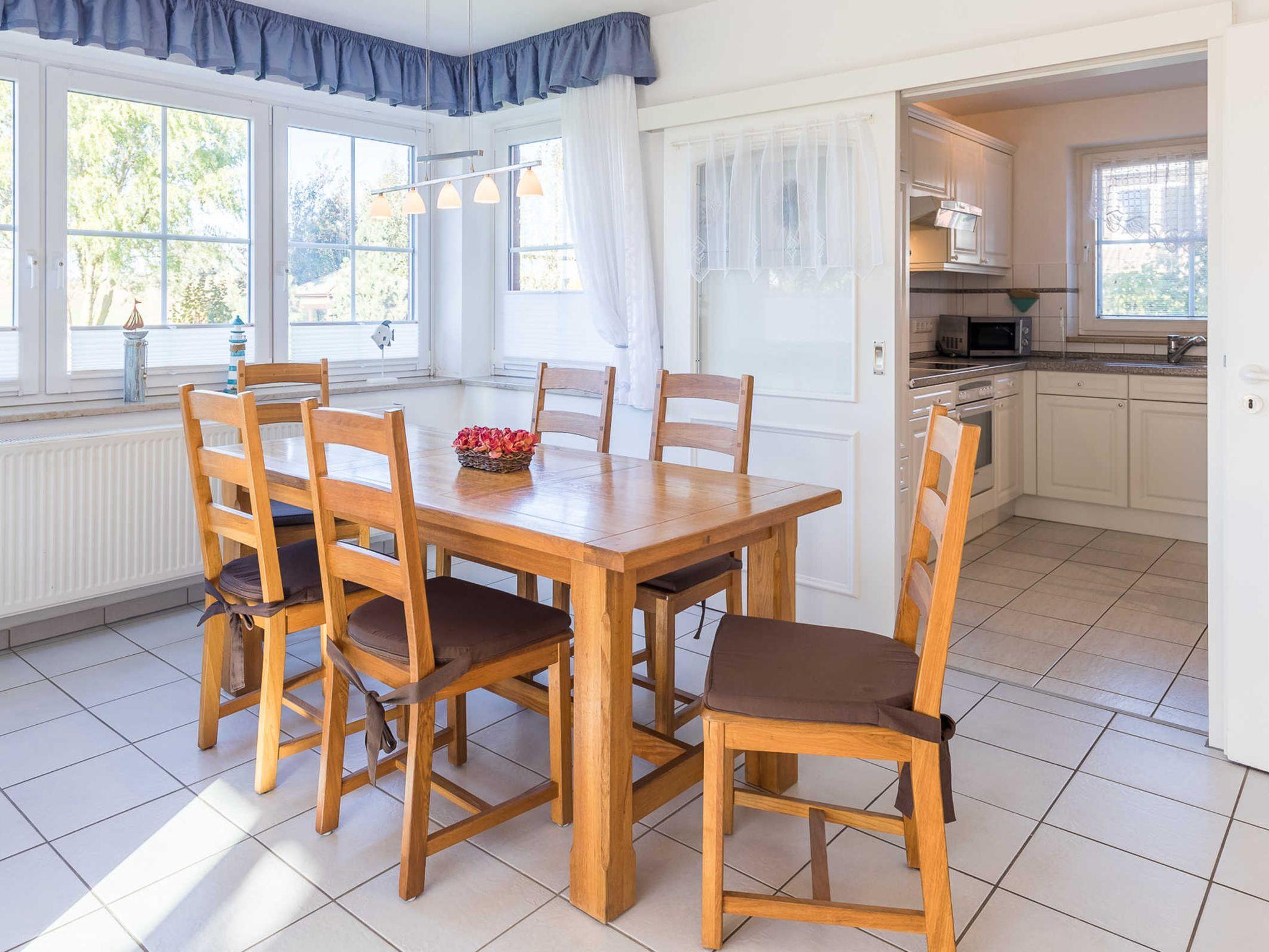 Die weiße Küche im Landhausstil ist mit allen Annehmlichkeiten und nützlichen Gerätschaften komplett ausgestattet. Am großen Esstisch finden 6 Personen Platz, bei Bedarf kann der Tisch noch vergrößert werden.