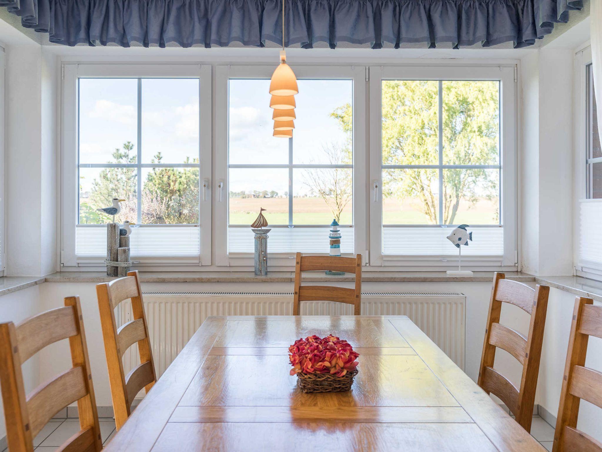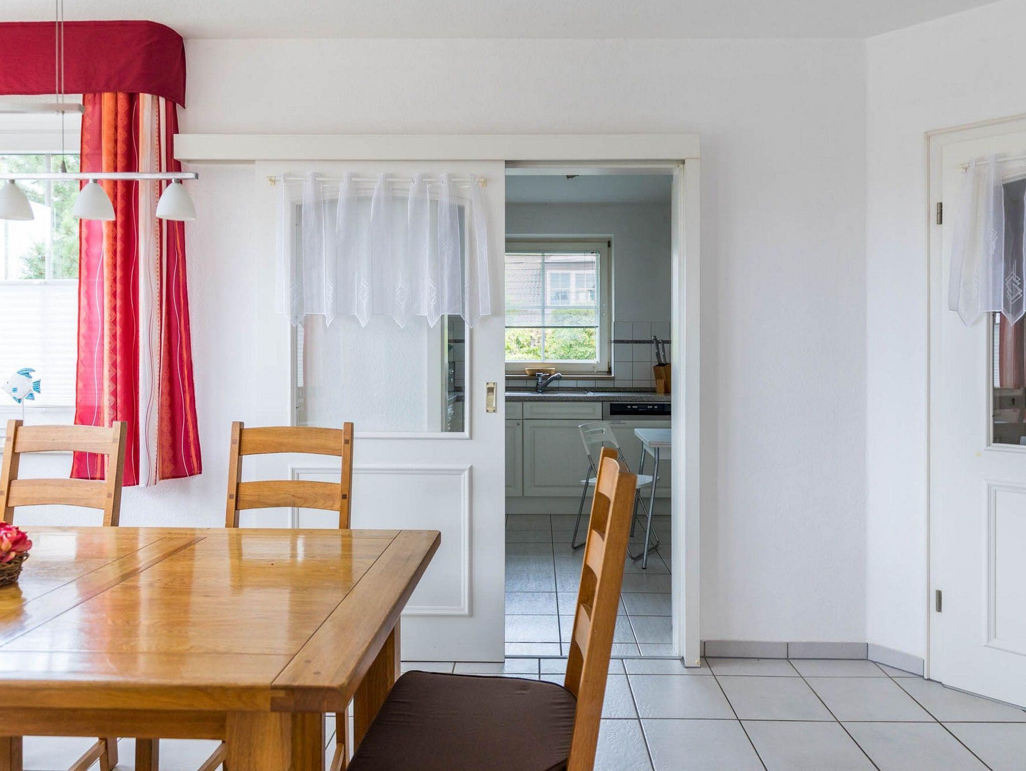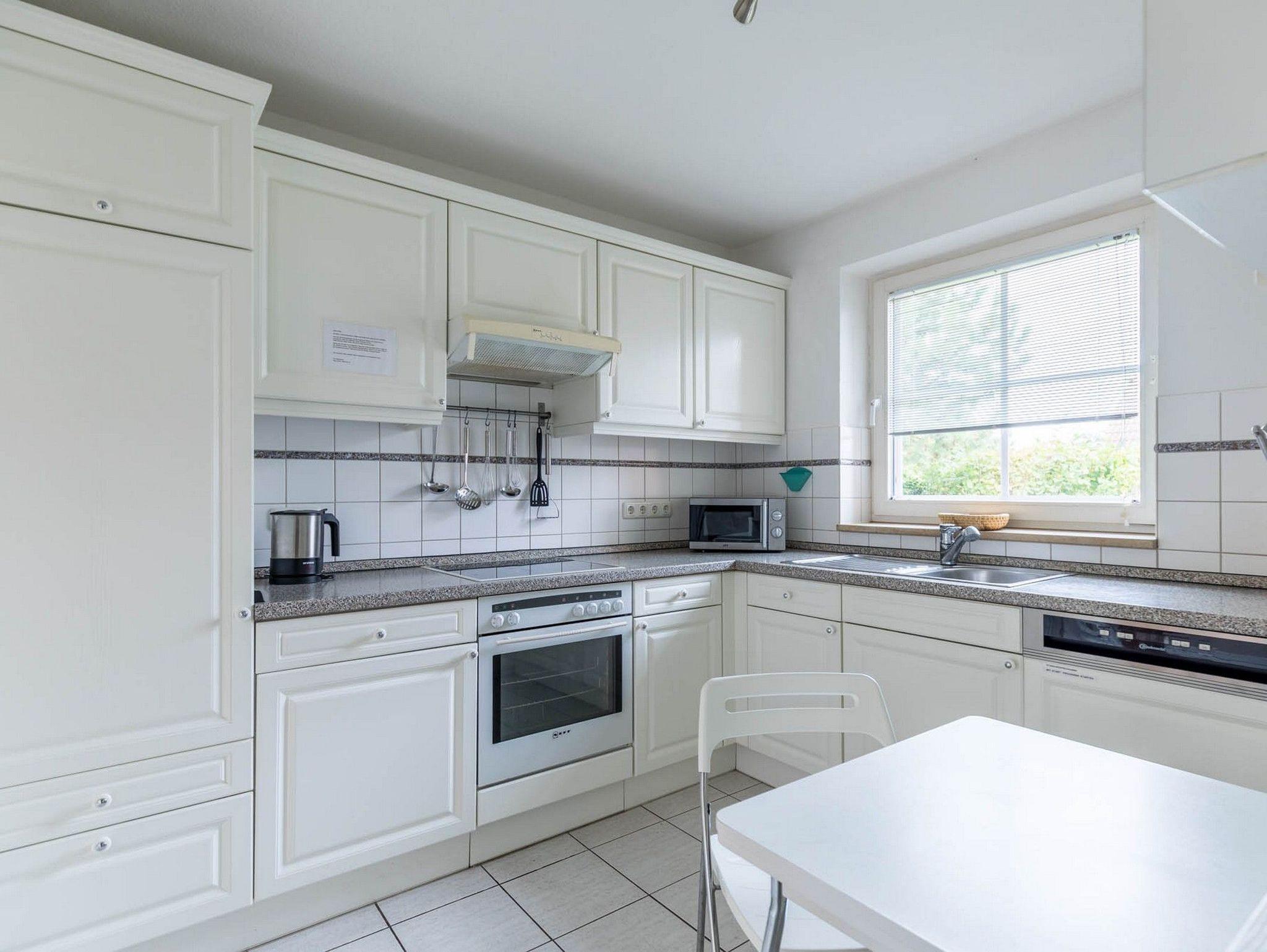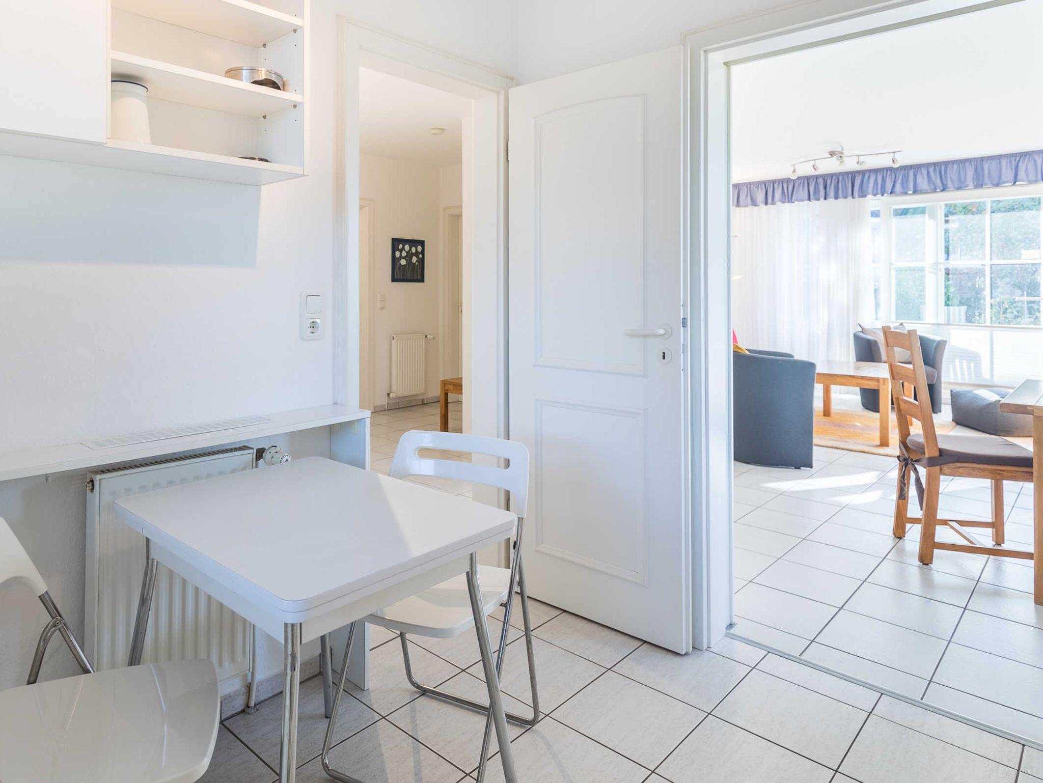 Die weiße Küche im Landhausstil ist mit allen Annehmlichkeiten und nützlichen Gerätschaften komplett ausgestattet. Am großen Esstisch finden 6 Personen Platz, bei Bedarf kann der Tisch noch vergrößert werden.