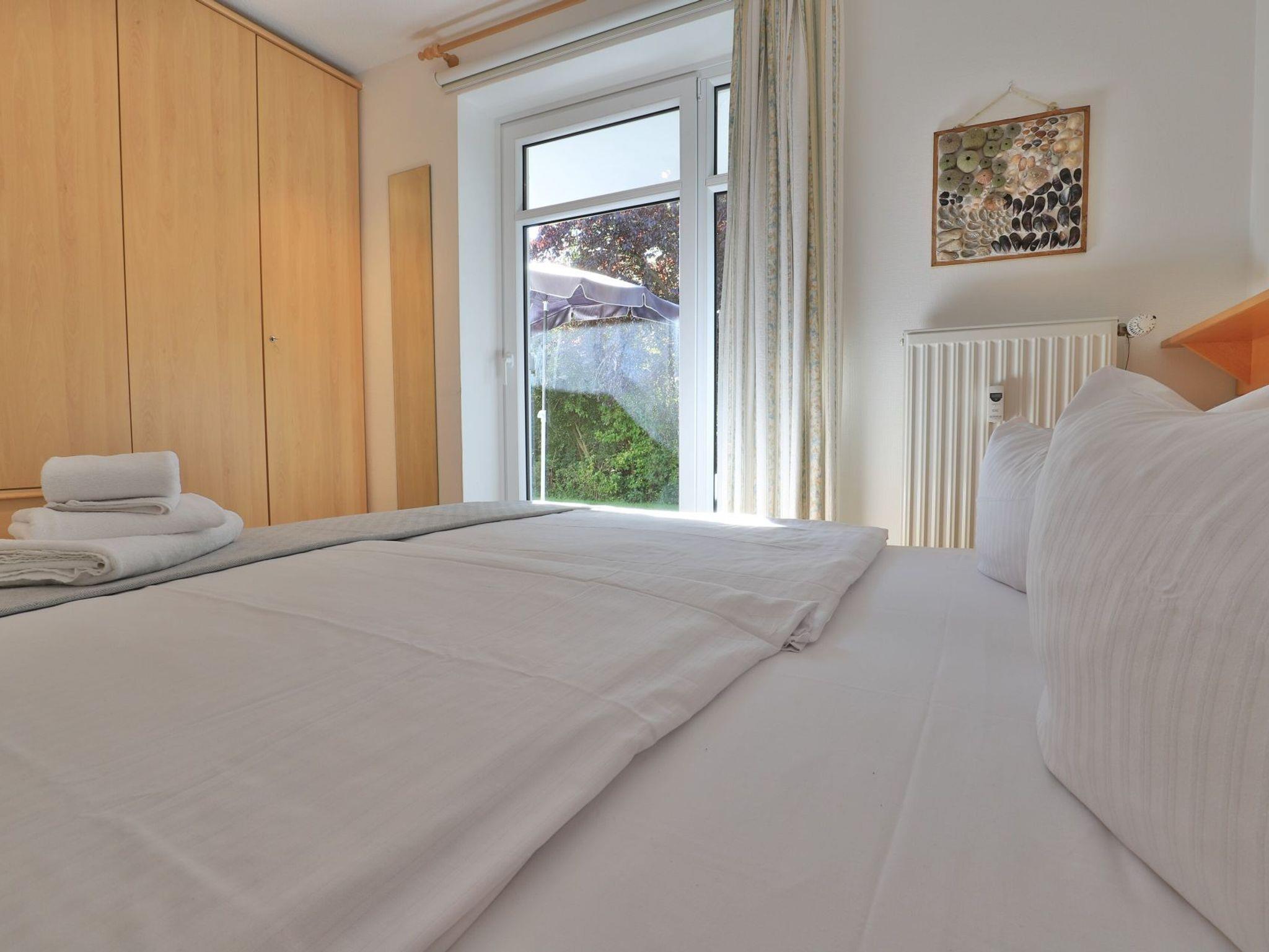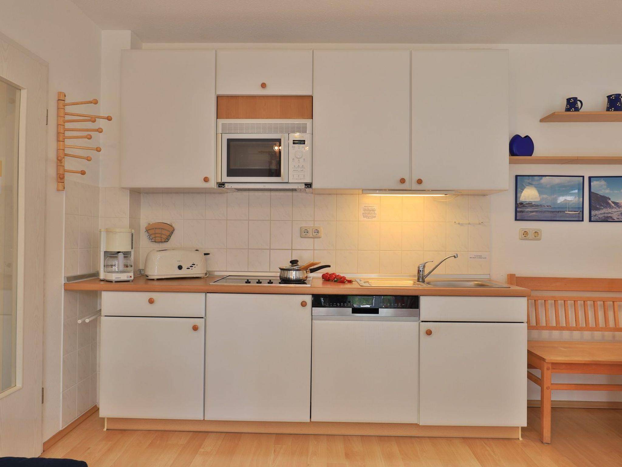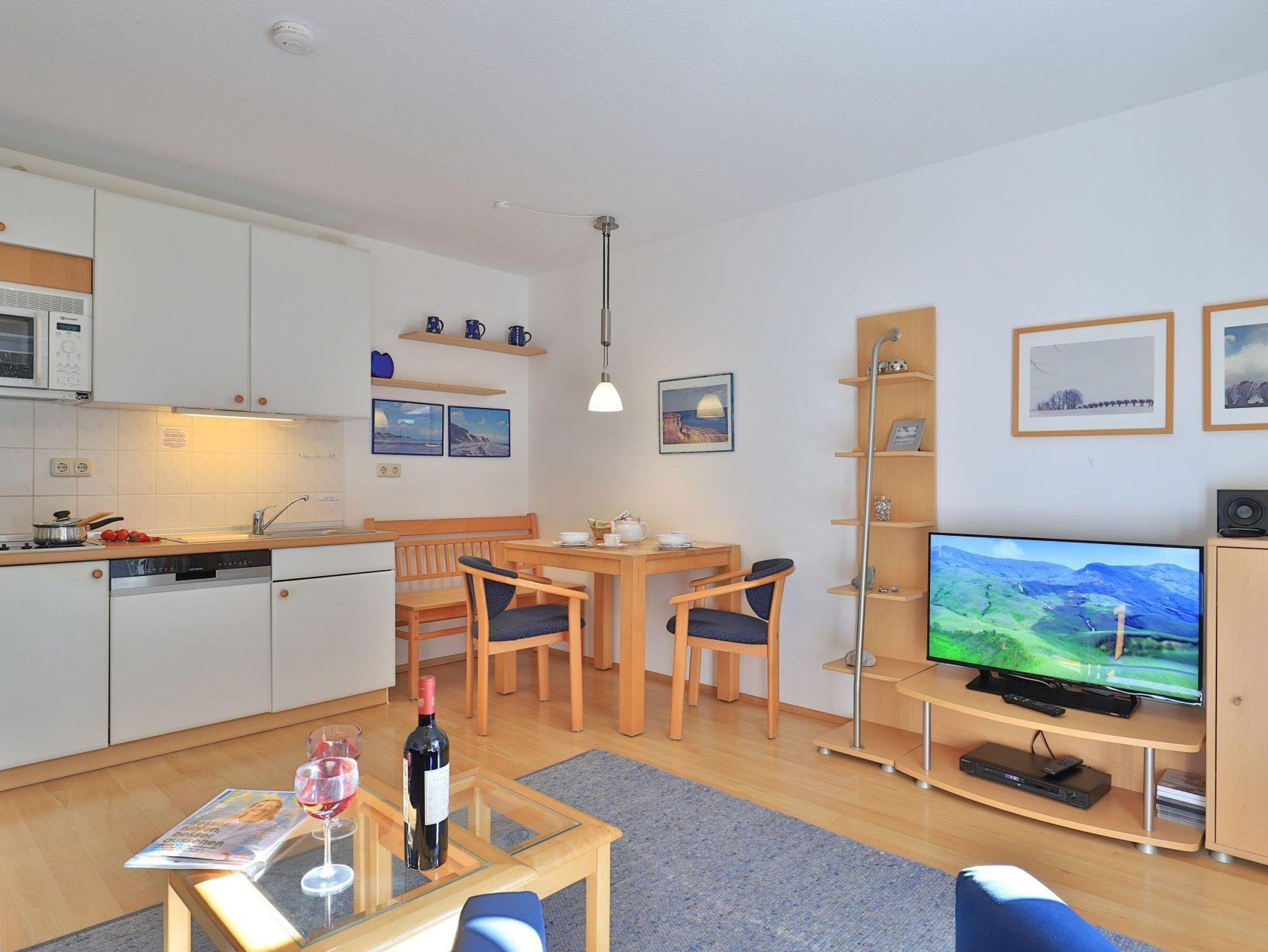 Für Unterhaltung sorgen ein Fernseher, DVD-Player, wie auch eine Musikanlage. WLAN nutzen Sie kostenfrei. Die in den Wohnbereich integrierte Küchenzeile ist voll ausgestattet mit einem Herd, Mikrowelle, Geschirrspüler sowie Wasserkocher, Kaffeemaschine, Toaster usw. Für gemeinsame Mahlzeiten ist ein Esstisch im Wohnbereich platziert. Des Weiteren bietet das Appartement ein separates Schlafzimmer mit bodentiefen Fenstern. Sie schlafen in einem bequemen Doppelbett 1,60m x 2,00m. Ein großer Kleiderschrank ist im Schlafzimmer ebenfalls vorhanden. Zugehörig ist ein innenliegendes Bad mit bodentiefer Dusche, Waschtisch und WC. Für Ihr Fahrzeug ist ein kostenfreier PKW-Außenstellplatz am Haus reserviert und auch ein abschließbarer Fahrradschuppen gehört zum Angebot.