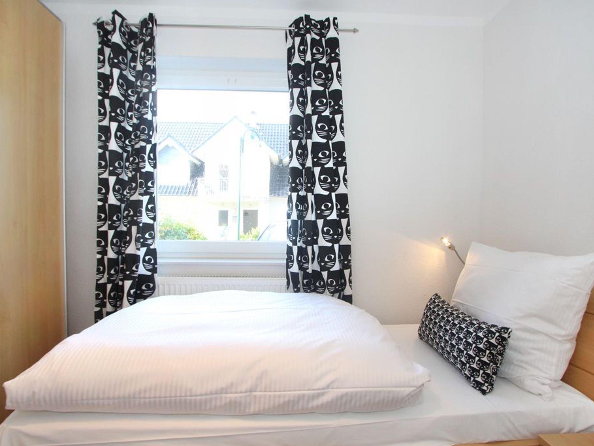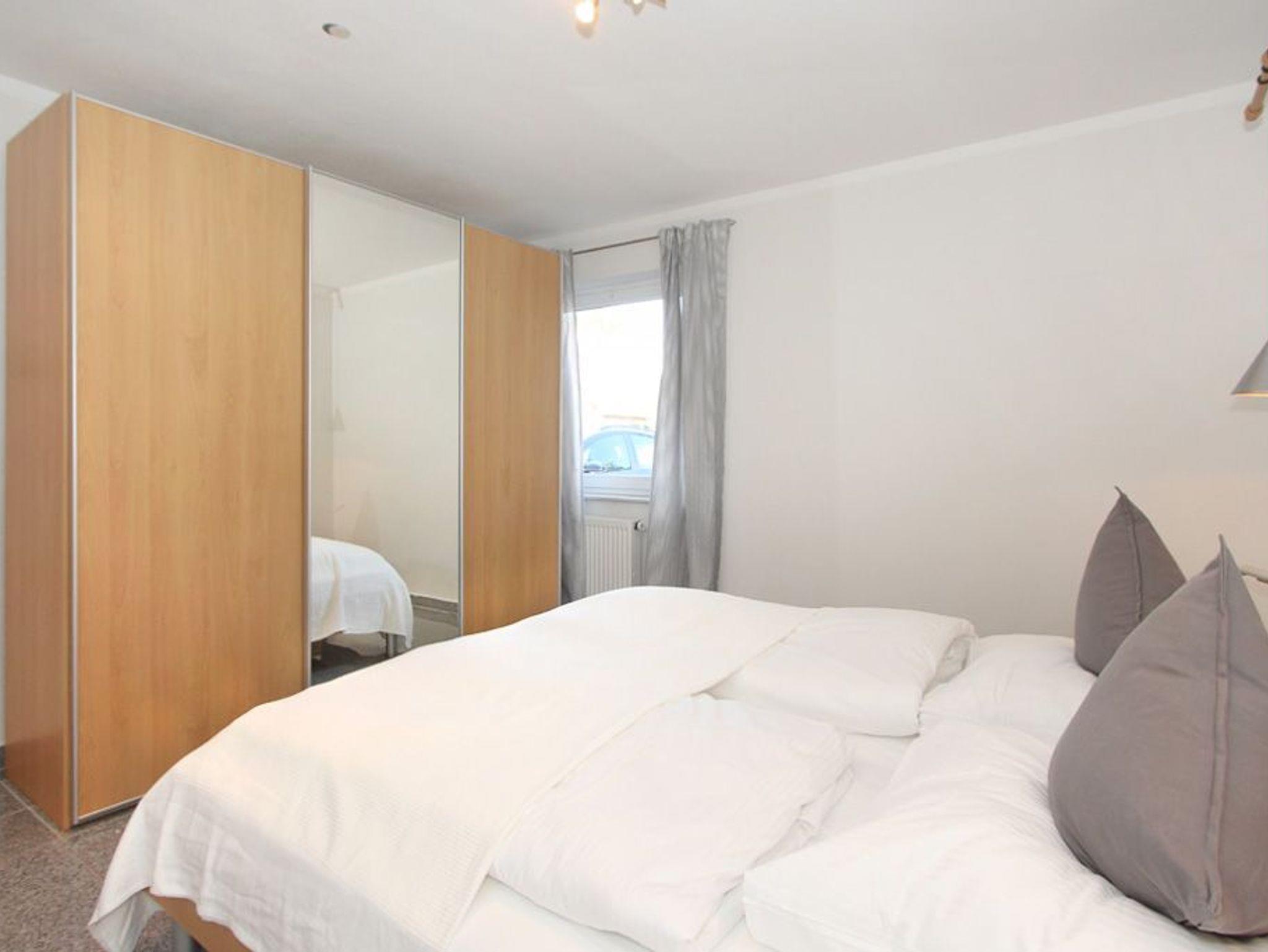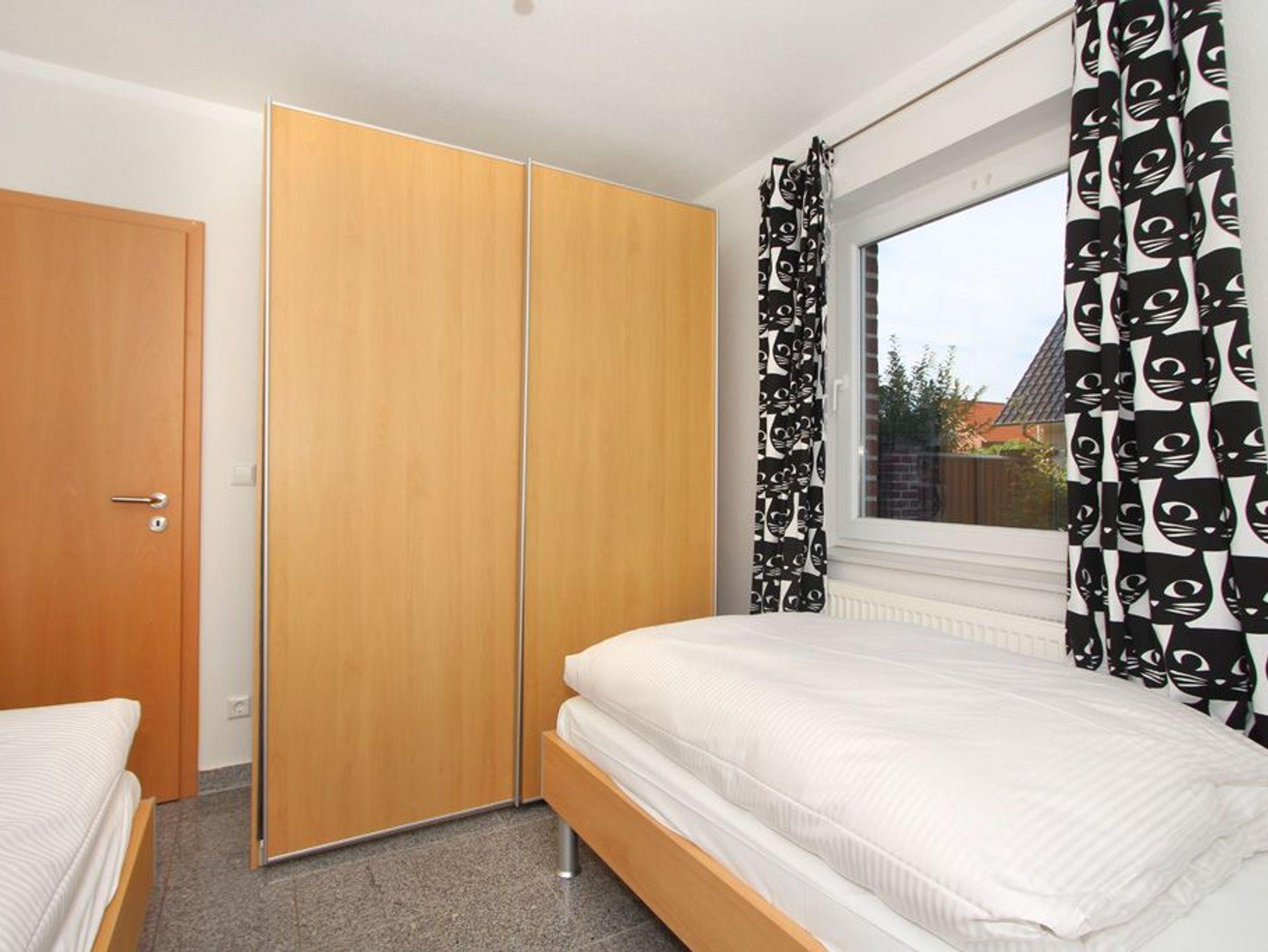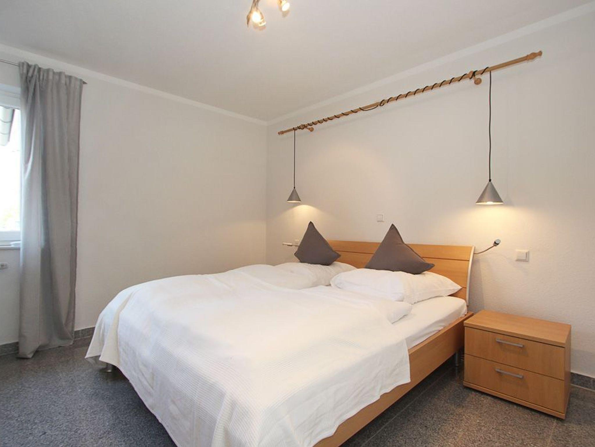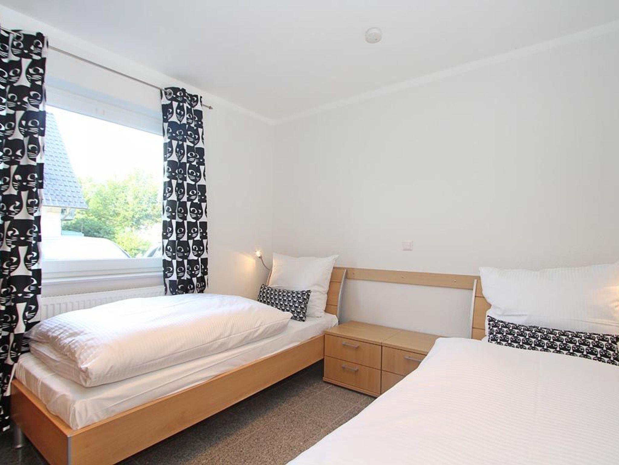 Das Schlafzimmer bietet ein Doppelbett (180x200cm), einen großen Kleiderschrank und Platz für das Reisebettchen. Im Gäste-/ Kinderzimmer befinden sich 2 Einzelbetten (je 90x200cm) und ebenfalls ein Kleiderschrank.
