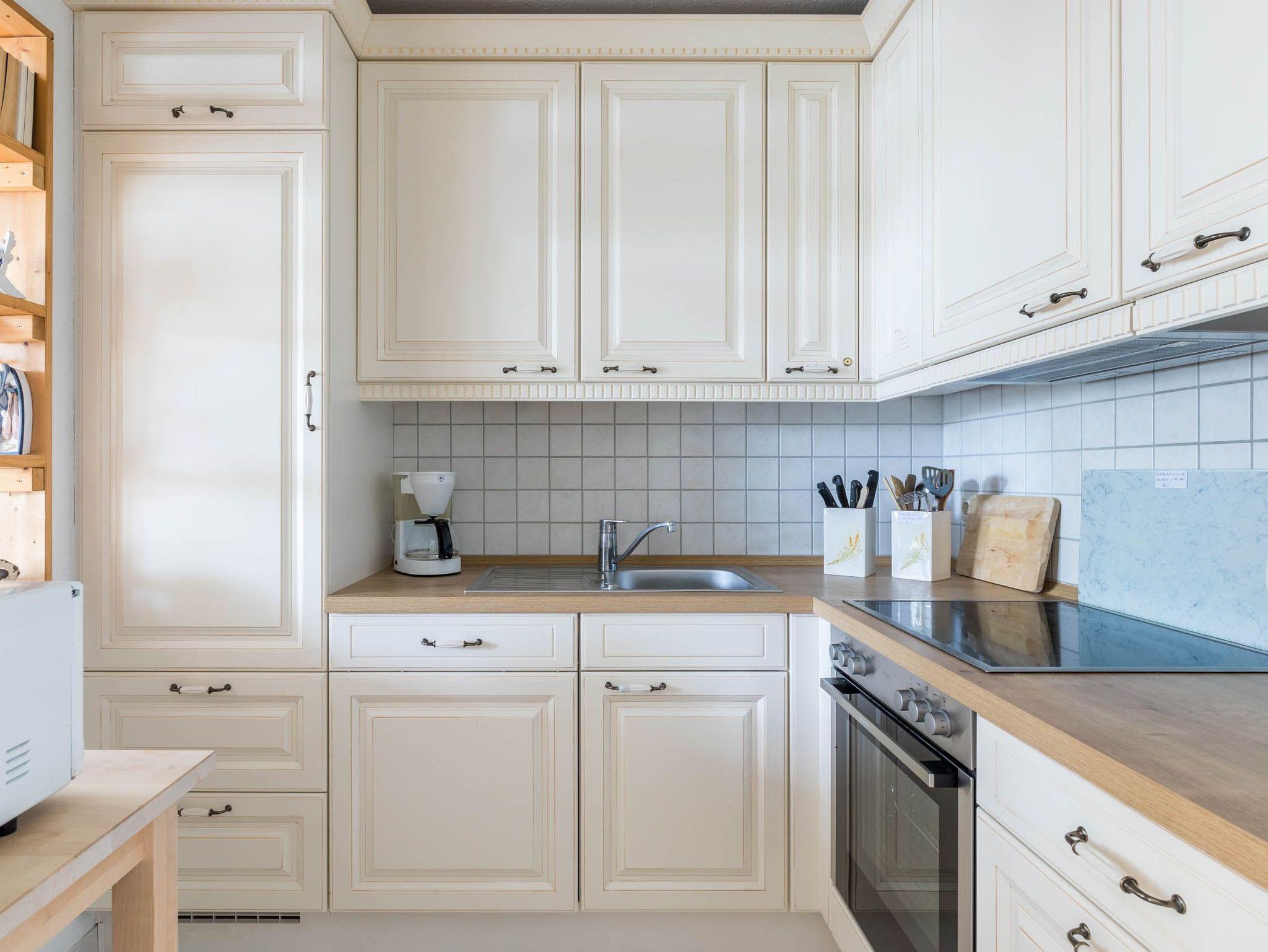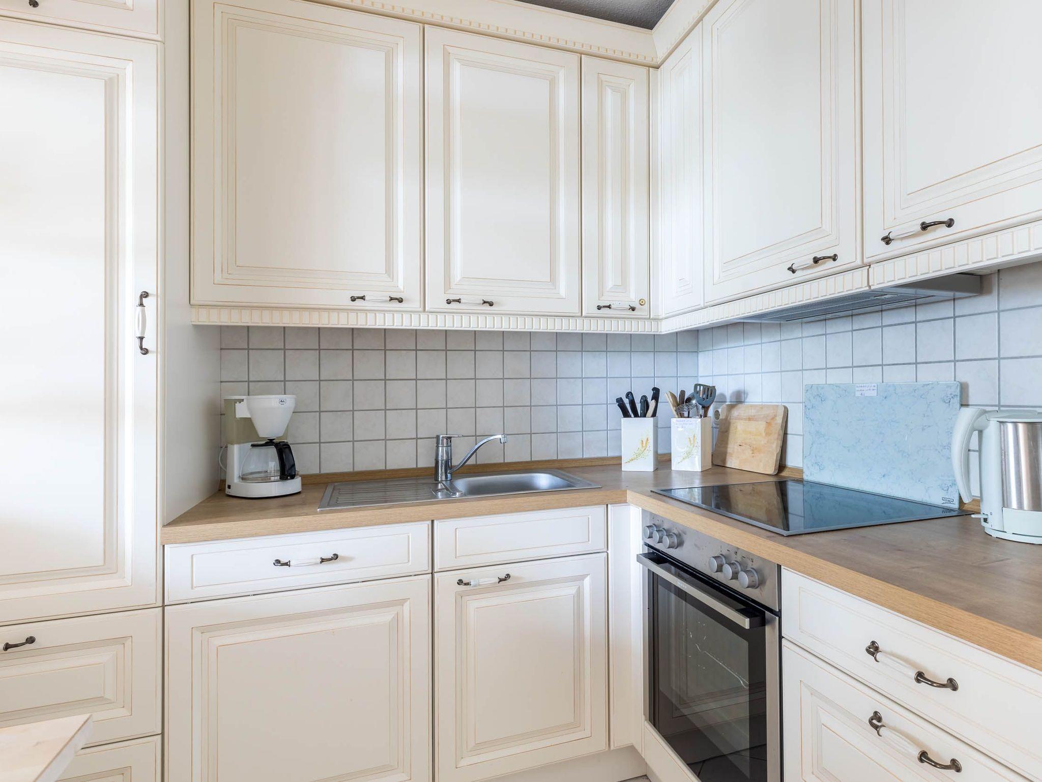Die räumlich etwas abgeteilte, dennoch offene Küche ist neben dem Herd (Ceranfeld), Backofen und Kühlschrank mit Gefrierfach ebenso mit Geschirrspüler, Kaffeemaschine, und Toaster ausgestattet.