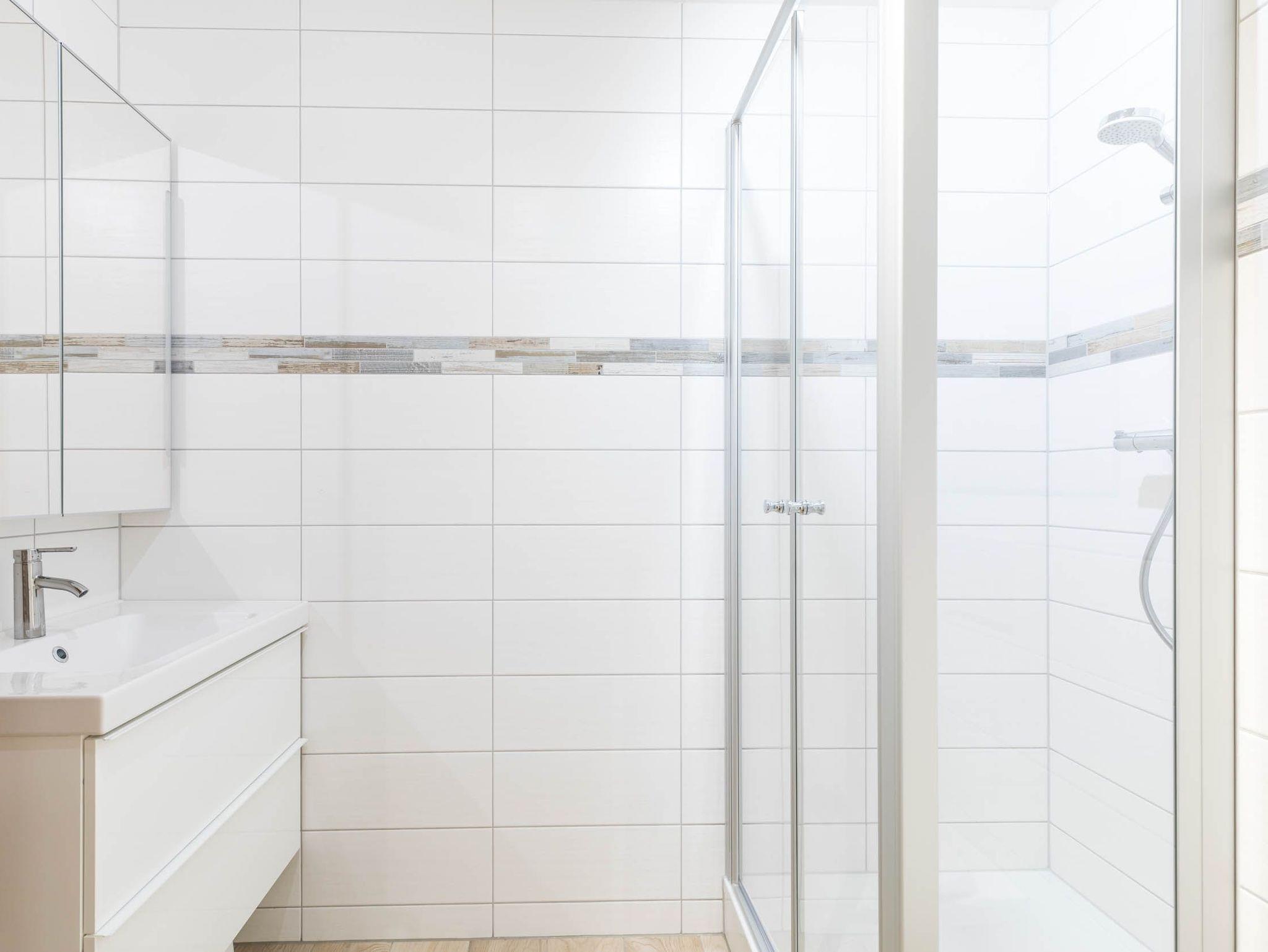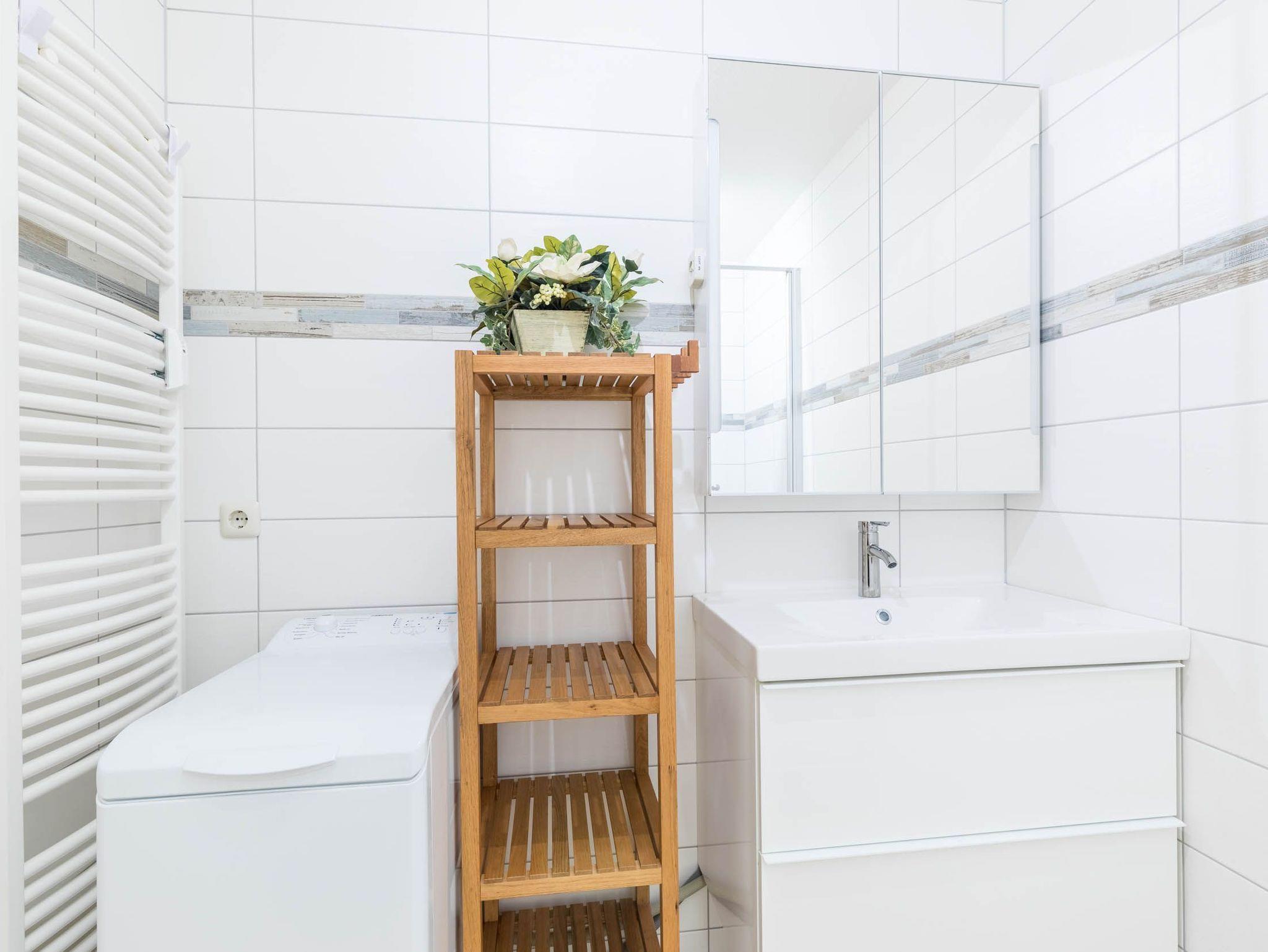 Im hell gefliesten Bad befinden sich eine Dusche, Waschmaschine, Waschbecken und WC.