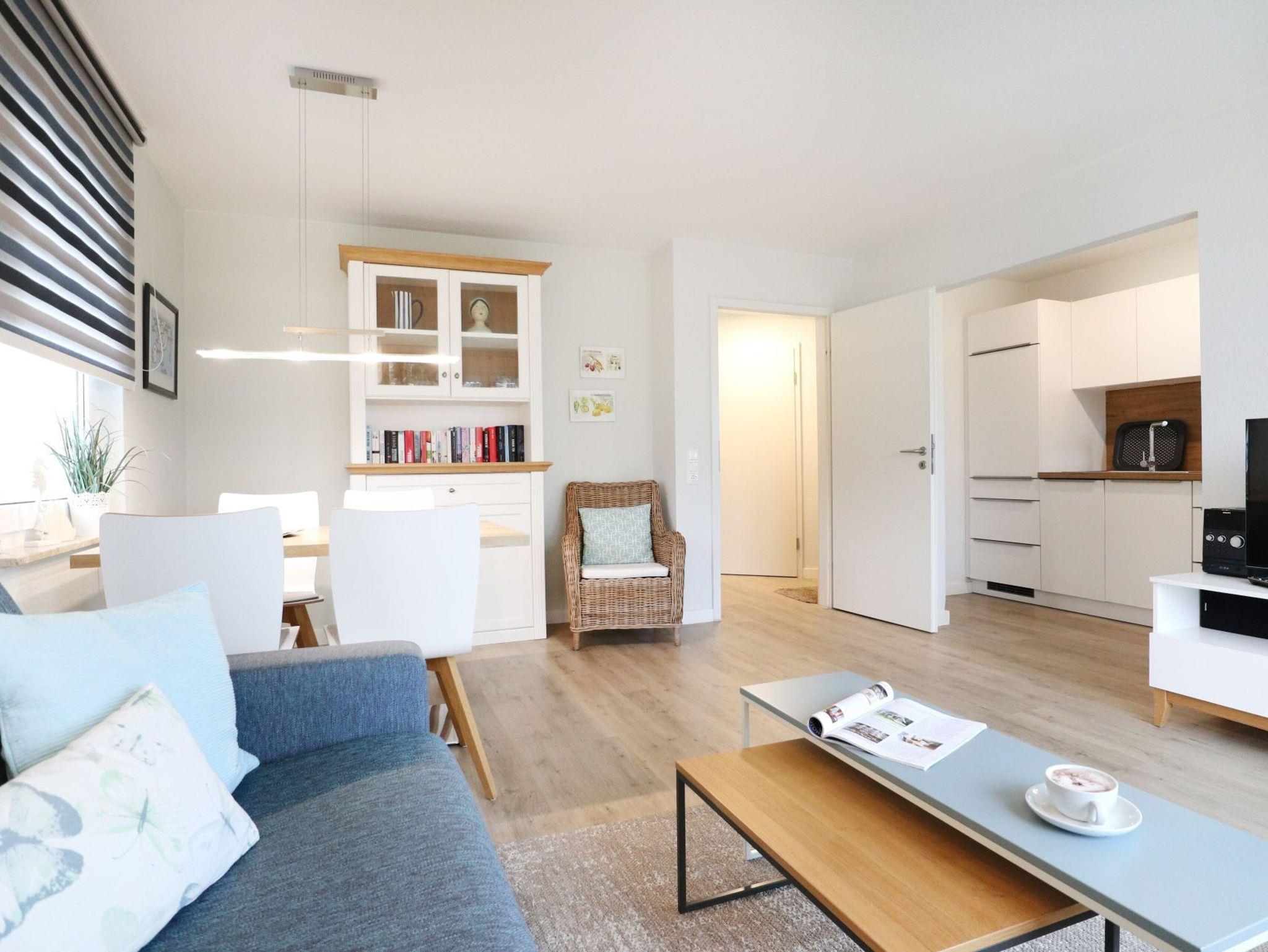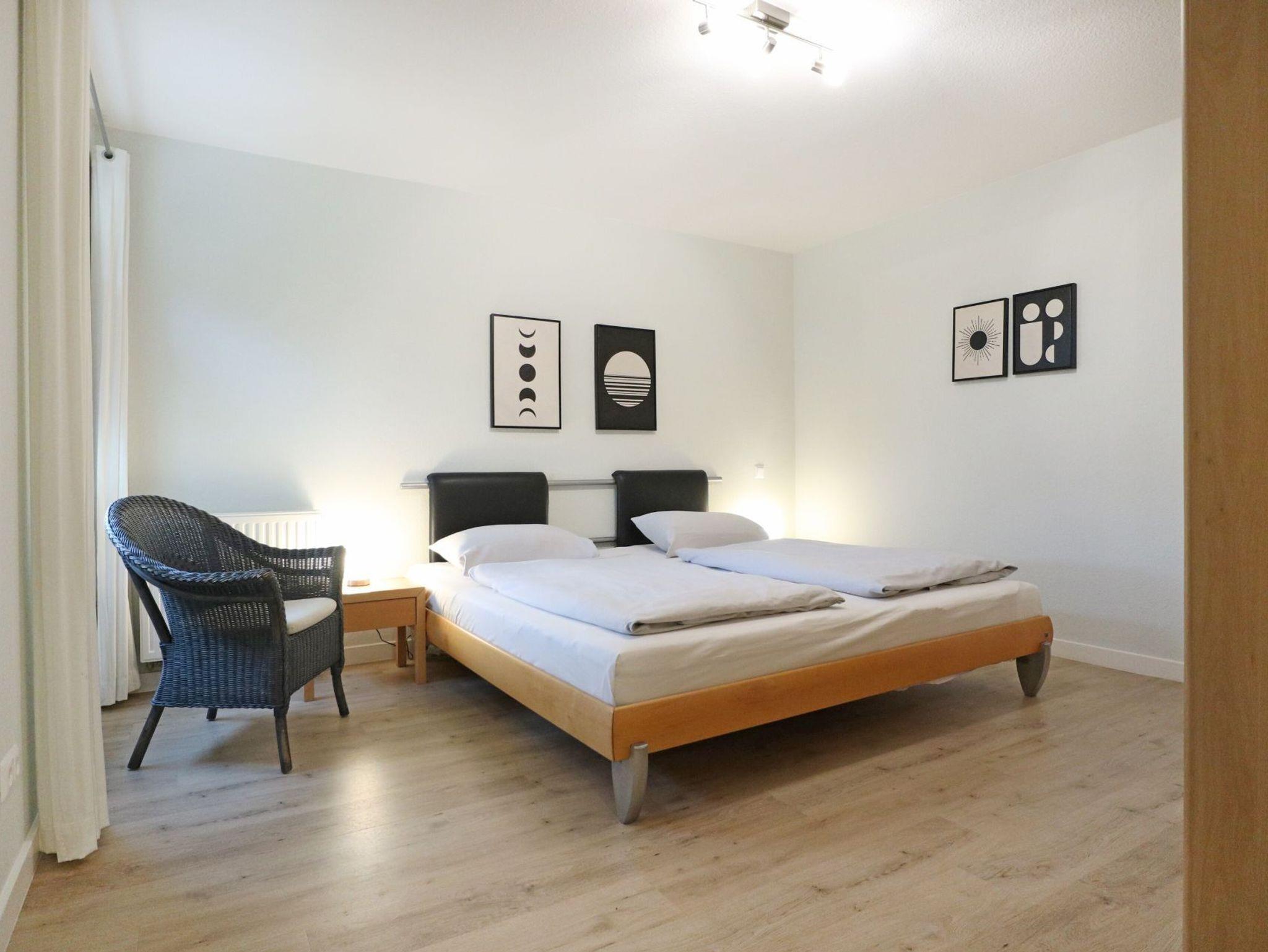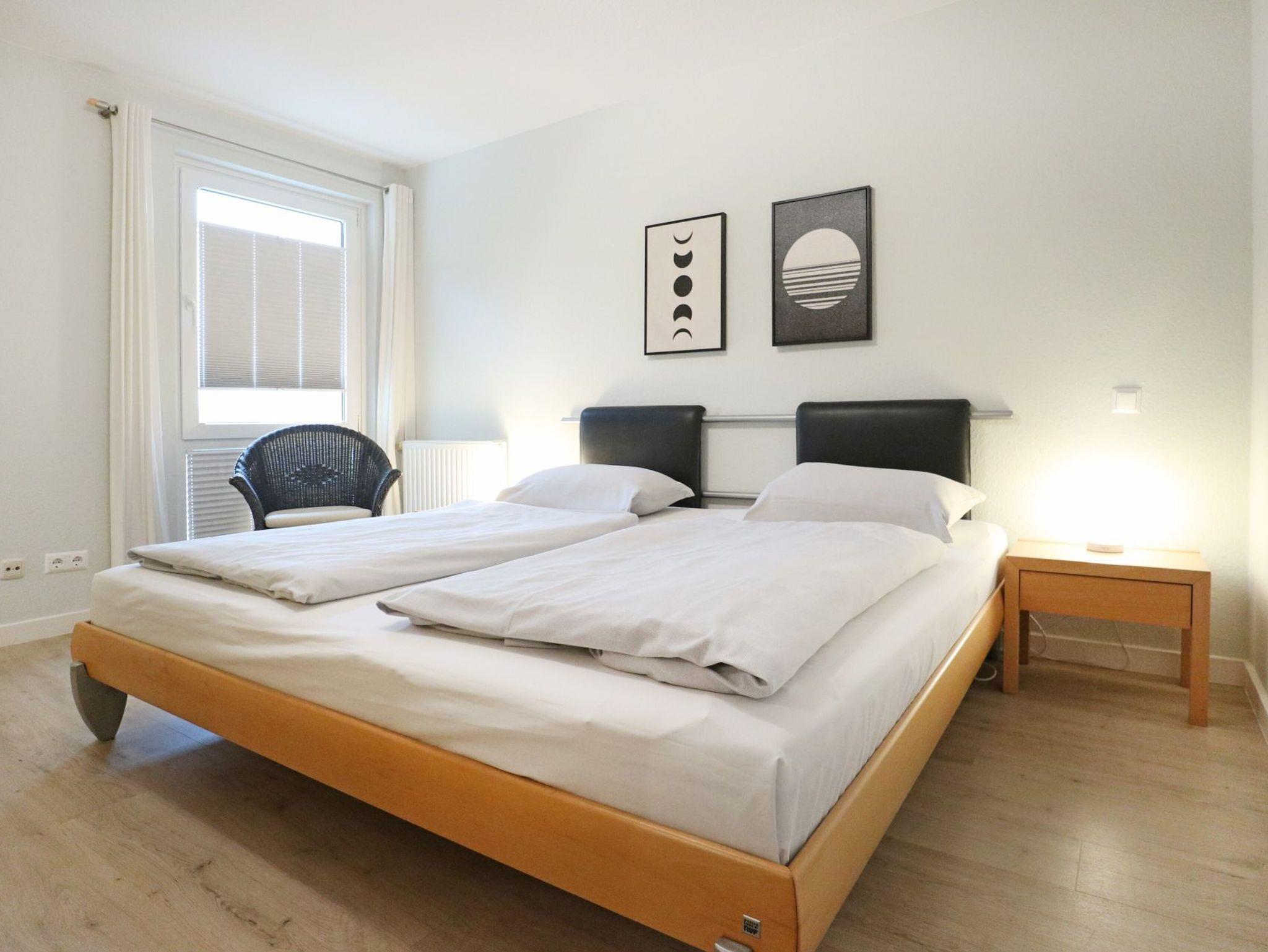 Modernes Nichtraucherappartement für bis zu 4 Personen mit einer Wohnfläche von 52qm. Sonniger Balkon in Süd-West Ausrichtung. Die Möblierung ist im jungen Design gehalten und bietet ein ausziehbares Sofa mit zwei zusätzlichen Schlafgelegenheiten ? 1,60 x 2,00 - zwei Sessel, Beistelltisch, Esstisch, Fernseher, Musikanlage und kostenfreies WLAN. Die gut ausgestattete, integrierte Küchenzeile ist vom Wohnzimmer leicht getrennt - Ceranfeldherd, Backofen, Dunstabzug, Geschirrspüler sowie Kleingeräte wie Kaffeemaschine u.s.w. sind selbstverständlich auch vorhanden. In dem separaten Schlafzimmer mit Doppelbett steht zudem ein Kleiderschrank für Ihre Garderobe bereit. Das Duschbad mit WC ist hell gefliest. Für Ihren PKW ist ein kostenfreier Stellplatz reserviert und auch ein Fahrradabstellraum gehört zum Angebot. Bitte beachten Sie, dass es sich um eine Nichtraucher Wohnung handelt, in der Haustiere nicht erlaubt sind. Einkaufsmöglichkeiten befinden sich in naher Umgebung.