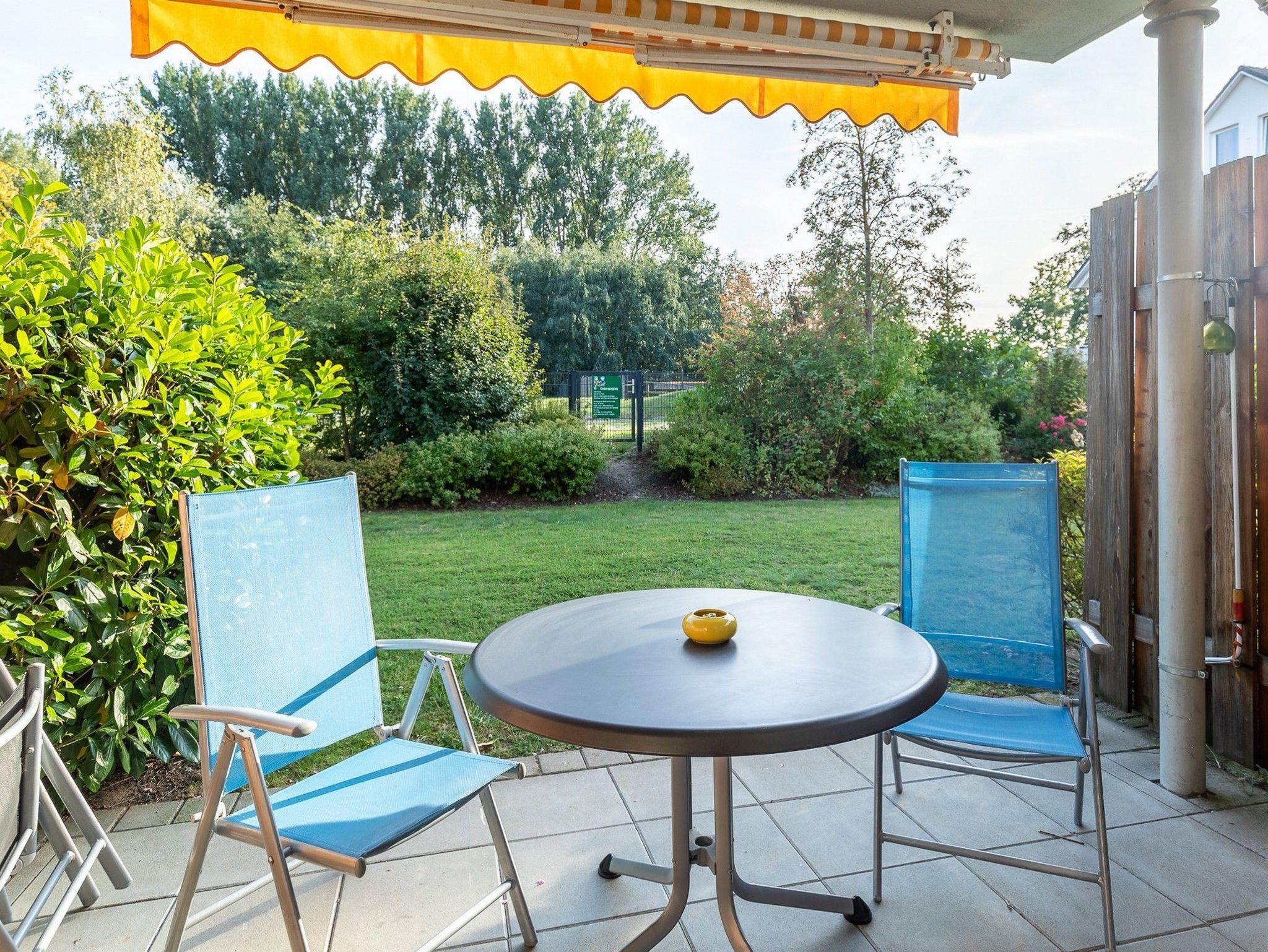 Der direkte Terrassenzugang mit der möblierten Süd-Terrasse bietet einen schönen Blick ins Grüne.