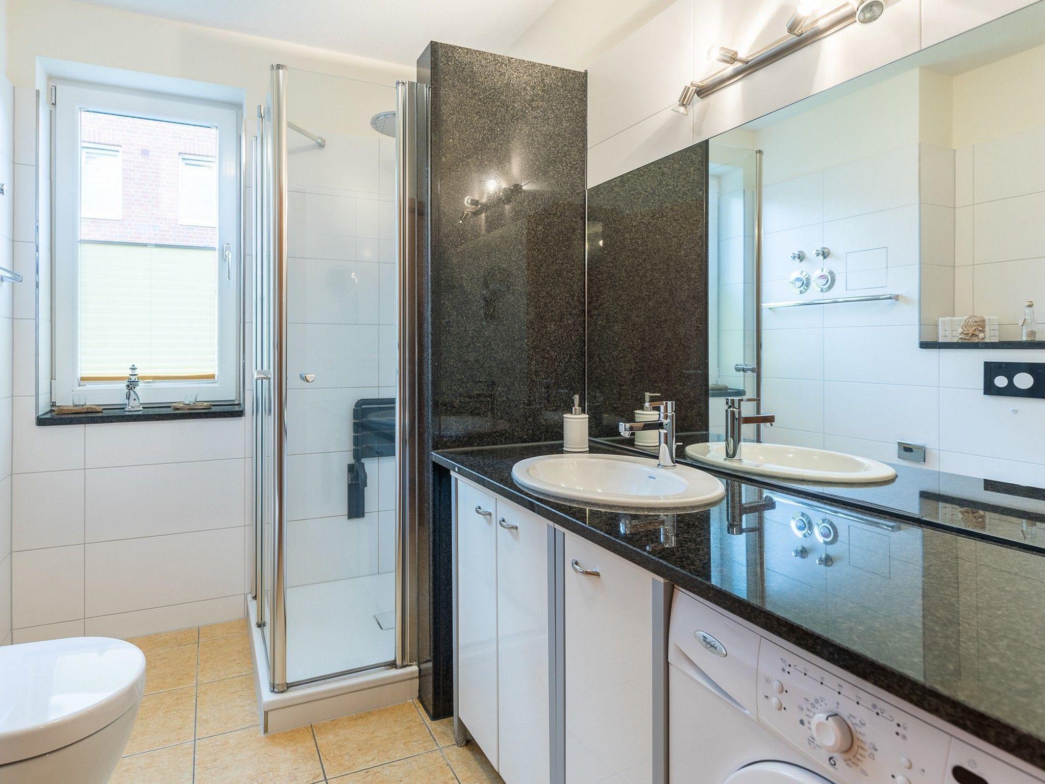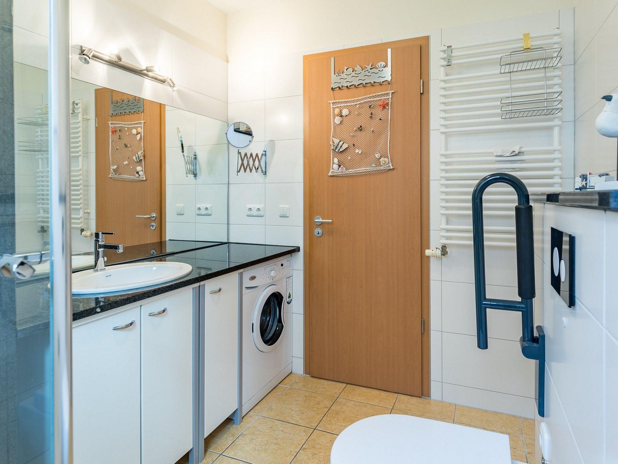 Im Badezimmer beeindruckten der große Spiegel, die Waschmaschine und die Fußbodenheizung. Es gibt eine Dusche und einen großzügigen Waschtisch.