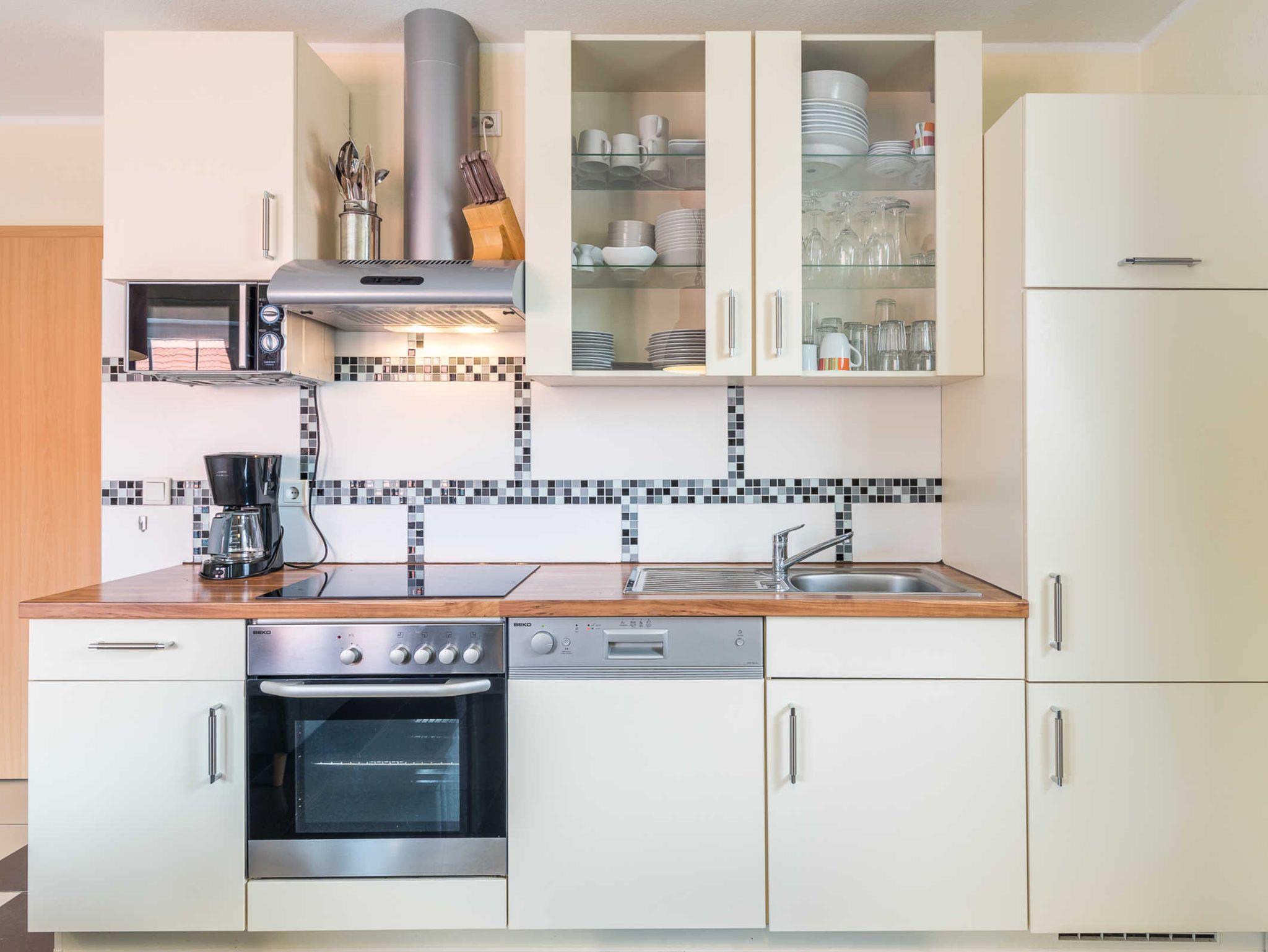 Die gut ausgestattete offene Küchenzeile lädt zum gemeinsamen Kochen ein.