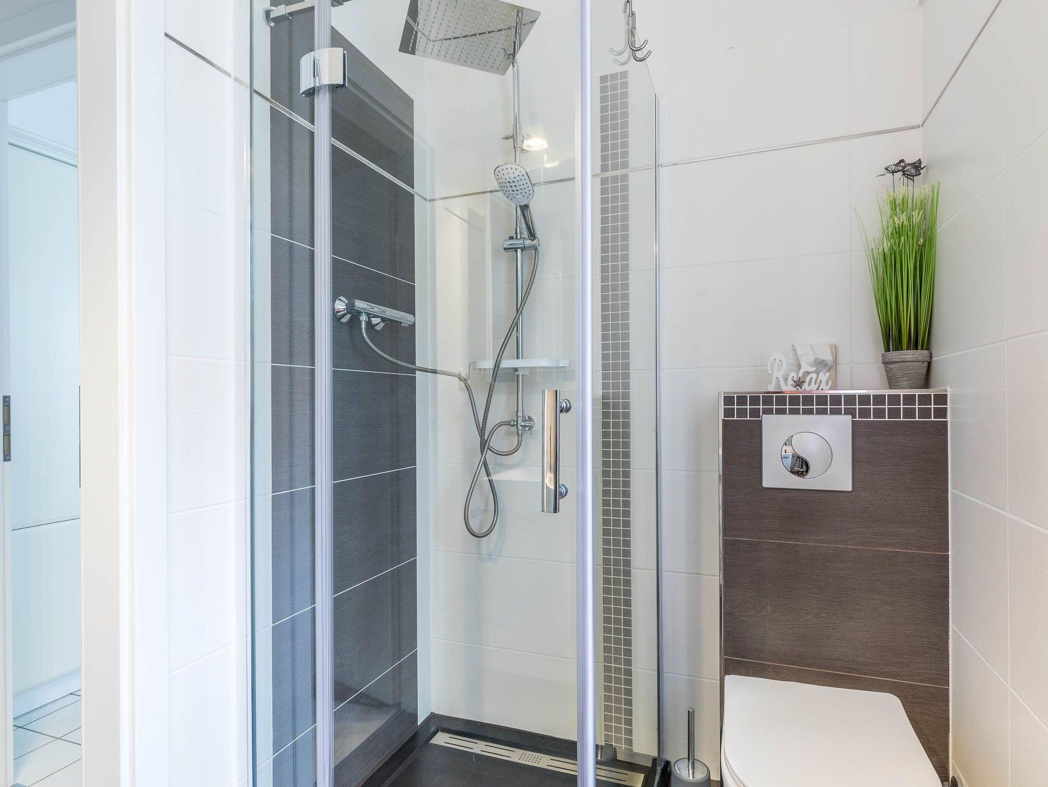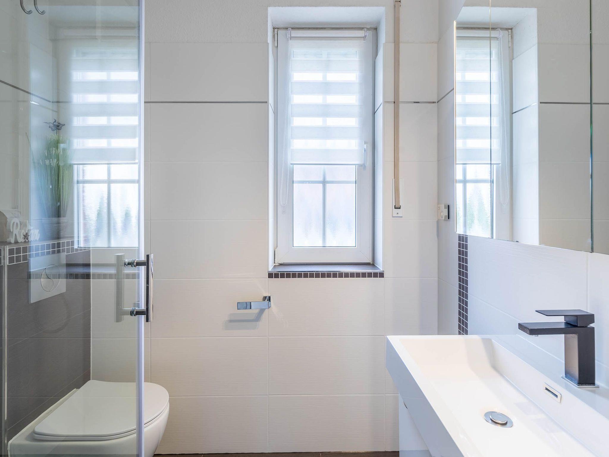 Das hell geflieste Badezimmer mit viel Tageslicht ist mit Dusche, WC und Waschtisch ausgestattet.
