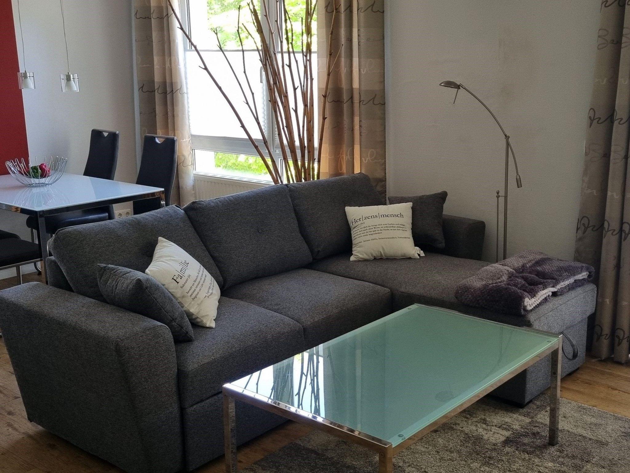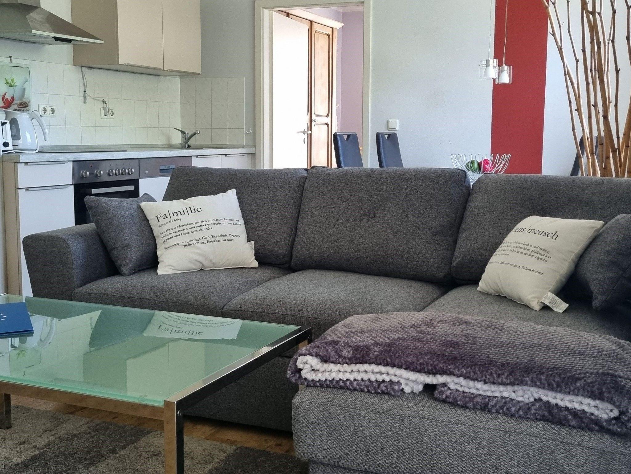 Der Wohnraum ist modern und funktionell eingerichtet (Couch mit Schlaffunktion, Telefon, Stereoradio mit Abspielmöglichkeit CD, DVD, iPhone und USB- Stick sowie LED-TV mit Empfang von u.a. sky Cinema, sky Fußball Bundesliga, Sport 1). Den Zugangscode für den kostenlosen WLAN Zugang erhalten Sie bei der Anreise. Für die Kleinen stehen Bücher und Spiele bereit.