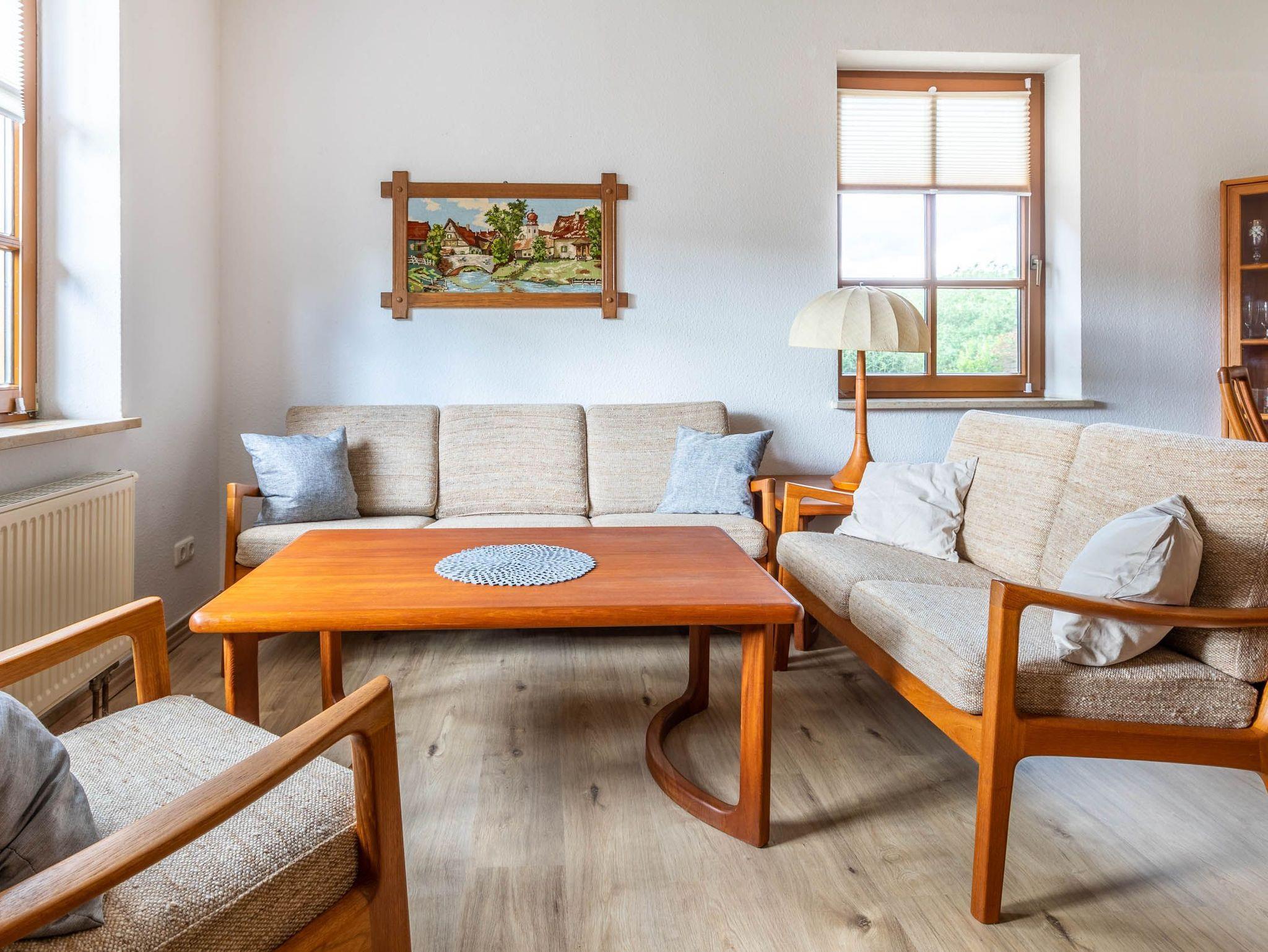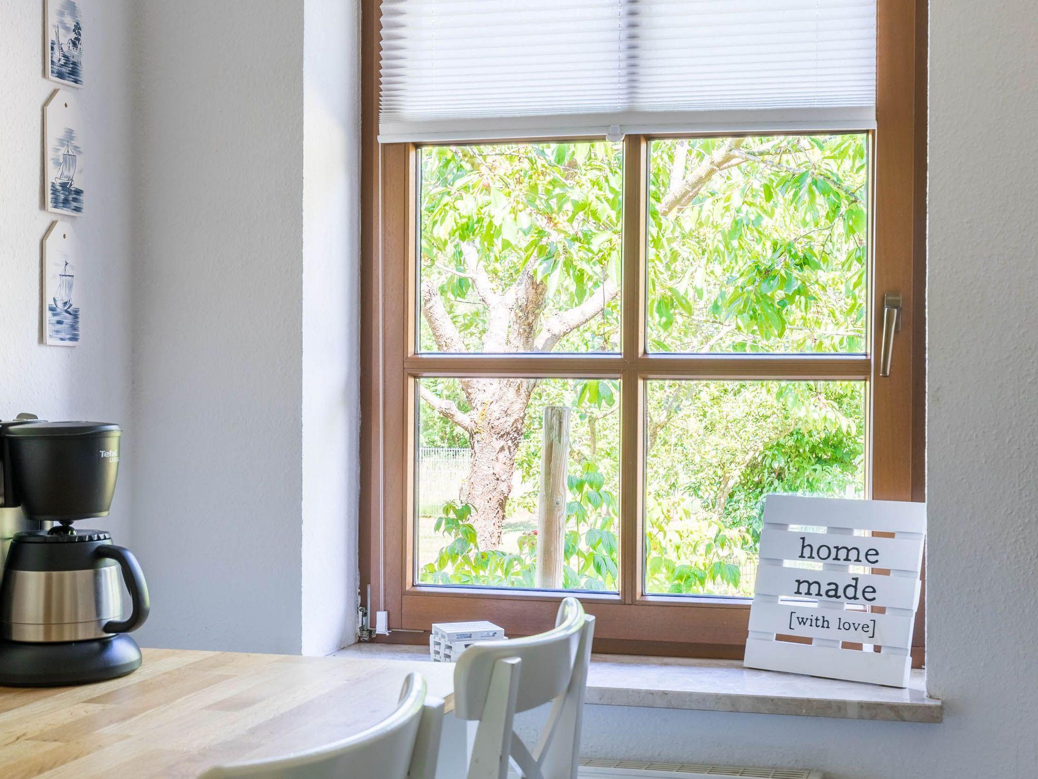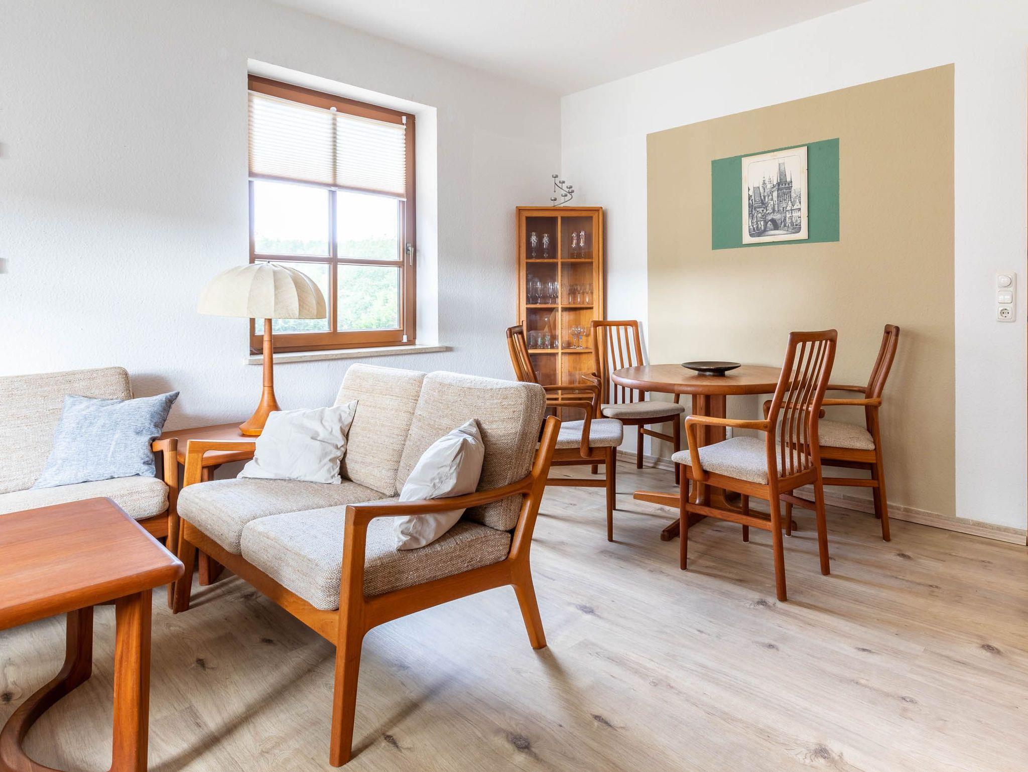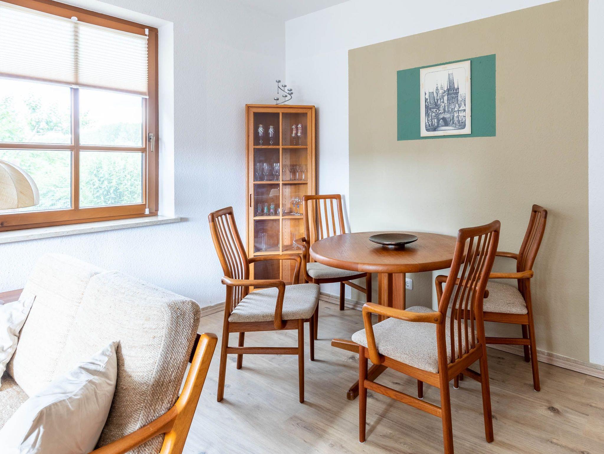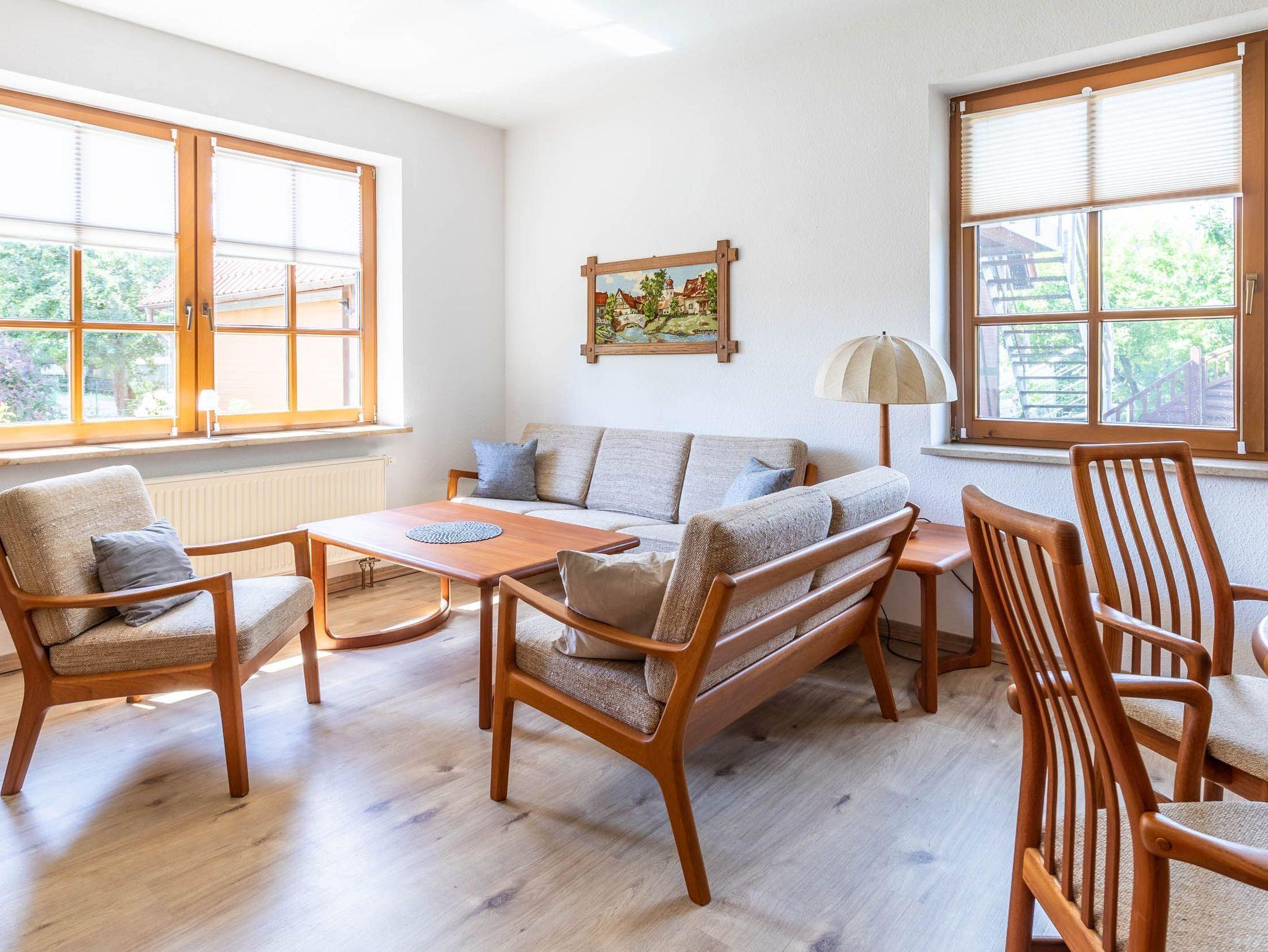 Viele Fenster sorgen für viel Tageslicht. Die Wohnung verfügt im Erdgeschoss über einen gemütlich eingerichteten Wohn- und Essbereich mit SAT-TV und einer bequemen Sofaecke.