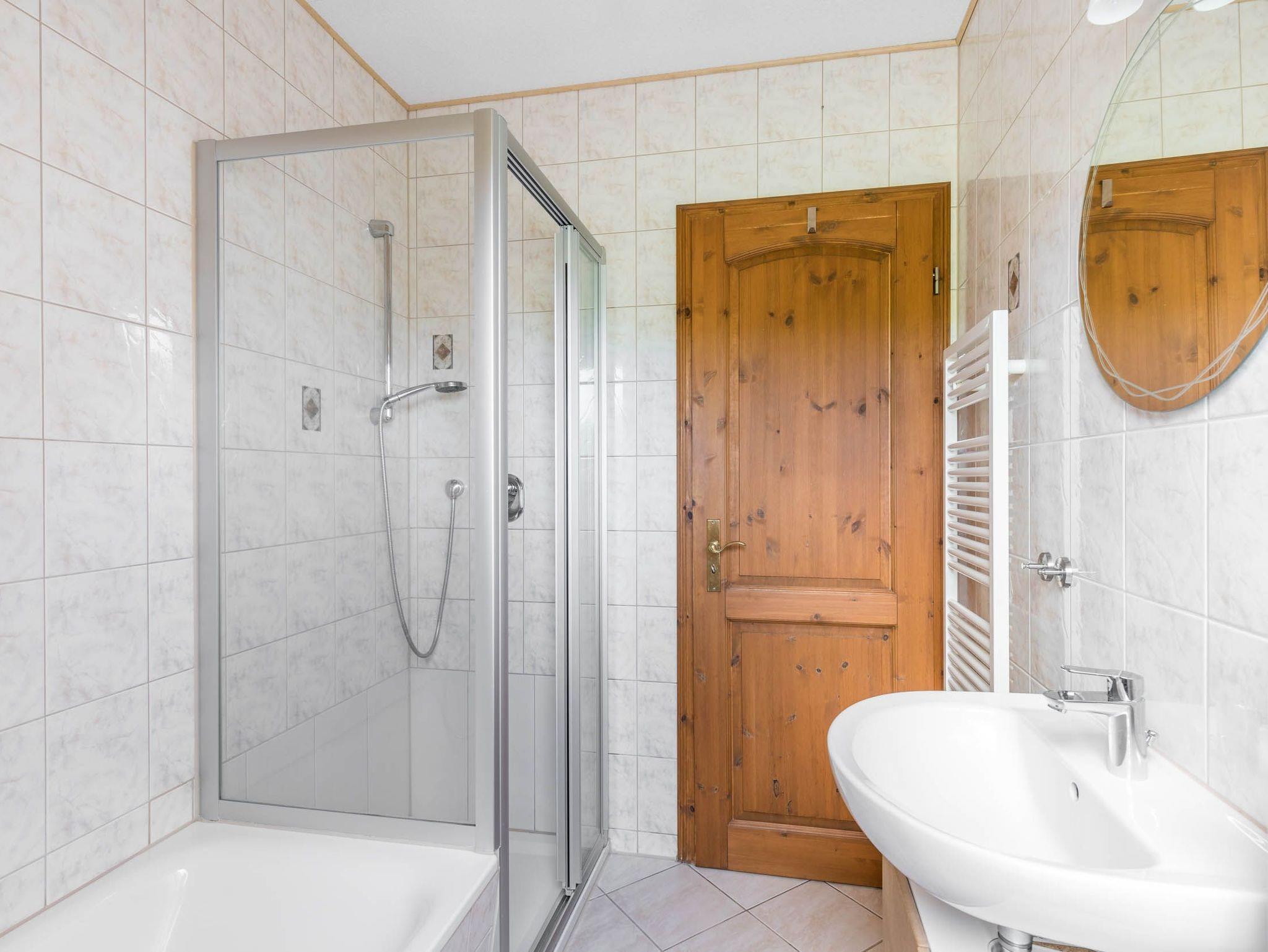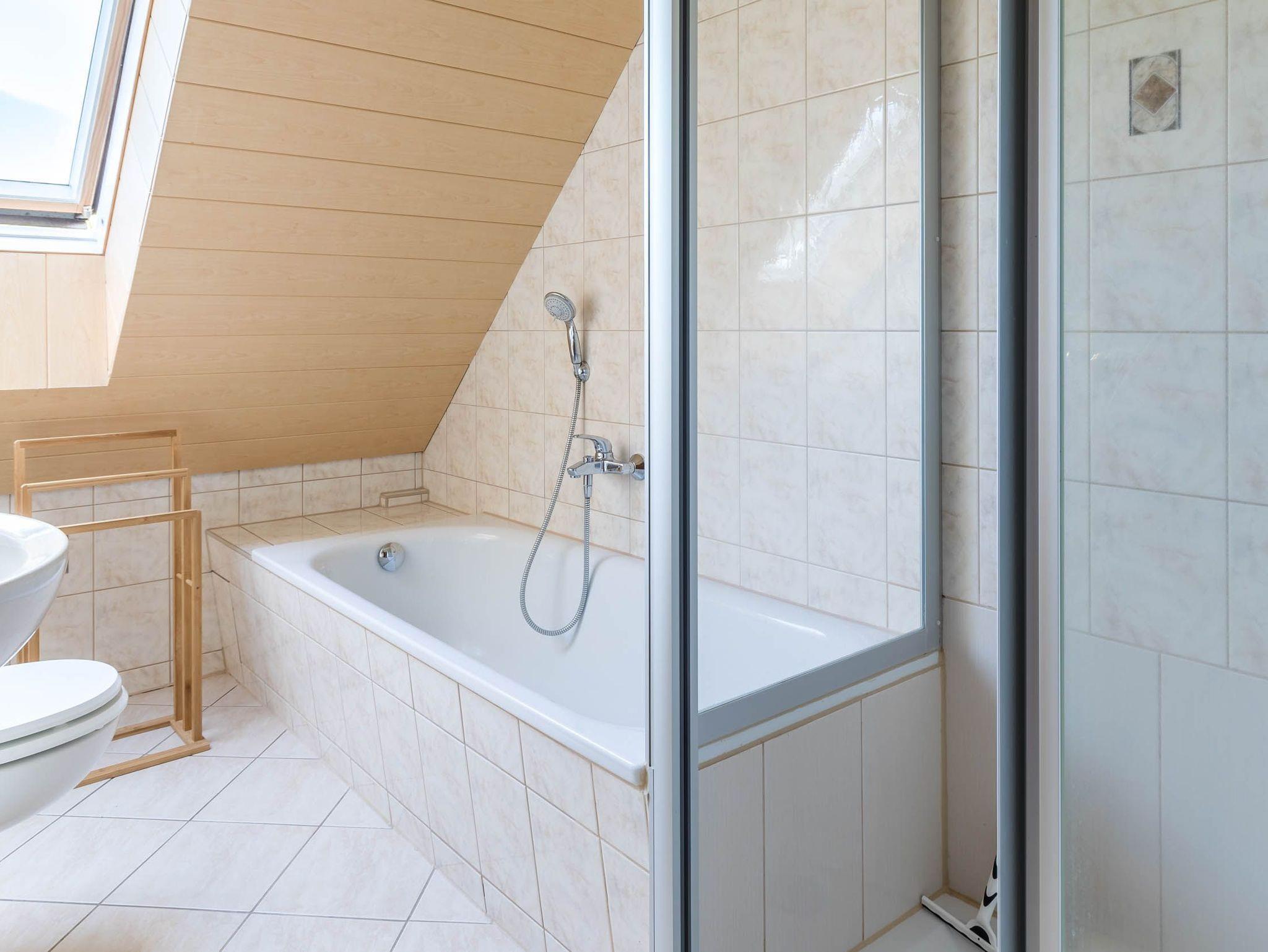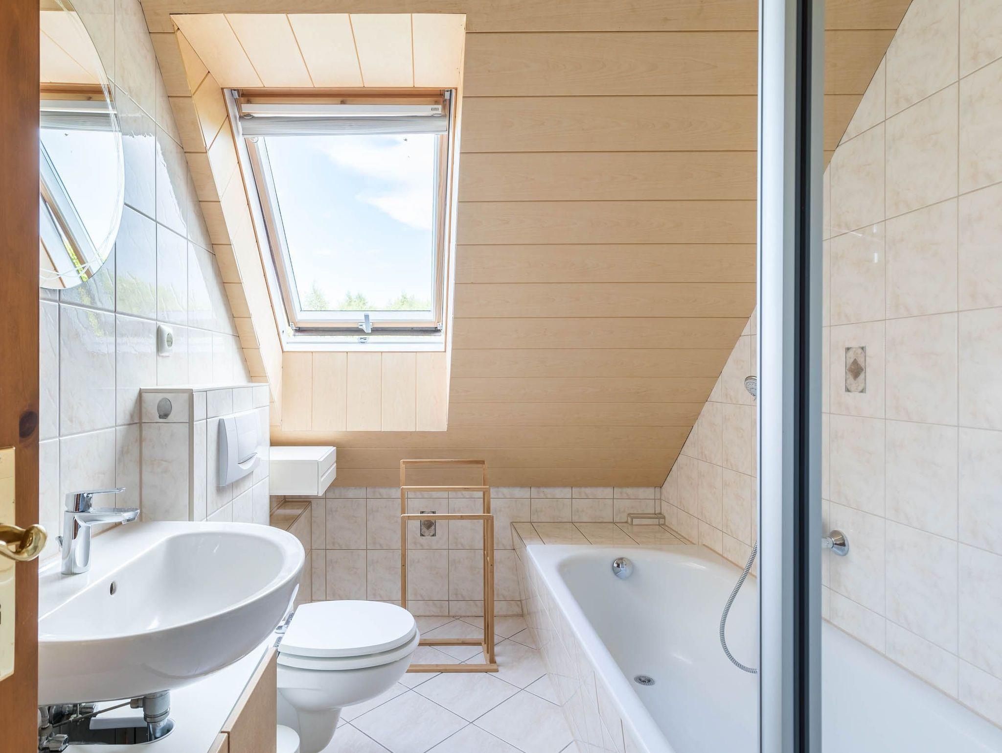 Das hellgeflieste Badezimmer mit Fenster befindet sich ebenfalls hier im Obergeschoss und bietet Badewanne, Dusche, WC. Auch eine Handtuchheizung ist hier vorhanden.