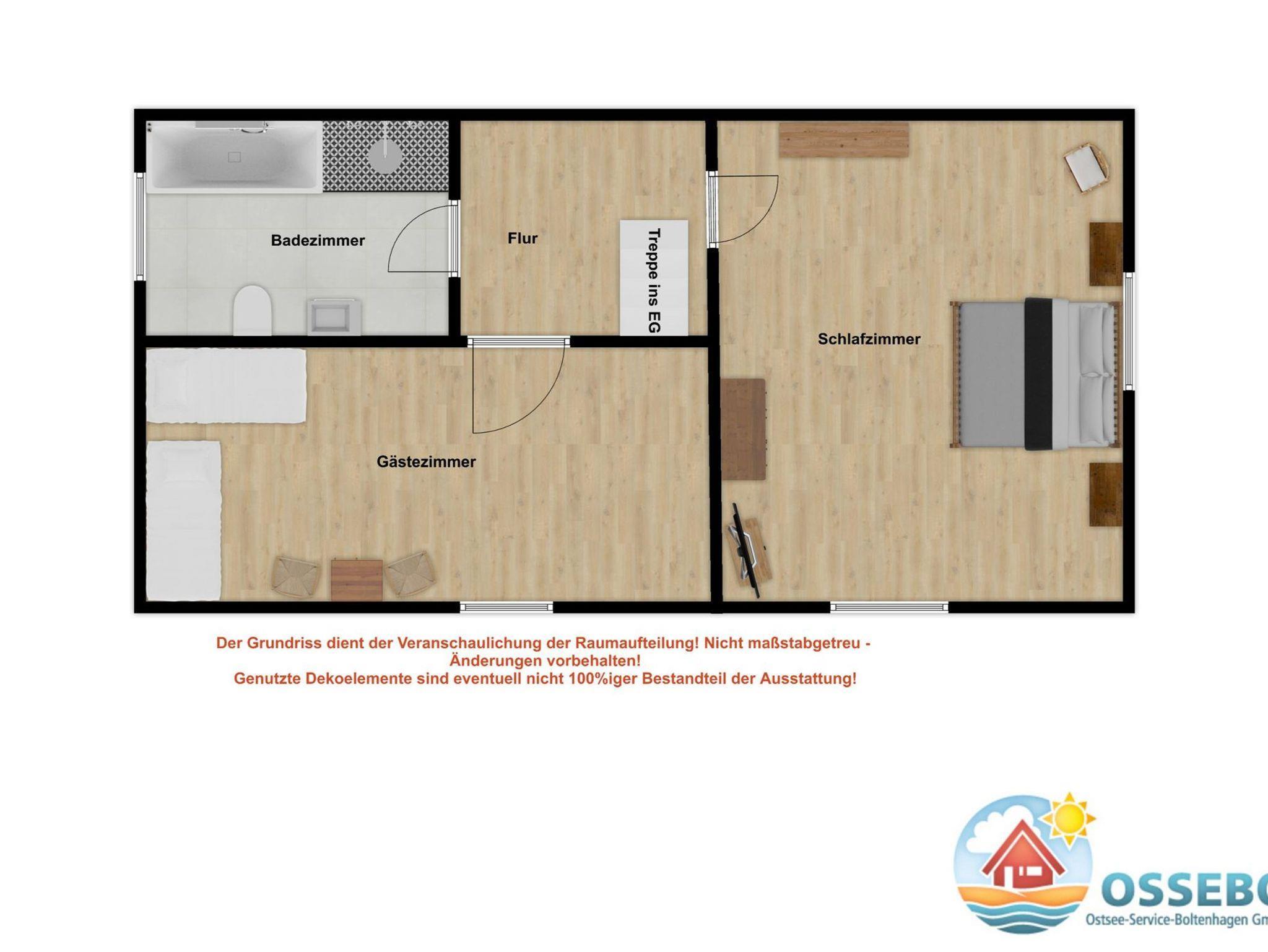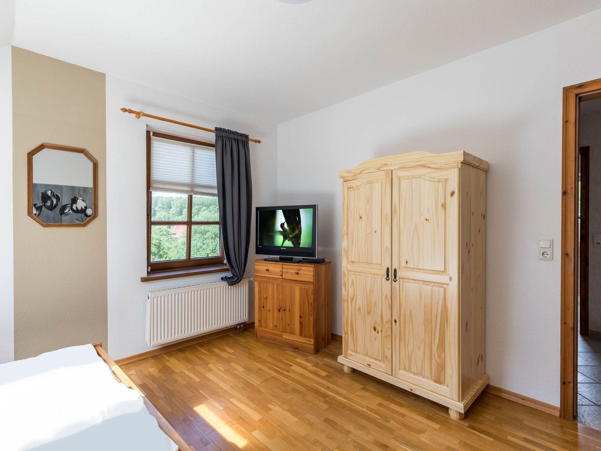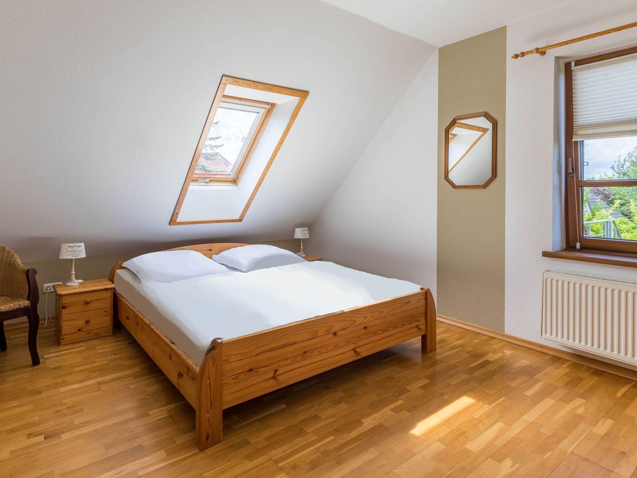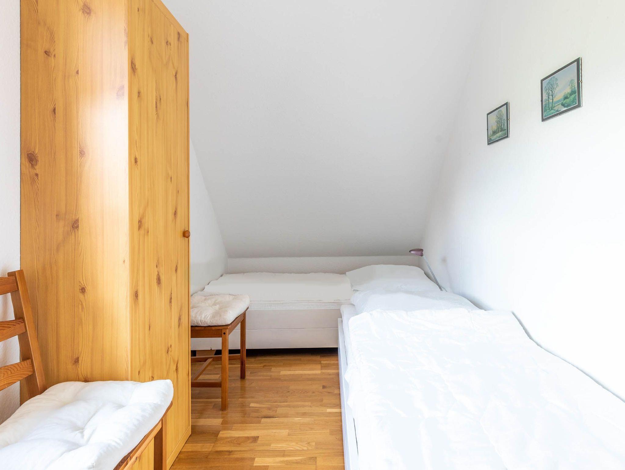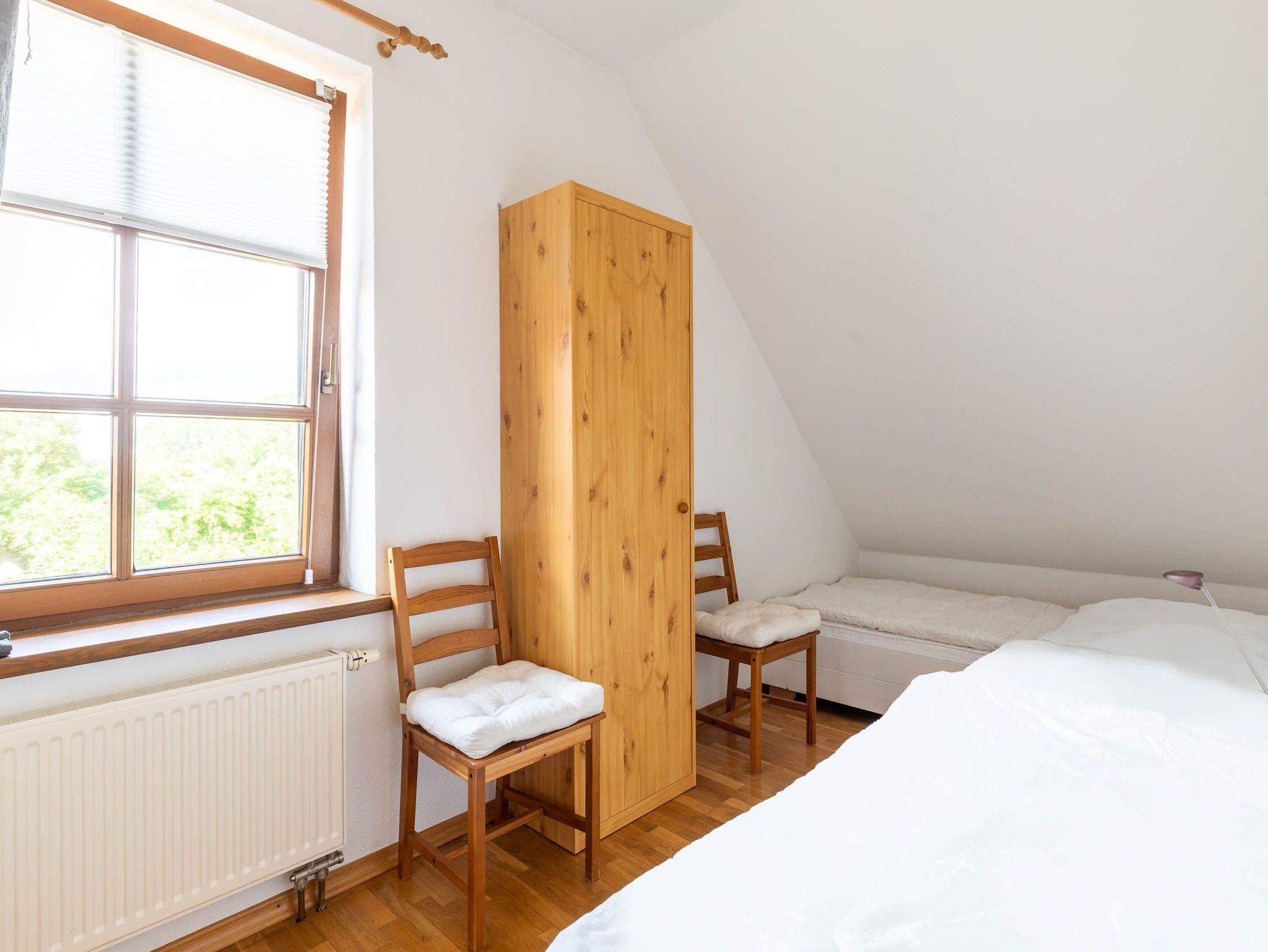 In der zweiten Wohnebene, welche Sie über eine Treppe vom Flur aus erreichen, sind zwei separate Schlafräume für Sie, liebe Gäste, eingerichtet. Während das Schlafzimmer mit einem Doppelbett, Kommode und einem Kleiderschrank für Ihre Urlaubsgarderobe sowie SAT-TV aufwartet, finden Sie im Kinder-/ Gästezimmer 2 Einzelbetten und einen 1trg. Kleiderschrank als Ablagemöglichkeit.