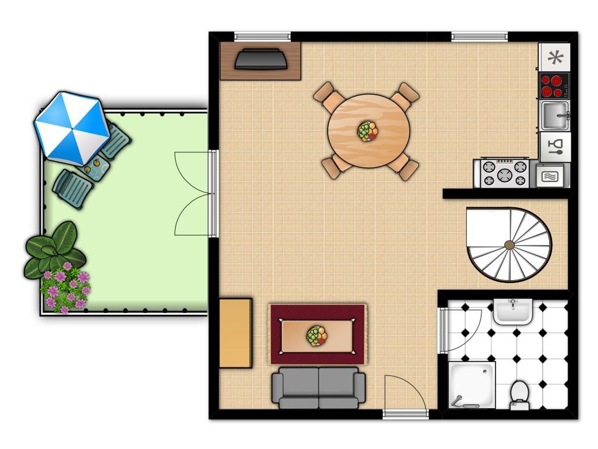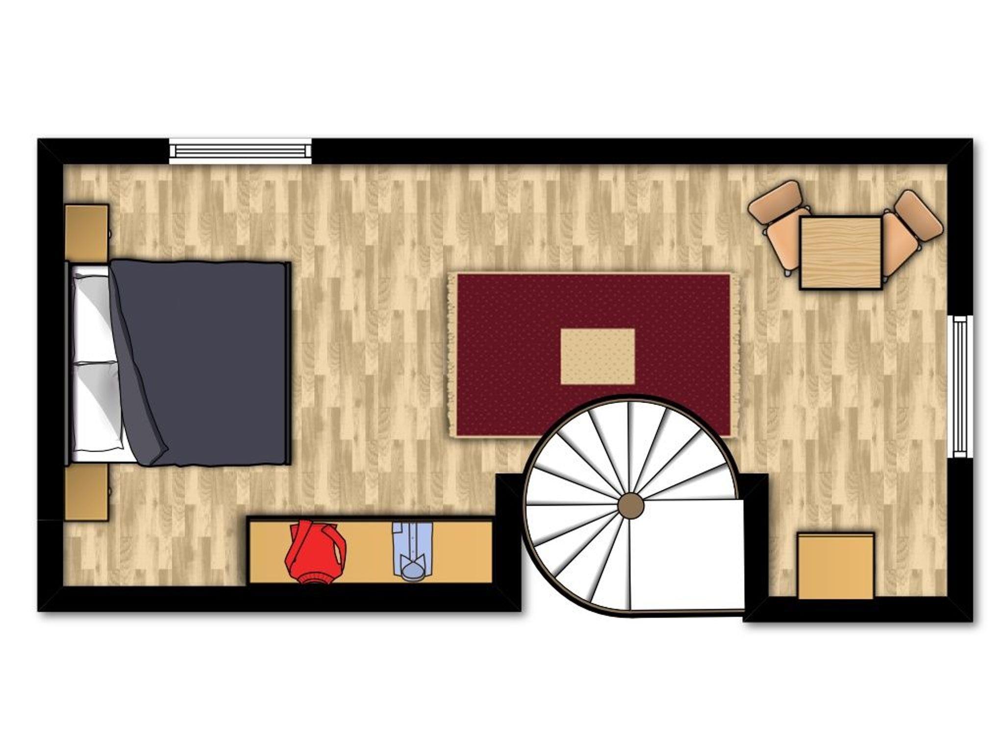 Eine offene Holztreppe führt vom Küchenbereich hinauf in die 2. Wohnebene (DG). Hier ist eine offene Schlafgalerie mit einem bequemem Doppelbett, einer kleinen Sitzecke, Ablagemöglichkeiten und Standspiegel eingerichtet.