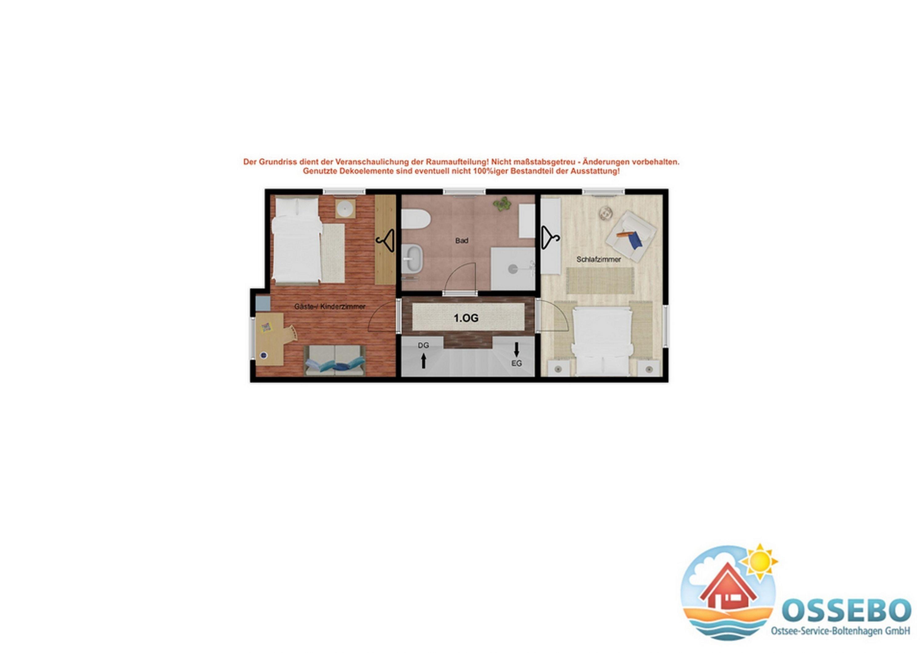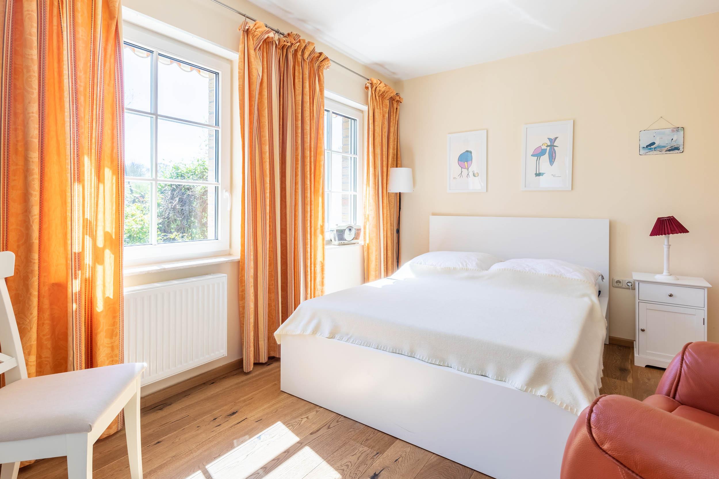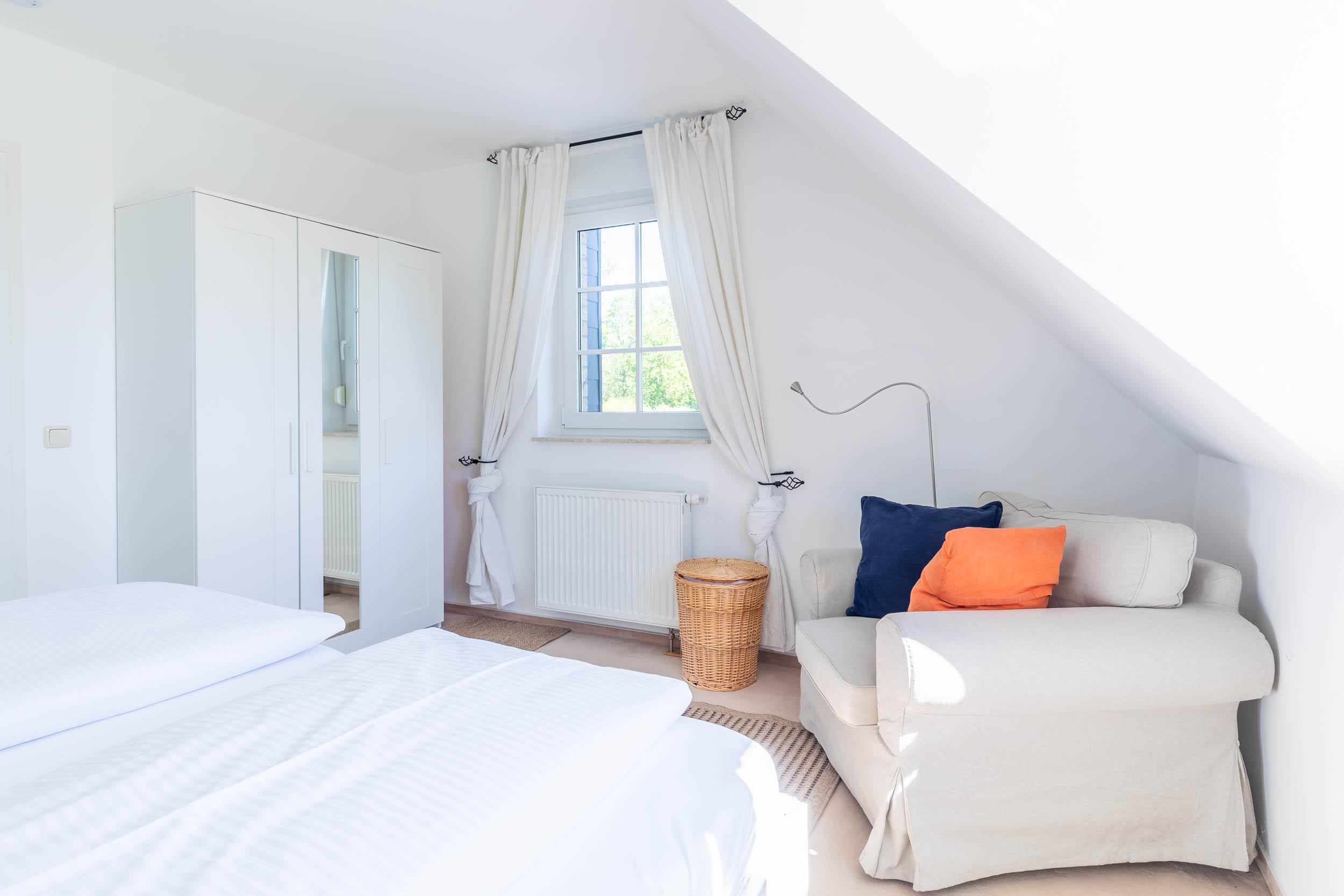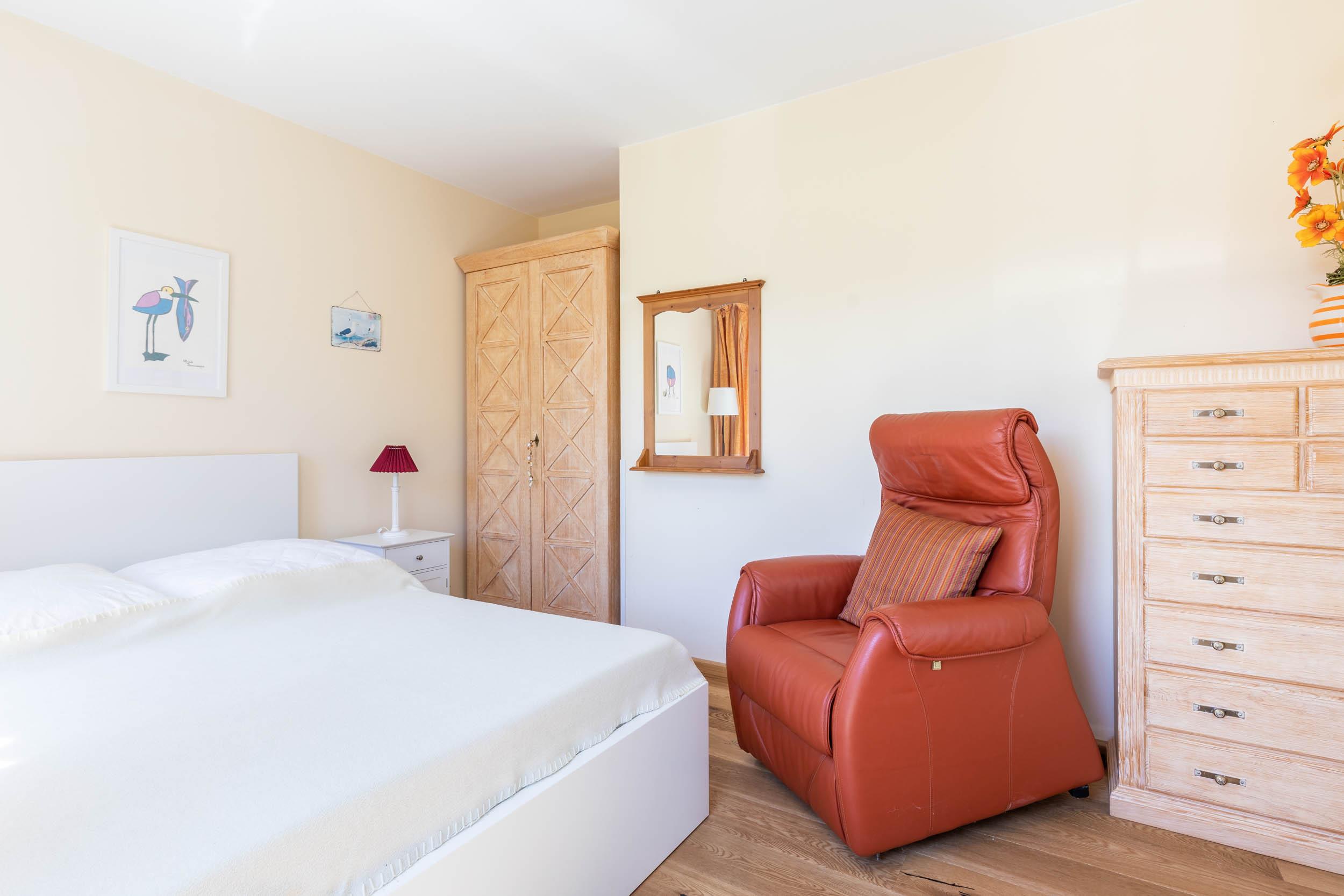 Im 1. Obergeschoss finden Sie zwei weitere Schlafräume mit jeweils einem Doppelbett (1 x 155x200cm sowie 1 x 180x200cm), Kleiderschrank und Sitzmöbel. Weiterhin befindet sich in einem dieser Schlafräume ein Schreibtisch.