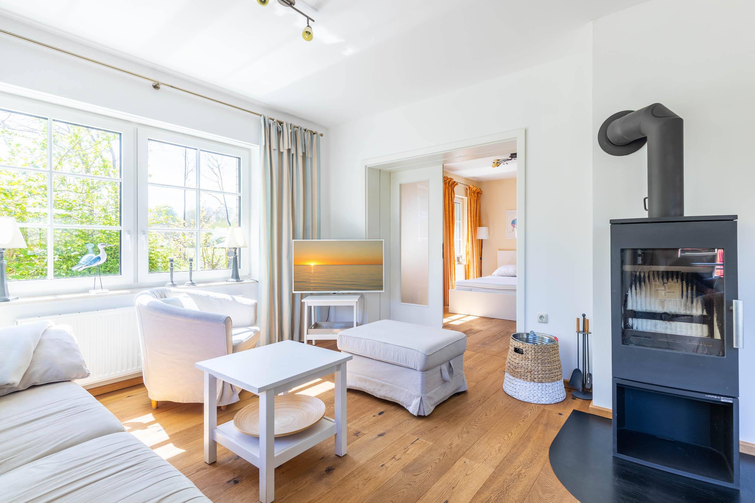 Im Erdgeschoss befindet sich das Wohnzimmer mit einem angebundenen Küchen- und Essbereich. Der lichtdurchflutete Wohnraum lädt mit einer gemütlichen Sofaecke und passenden Sesseln zum Verweilen ein. Für zusätzliche Wohlfühlatmosphäre sorgt ein Kamin, der neben wohliger Wärme eine romantische Stimmung zaubert. Wer Unterhaltung wünscht, dem steht ein SAT-TV zur Verfügung. Am geräumigen Esstisch zum Ausziehen können alle Gäste Platz nehmen und gemeinsam essen.