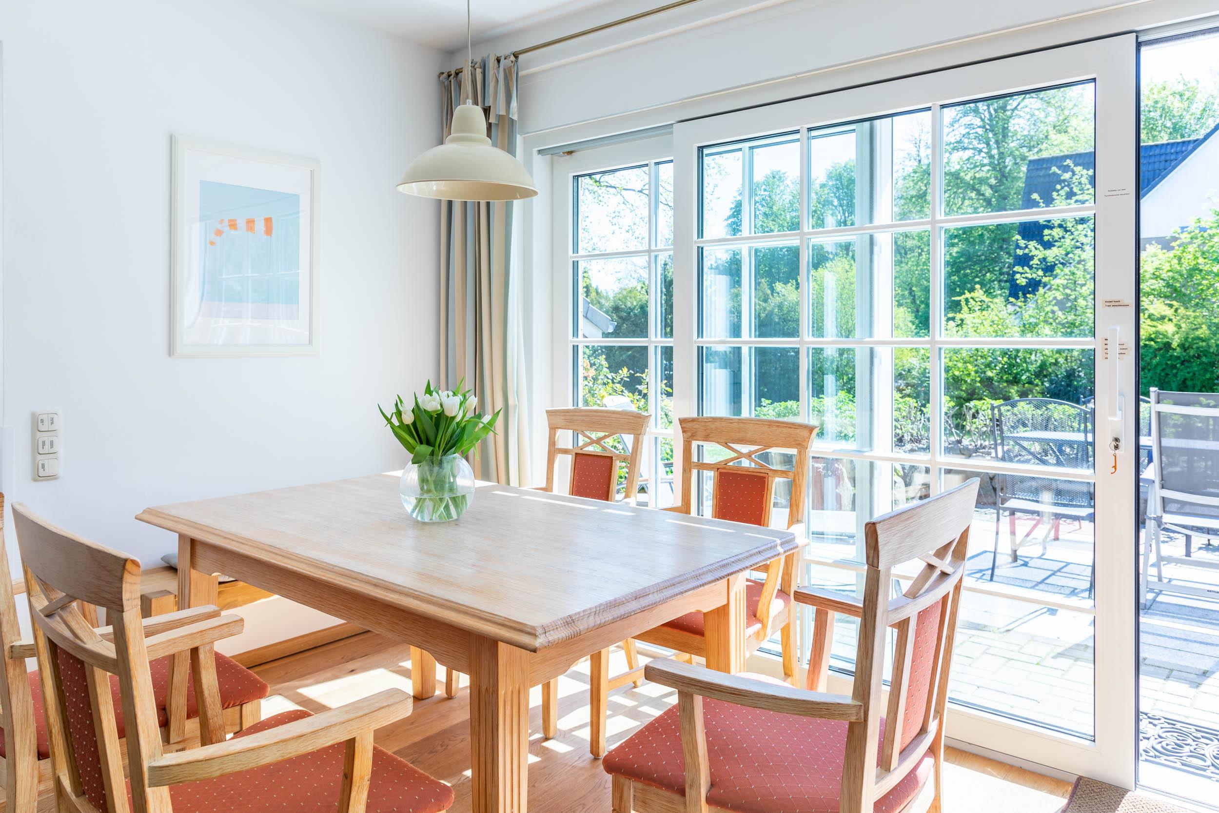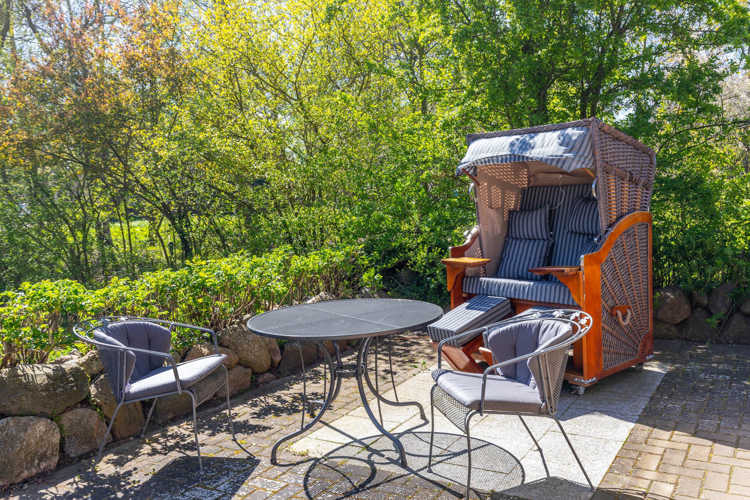 Durch die breite Terrassenschiebetür gelangen Sie direkt auf die großzügige Südost-Terrasse mit Gartenmöbeln und Strandkorb, hier kann man einfach mal einen Moment der Ruhe genießen.
