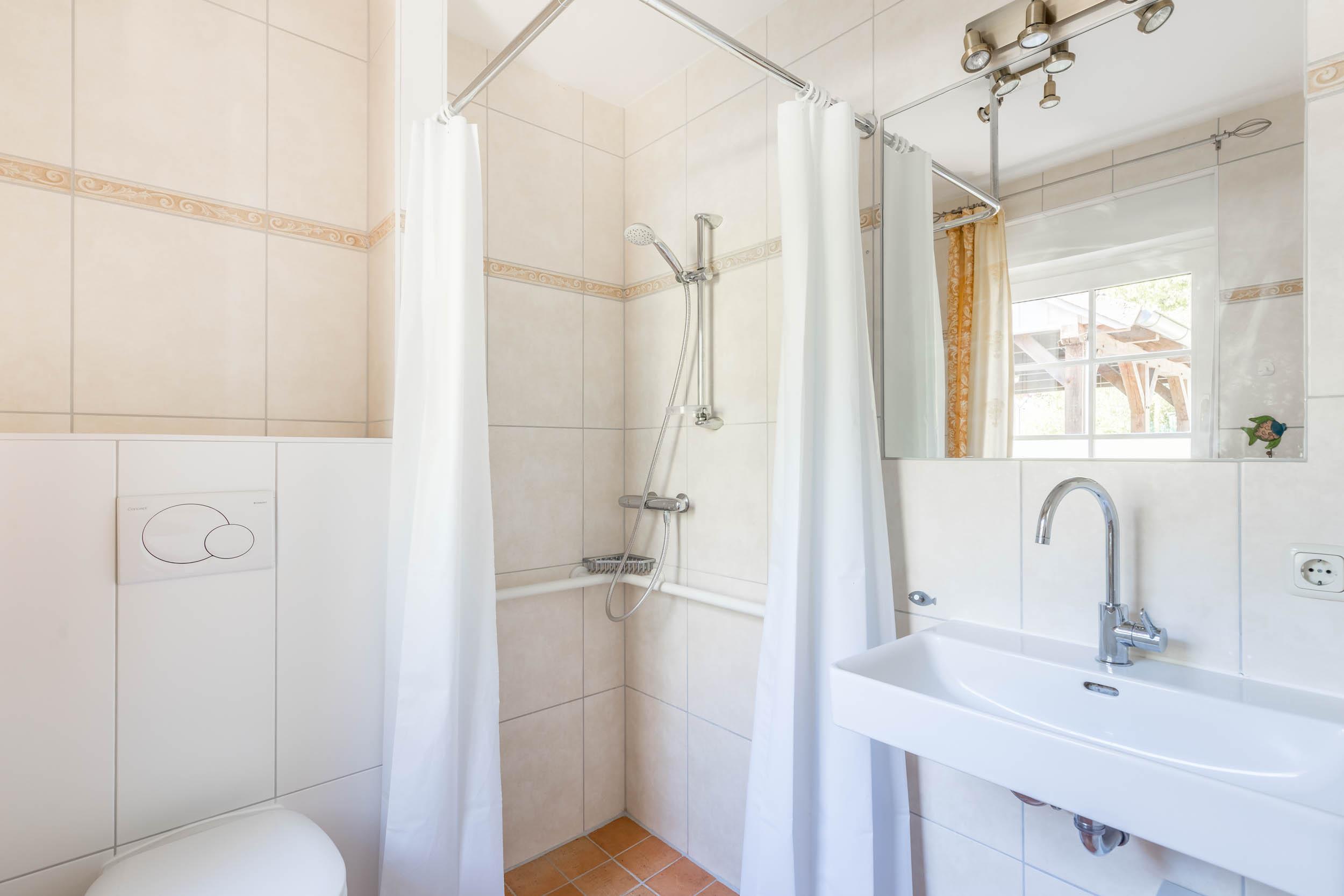 Auf dieser Etage befindet sich das zweite, etwas größere Badezimmer, welches ebenfalls mit Dusche und WC ausgestattet ist. Ebenso wie im Erdgeschoss gibt es auch in diesem Bad ein Fenster.