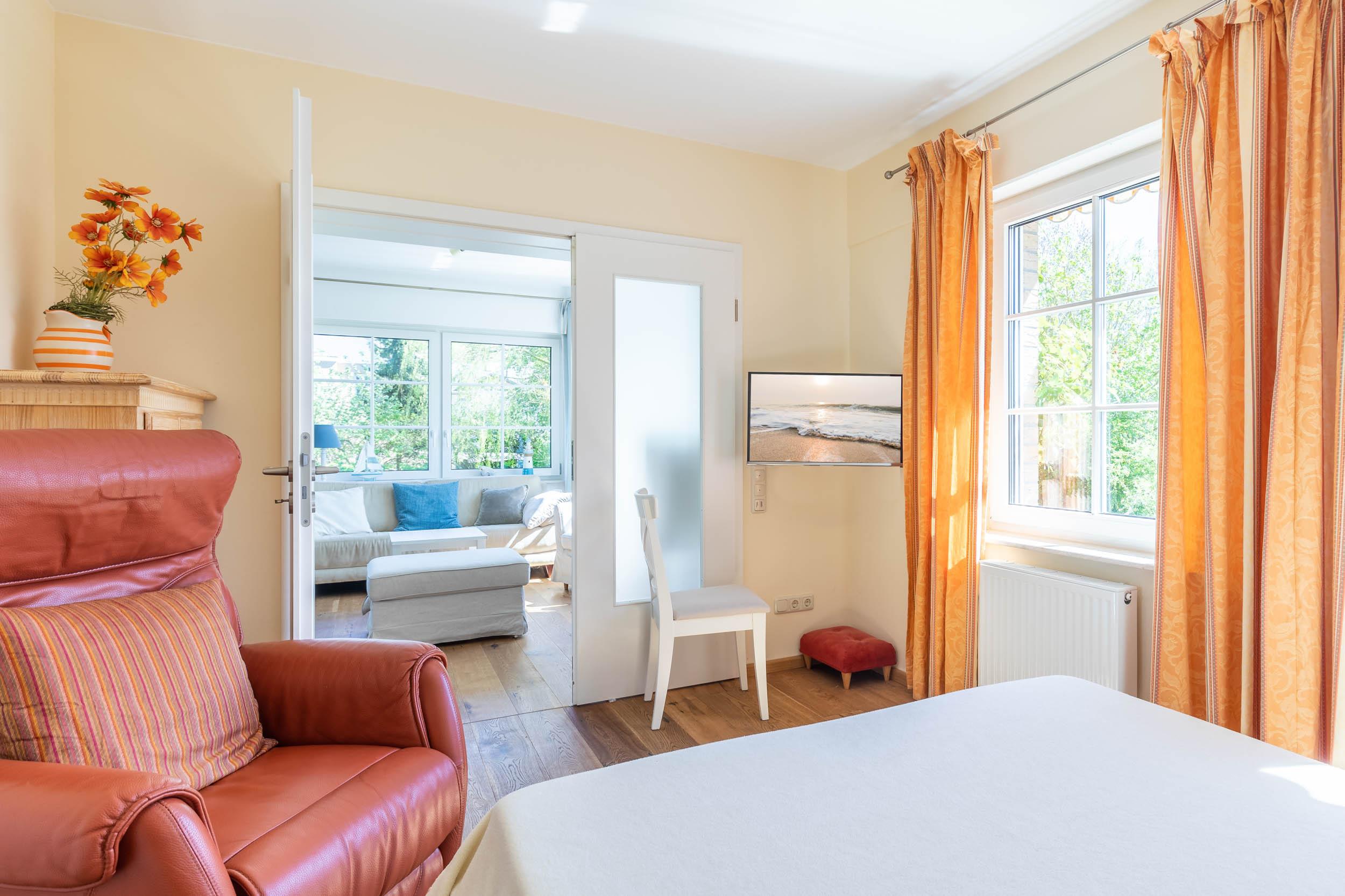 Durch die ideale Raumaufteilung im Erdgeschoss hat neben dem Wohn- und Essbereich auch ein Schlafraum mit einem französischen Doppelbett (140x200cm), SAT-TV, Kleiderschrank und Kommode einen Platz gefunden.